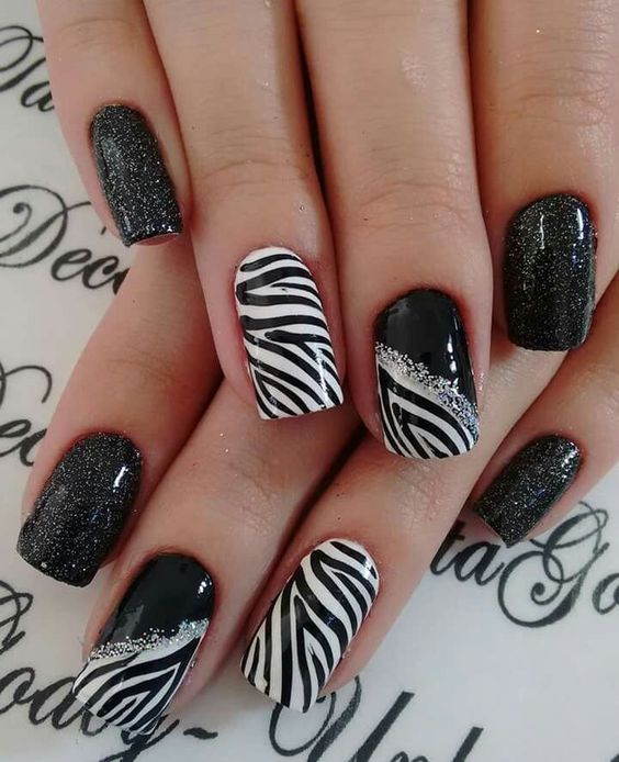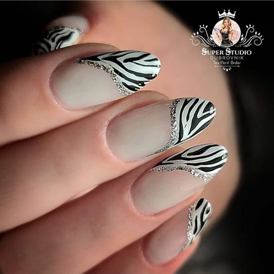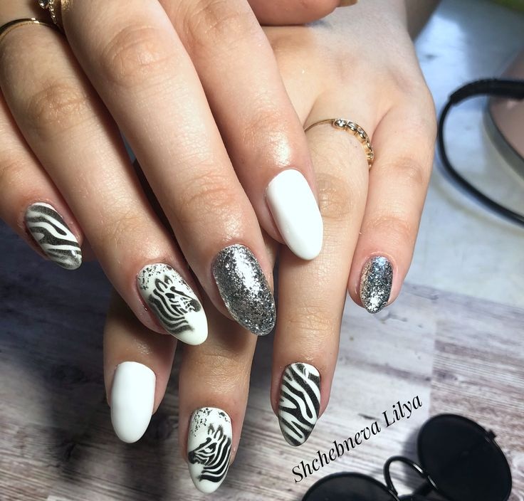 Маникюр зебра с блестящим декором — это эффектный и стильный вид ногтевого дизайна. Он создается с использованием черно-белых полосок, напоминающих узор зебры, в сочетании с блестящими элементами. Черные полоски наносятся на белый фон ногтя, имитируя узор зебры, а блестки или стразы используются для добавления дополнительного сияния и эффекта. Этот дизайн подходит для любого повода и может быть выполнен в различных вариациях, включая зебру с золотыми или серебряными блестками, а также с использованием разных форм и длин ногтей.