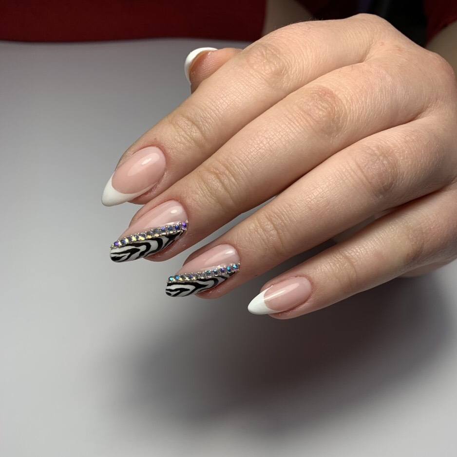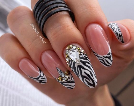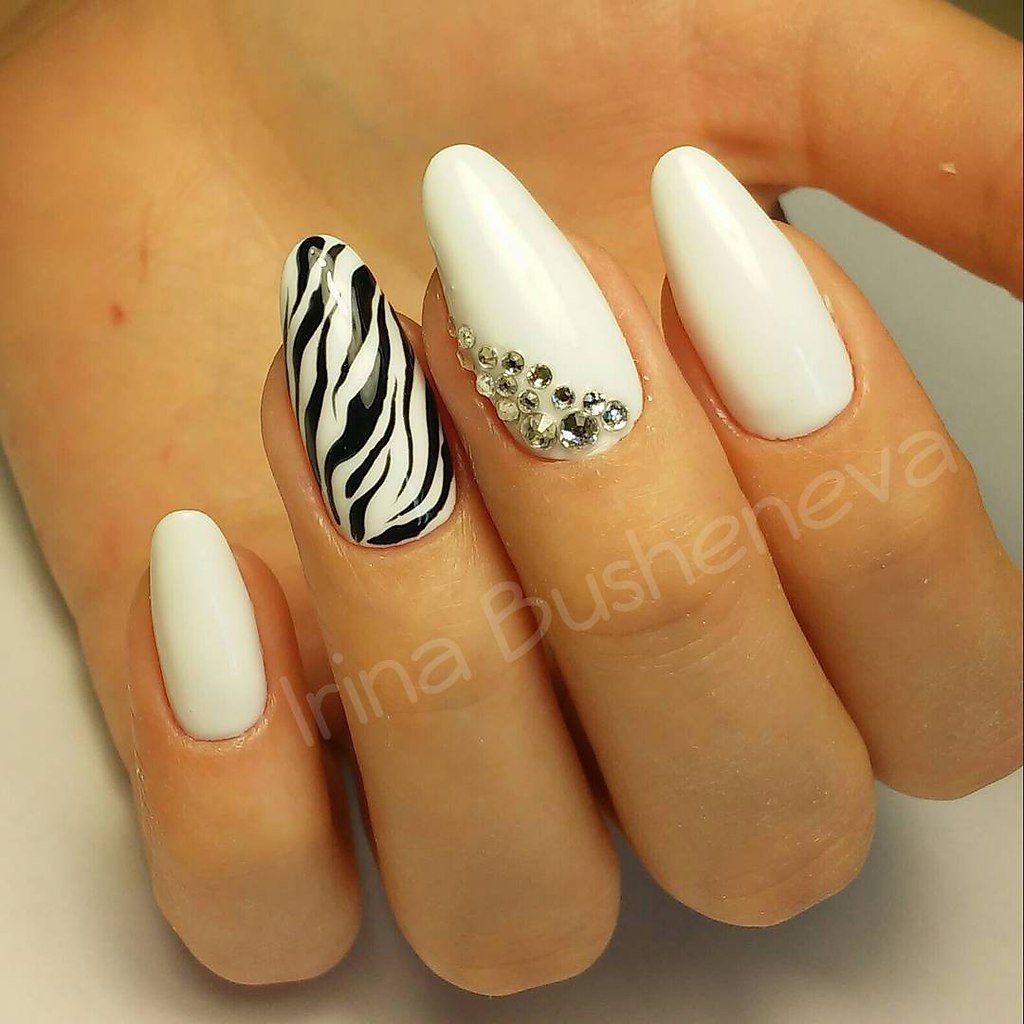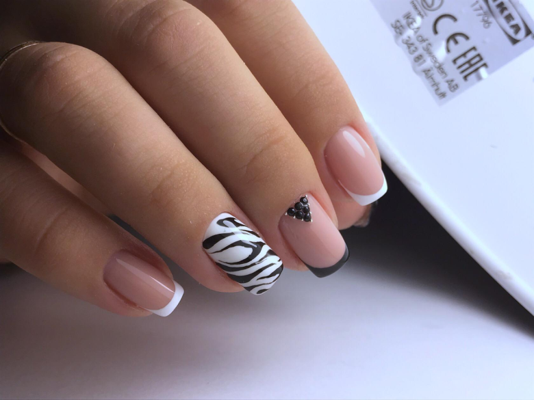 Стразы и принт зебры, казалось бы — довольно странное сочетание. Тем не менее, оно имеет место быть. Например, при создании праздничного дизайна. Только не усердствуйте. Слишком много камней сделают ваш маникюр слишком ярким и чрезмерным. делайте аккуратные стильные акценты.