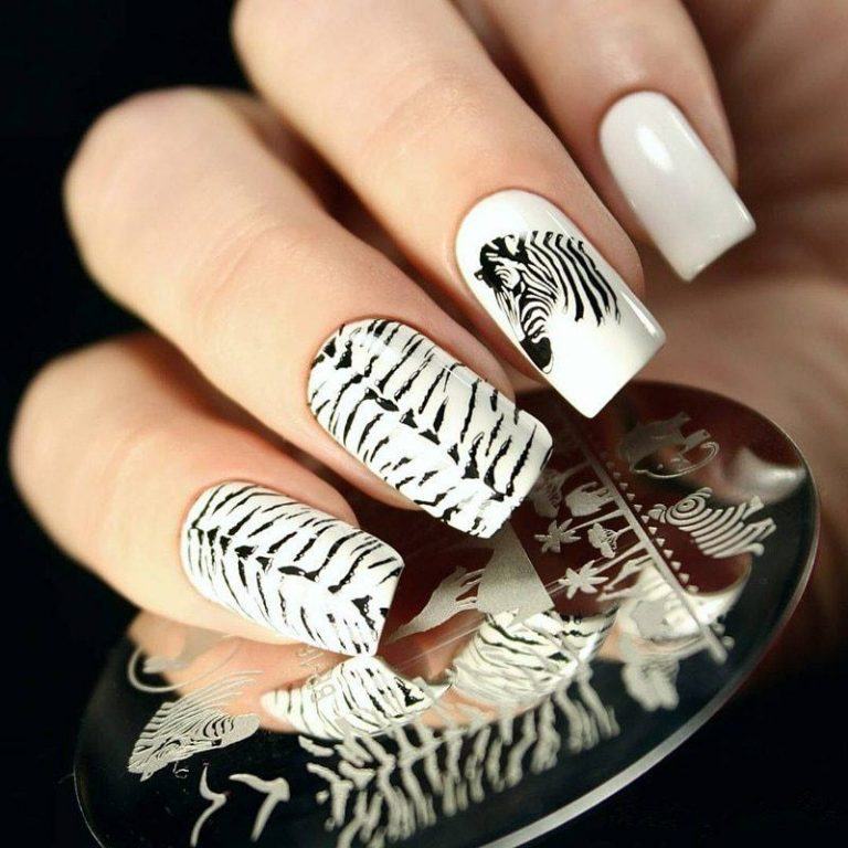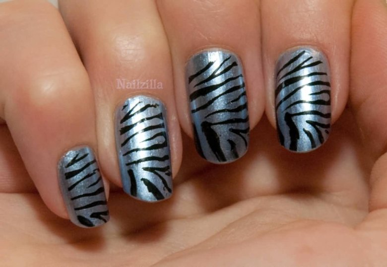 Мы уже отмечали, что сделать такой дизайн вы сможете и самостоятельно. Нарисовать полоски зебры можно с помощью иголки, дотса, водяным методом. Но самый простой и интересный — стемпинг. Как сделать зебровый маникюр с помощью силиконового штампа и металлической пластины с оттиском: