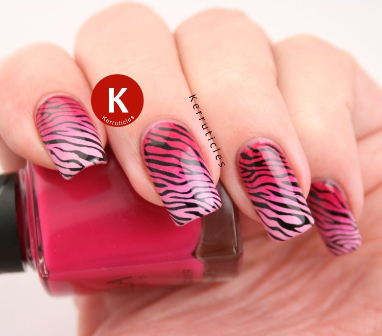 - Подготовка для стемпинга. Вам потребуется стемпинг-плитка с изображением «зебры» и специальный стемп для переноса маникюрных рисунков на ногти. Нанесите на плату специальный лак для стемпинга цветом, отличающимся от основного цвета ногтей (например, черным на белых ногтях или белым на черных ногтях). Затем удалите лишний лак с платы с помощью скребка, оставляя только лак в узоре зебры.