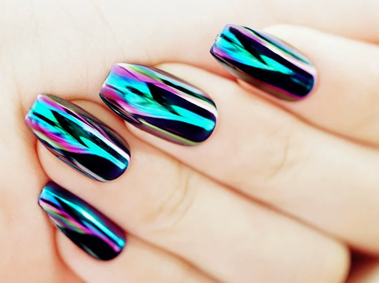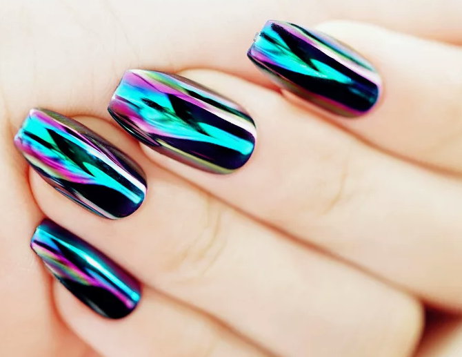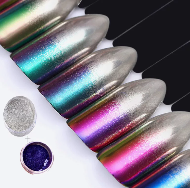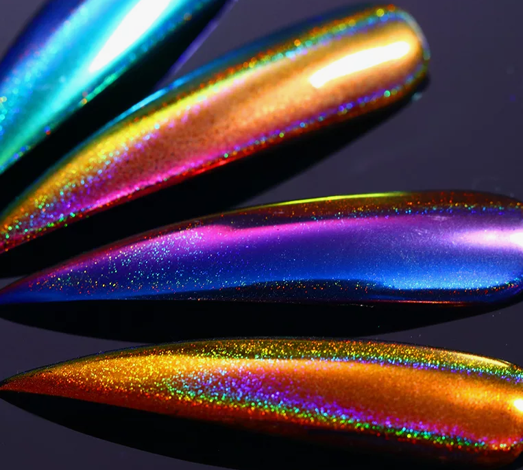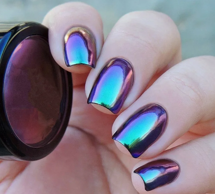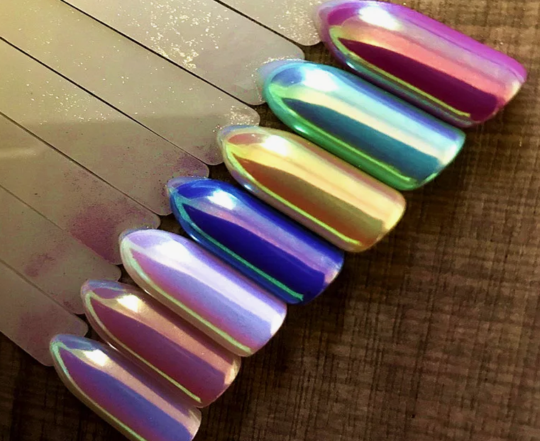 В этом и предстоящем сезоне большую популярность получили пигменты, известные как «хамелеоны». Эти специальные порошки наносятся на зеркальную поверхность и создают эффект двойного перелива, который меняет свой цвет в зависимости от угла обзора. На сегодняшний день на рынке представлен огромный ассортимент таких пигментов, каждый из которых отличается уникальным цветовым переливом.
