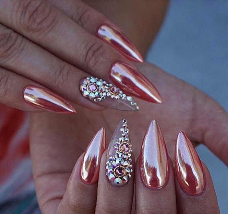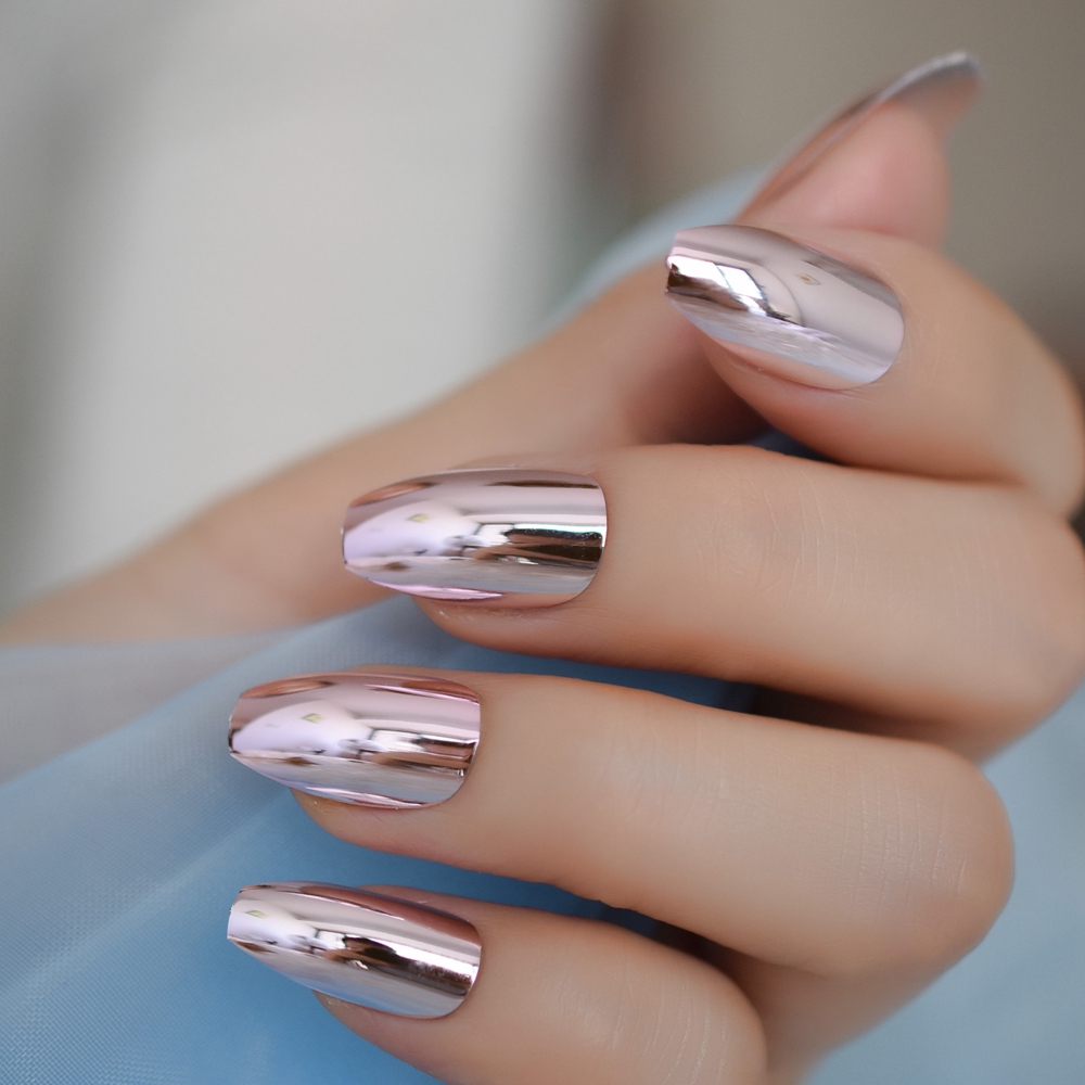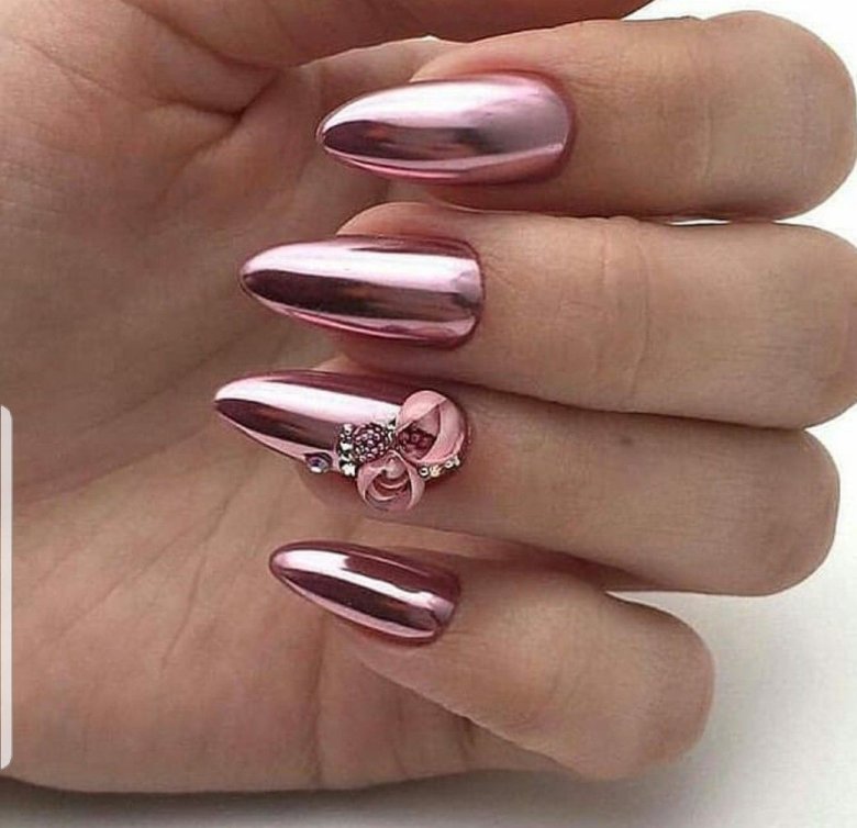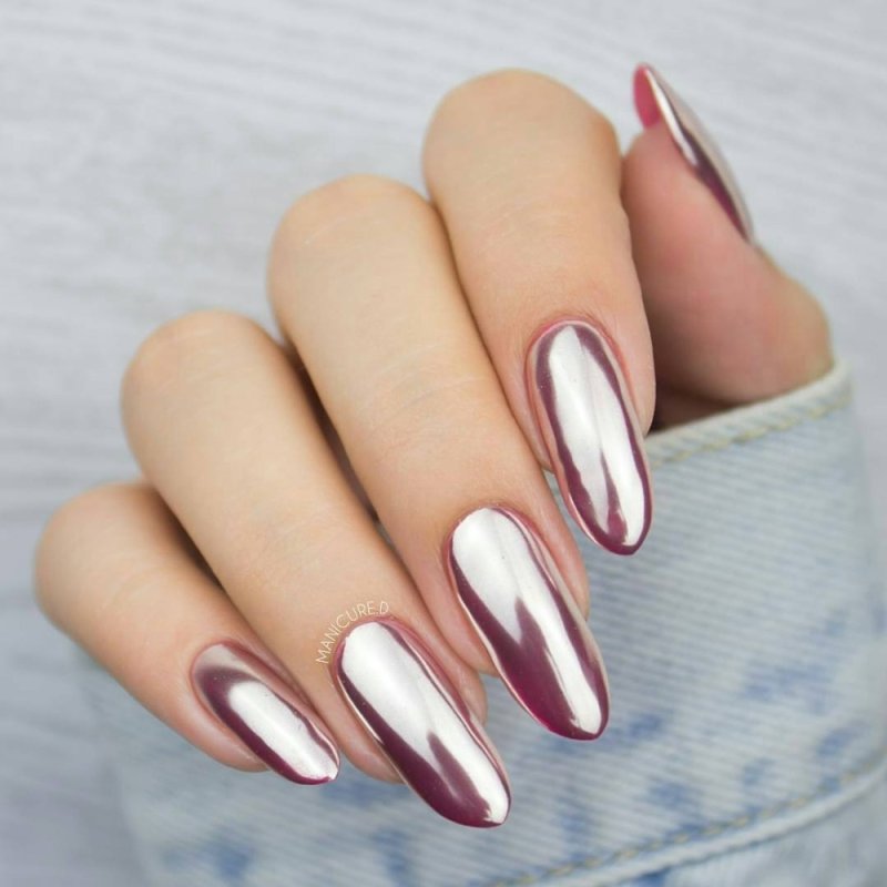 Часто женщины выбирают зеркальный маникюр с эффектом «металлик», чтобы создать оригинальный образ. Основная изюминка этого стиля заключается в том, что покрытие на ногтях напоминает гладкое зеркало и блестящий металл одновременно. При выборе этого дизайна следует учитывать длину ногтевой пластины: для коротких ногтей рекомендуется использовать светлые оттенки, а для длинных — более яркие и насыщенные цвета.
