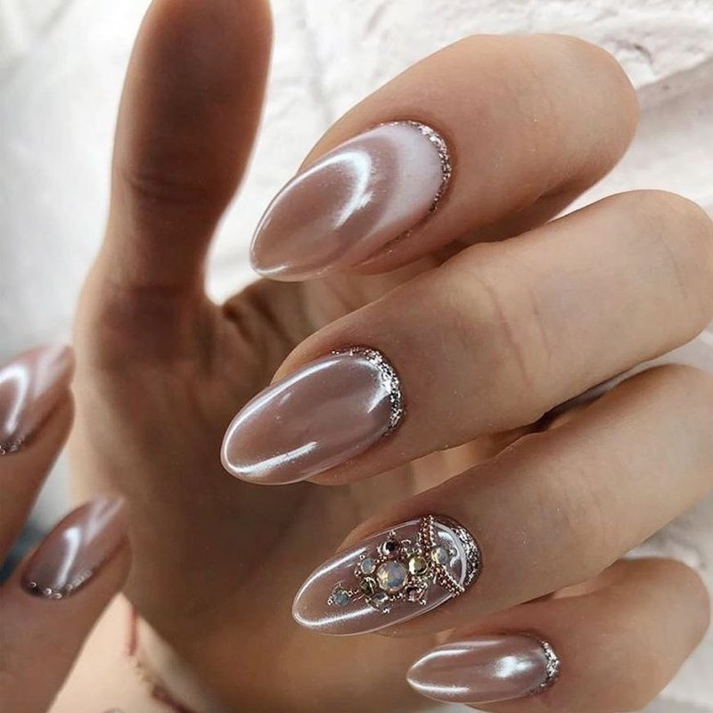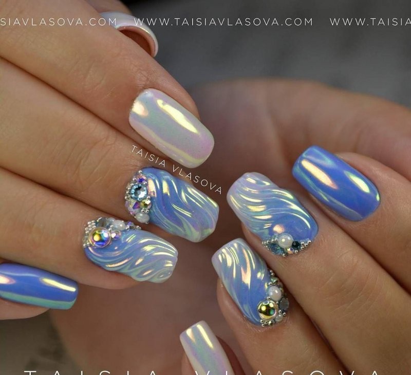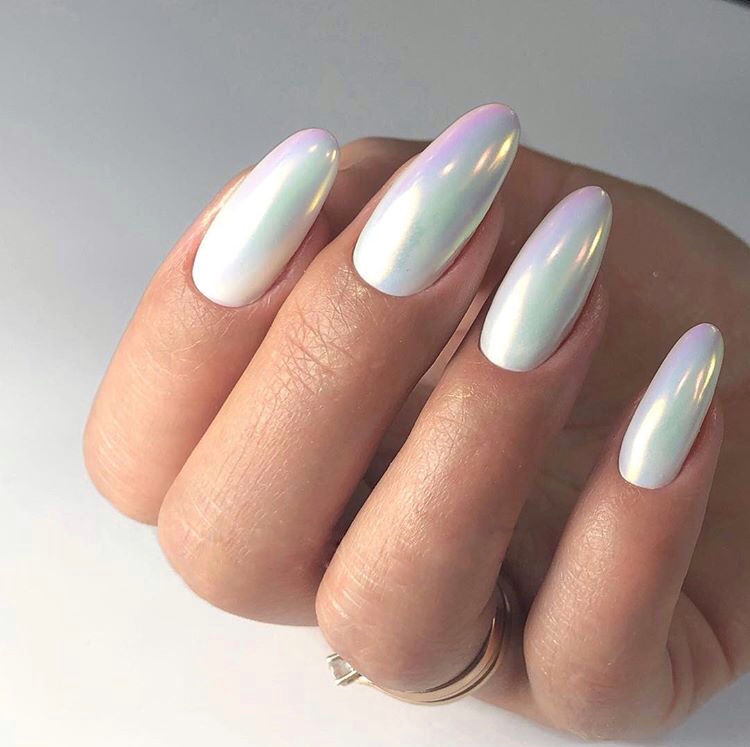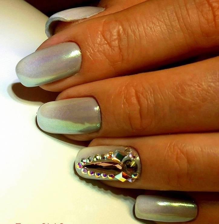 Зеркальный нейл-арт с втиркой жемчужины считается настоящим произведением искусства. Этот стиль наполняет образ девушки нежностью и романтизмом, поэтому он часто выбирается невестами. Благородное сияние и мягкий перелив красок прекрасно смотрятся на руке и оригинально подчеркивают форму и длину ногтей. Перламутровая вуаль делает маникюр шикарным и богатым, внося в него нотки волшебства.