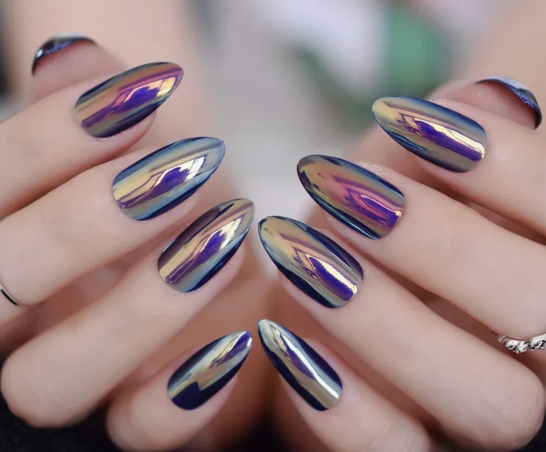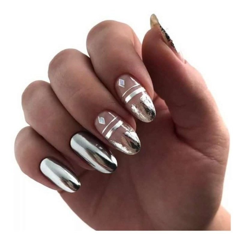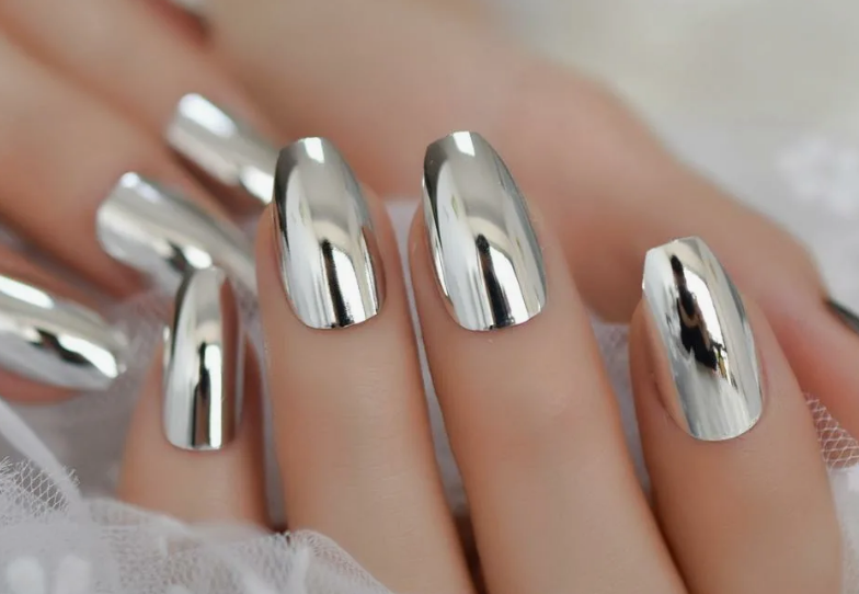 - металлический блеск: основная черта зеркального маникюра — это яркий и металлический блеск, который придает ногтям зеркальный вид, отражающий свет.