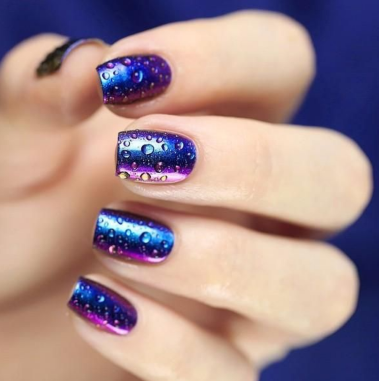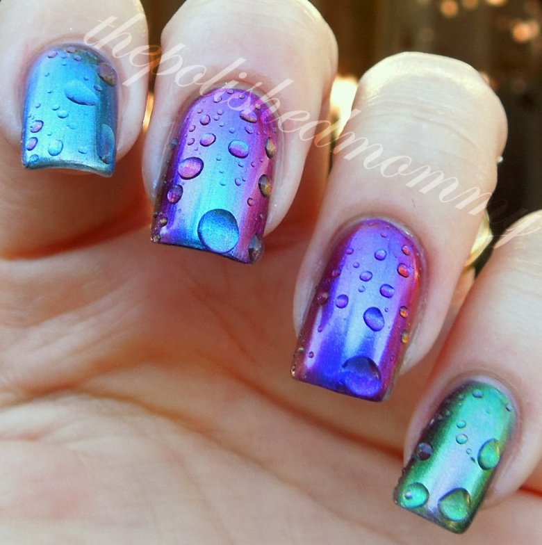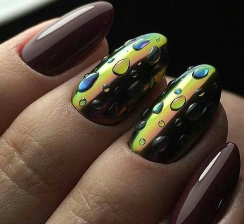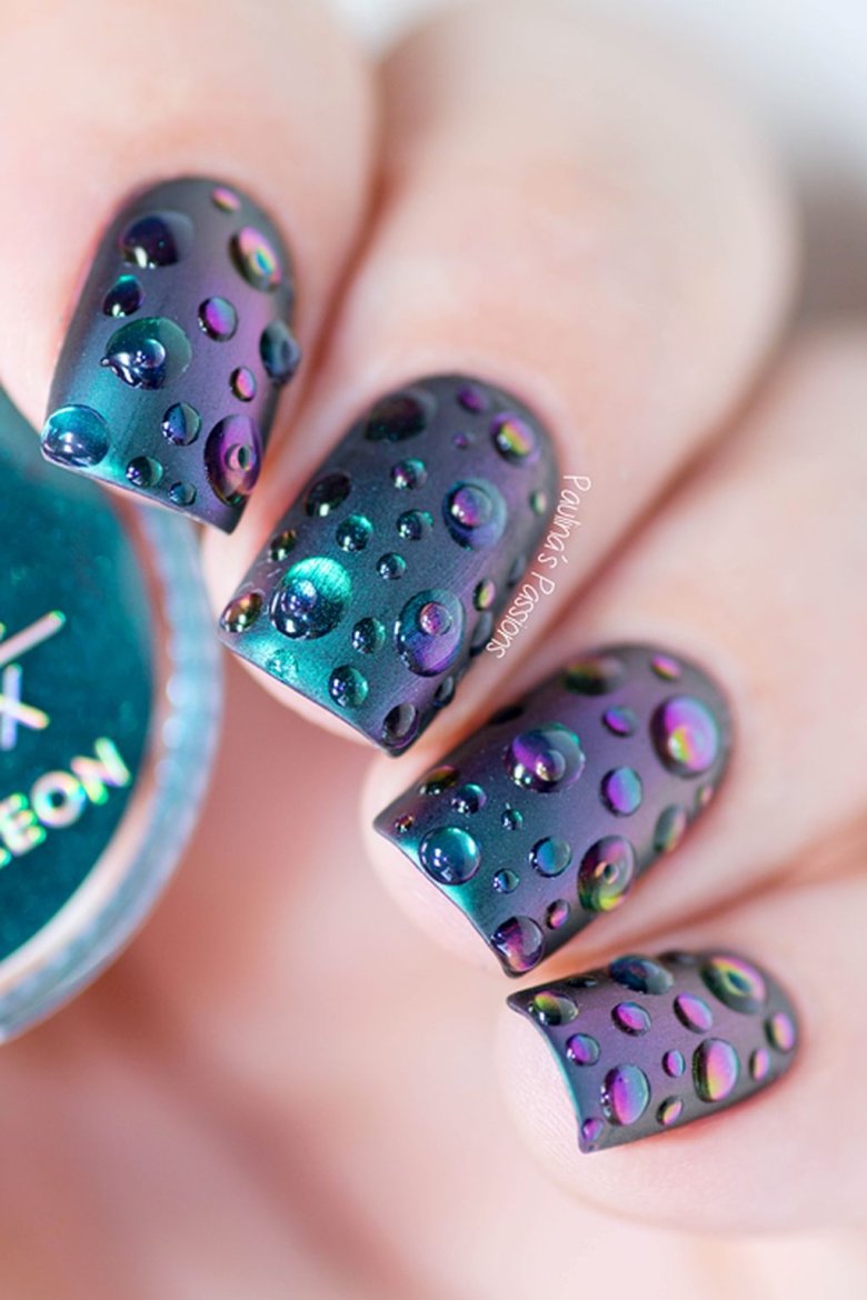 Интересный вариант дизайна, при котором на зеркальном покрытии размещают блестящие прозрачные капельки. Сделать их можно с помощью топового покрытия самостоятельно.