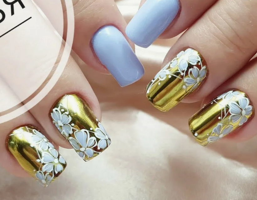 Для девушек с длинными ногтями доступны различные эксперименты с золотыми вензелями, блестками и леопардовым принтом. Особенно оригинально выглядит зеркальный маникюр, включающий комбинацию синего и белого цветов, а также обрамление золотыми полосками и стразами, придающее ногтям изысканный и элегантный вид.