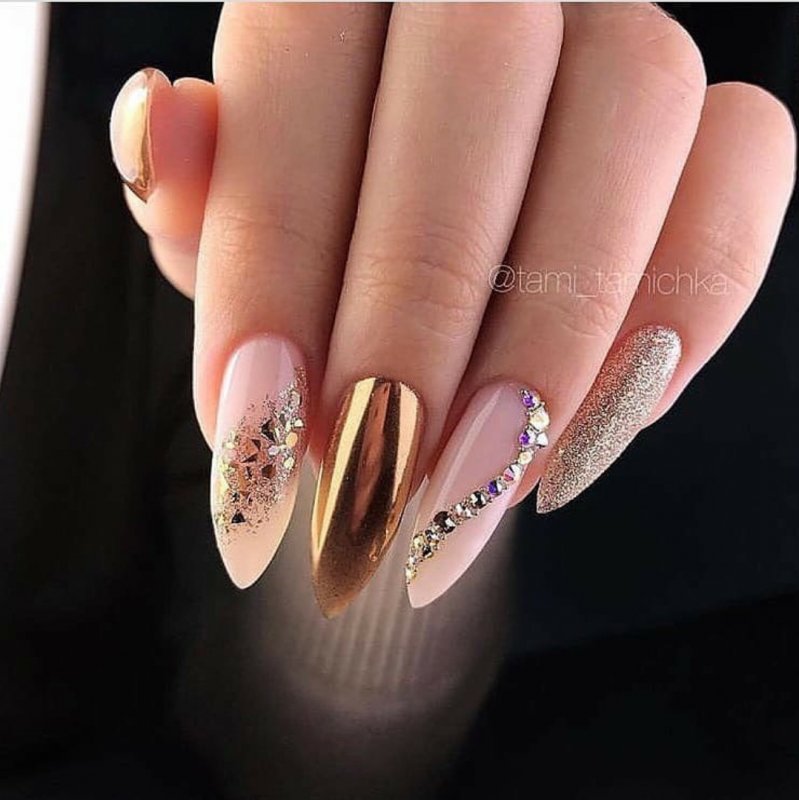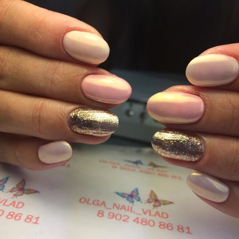 Для обладательниц коротких ногтей идеальным выбором станет зеркальный маникюр с золотистыми ажурными узорами или треугольным френчем. Сегодня особую популярность приобретают золотистые полоски, точки и зигзаги, расположенные на одном из пальцев, что придает ногтям стильный и изысканный вид. При выборе восточной стилистики рекомендуется отдавать предпочтение черному и розовому цветам, окрашивая пластинку до половины и дополняя зеркальной полоской из золота.