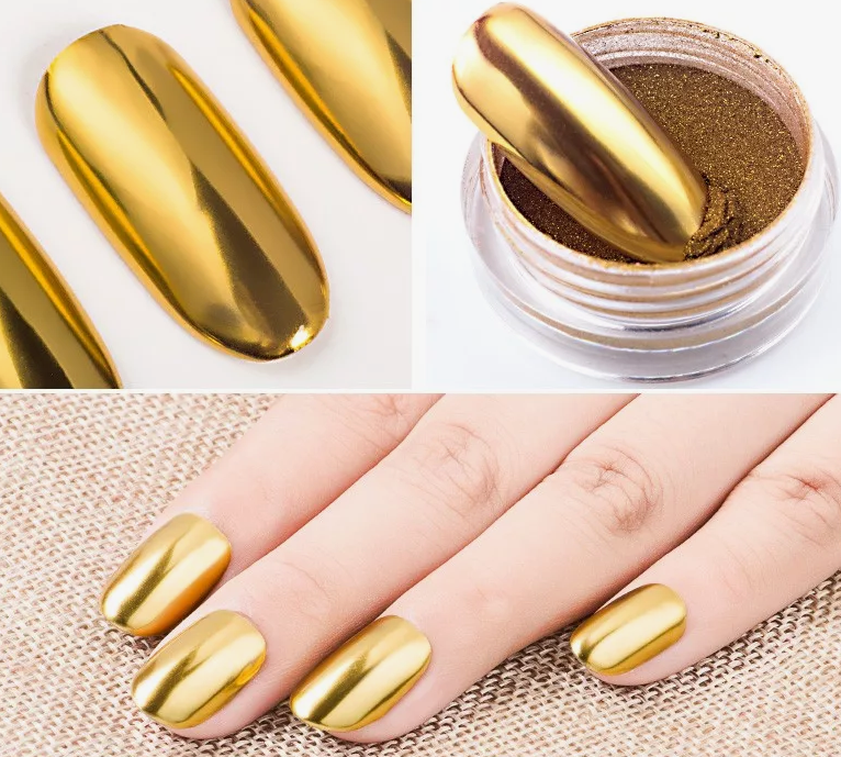Совет: для получения максимального эффекта рекомендуется использовать пудру с мельчайшими частичками, так как она ложится на поверхность плотнее и создает более яркий блеск. В создании металлического эффекта чаще всего применяют оттенки бордового, синего, розового, серебряного, бронзового и золотого. В следующем сезоне также будут актуальны цвета драгоценных камней, такие как аквамарин, изумруд и рубин.