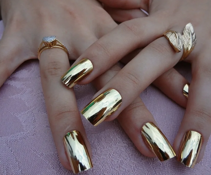 - процесс нанесения: для создания зеркального маникюра сначала наносят базовое покрытие, затем слой гель-лака, а затем пудру хромированного эффекта или специальный гель-лак, который затем полимеризуется под УФ- или LED-лампой. В завершение наносится топ-покрытие для защиты и придания блеска.