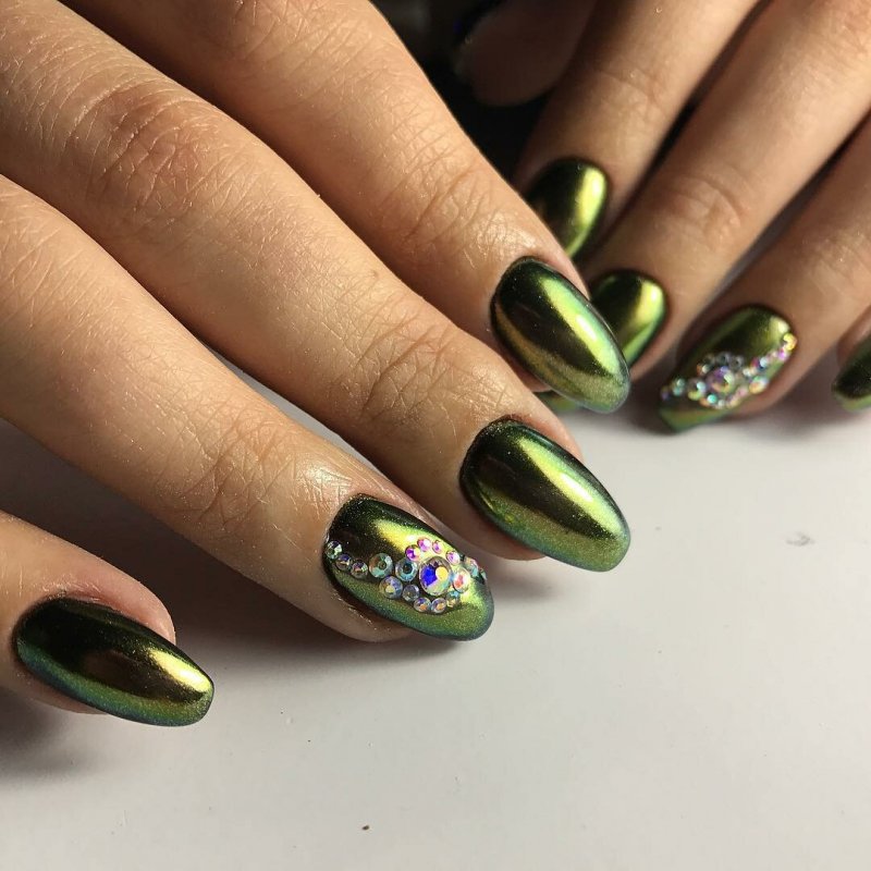 Например, многие предпочитают использовать для маникюра «хром-хамелеон», который получил прозвище «майский жук». Этот вид пигмента считается одним из самых дорогих и принадлежит к премиум-классу, так как в его состав входят мелкодисперсные частицы с выраженным металлическим оттенком.