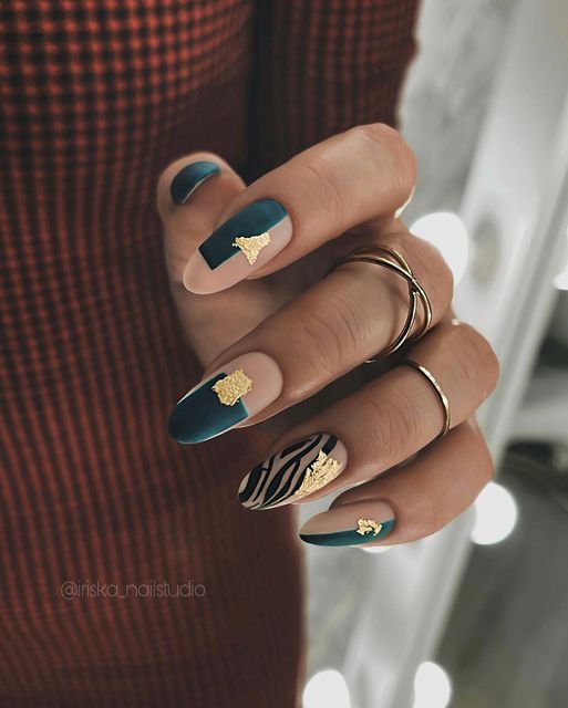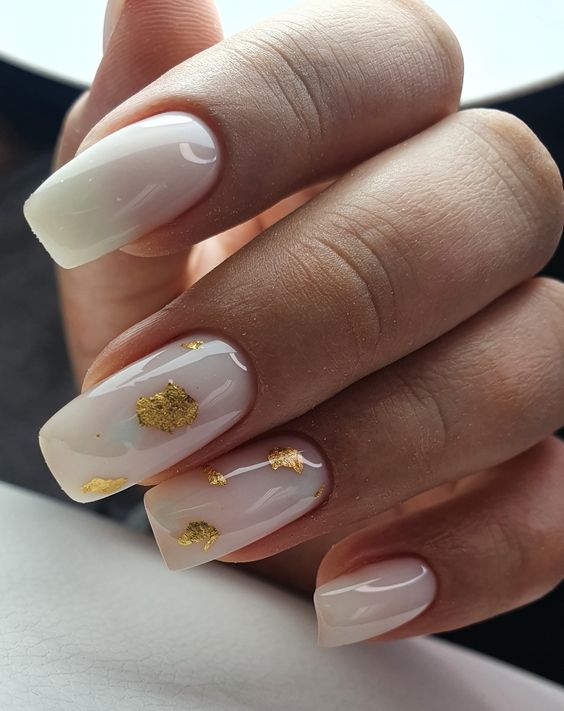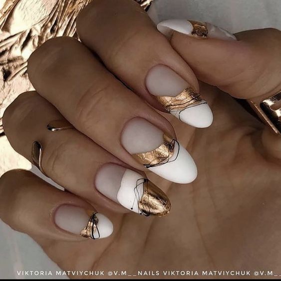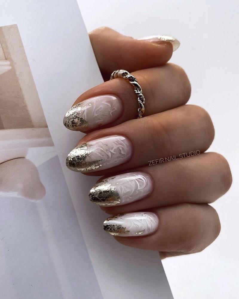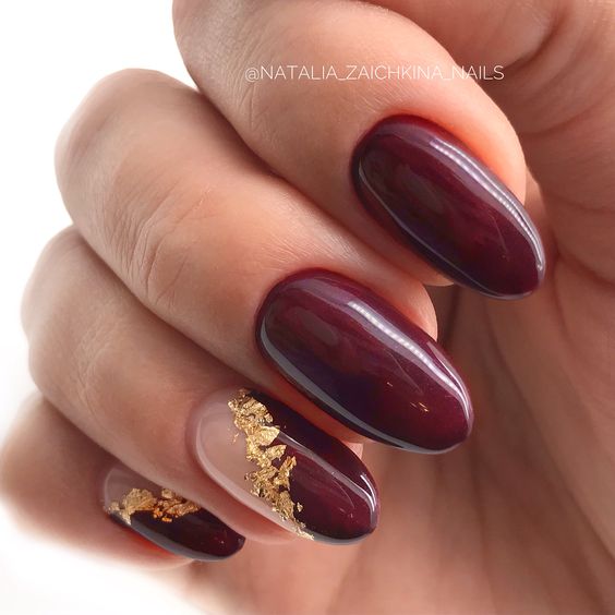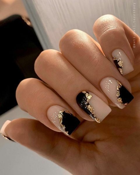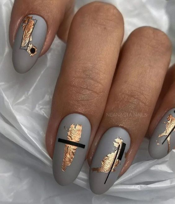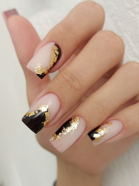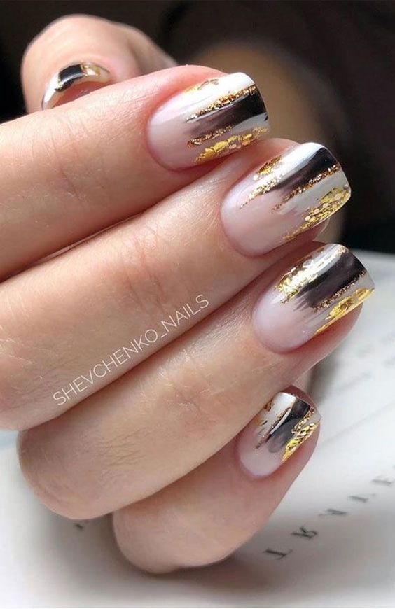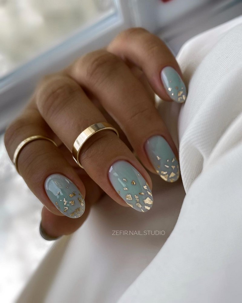 Модный маникюр с золотой фольгой – это роскошный и стильный выбор. Золотая фольга добавляет блеск, текстуру и роскошный акцент к вашему маникюру. Особенно интересно смотрится вариант с нанесением золотой фольги вдоль линии кутикулы, что создает эффектный контраст с основным цветом ногтей.