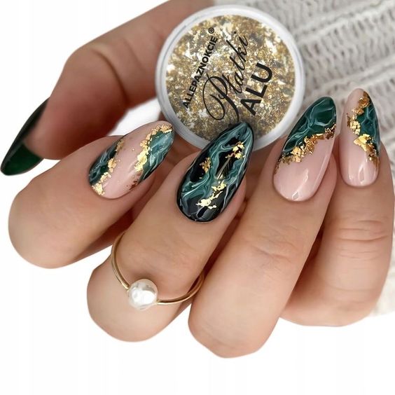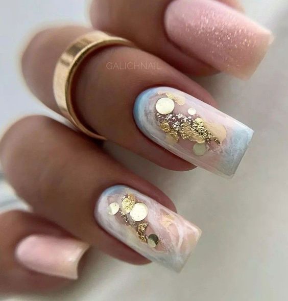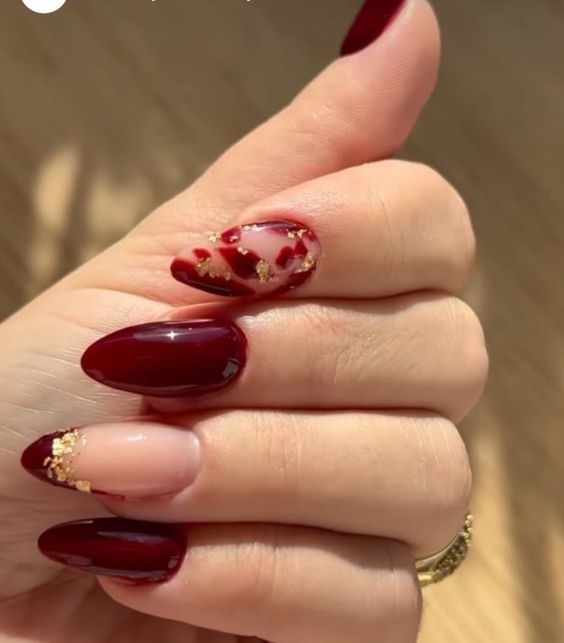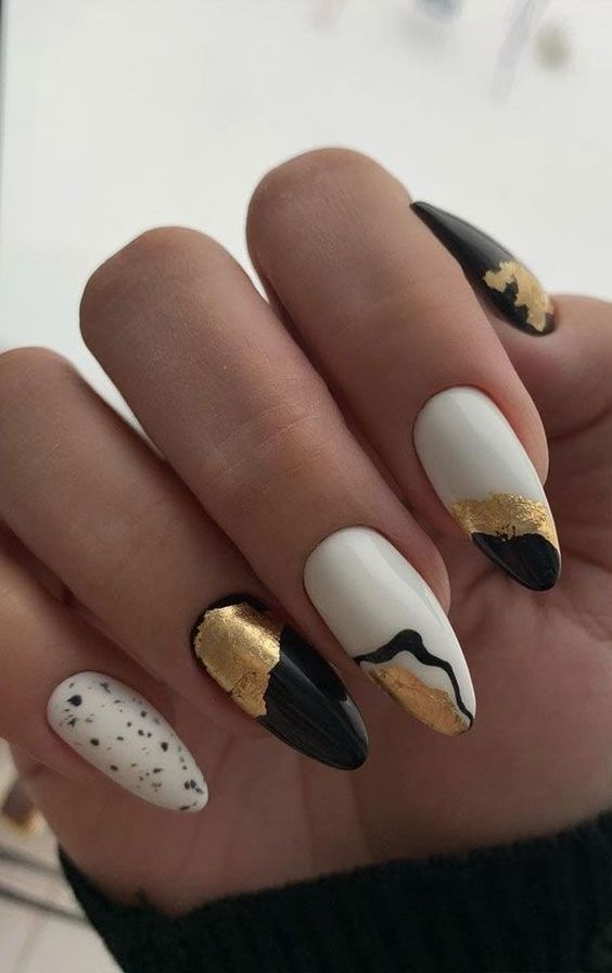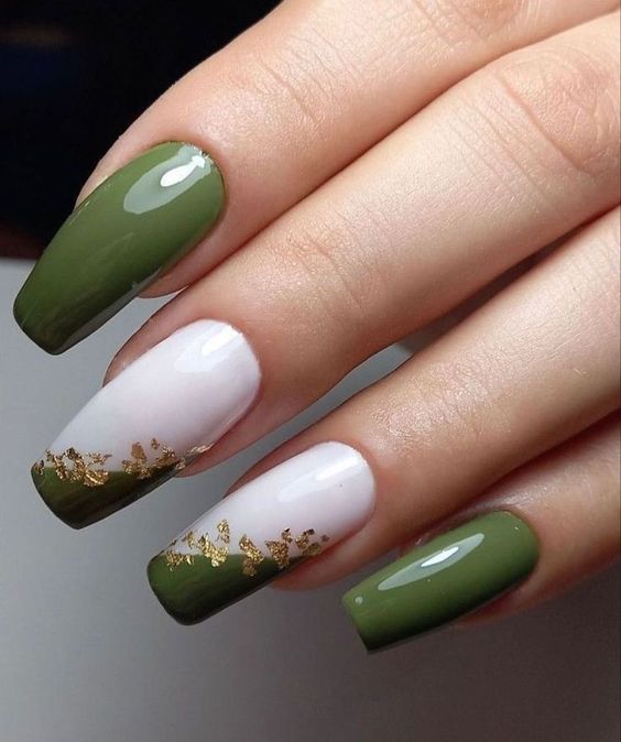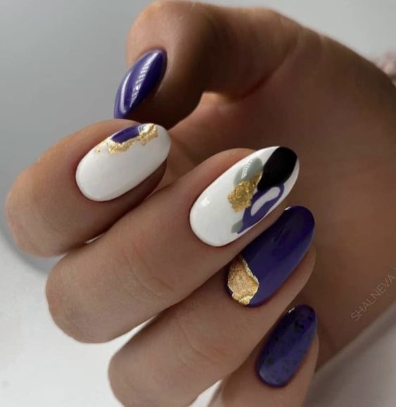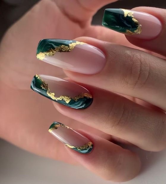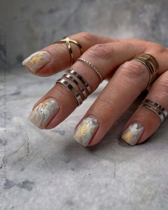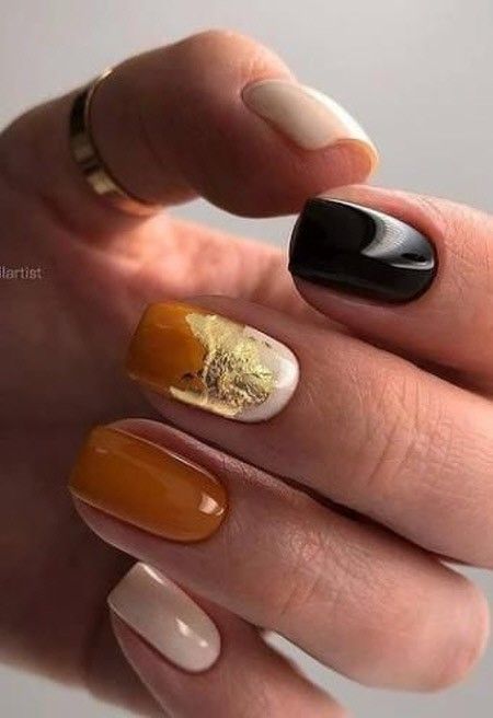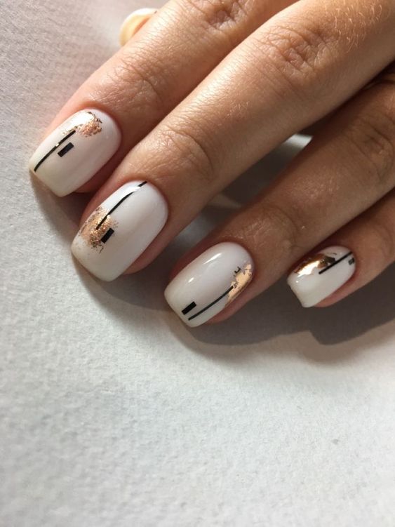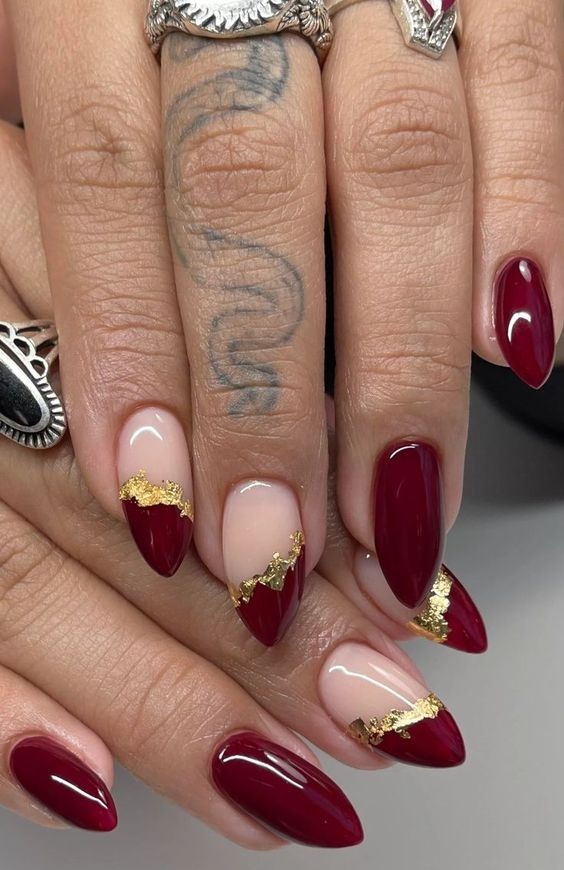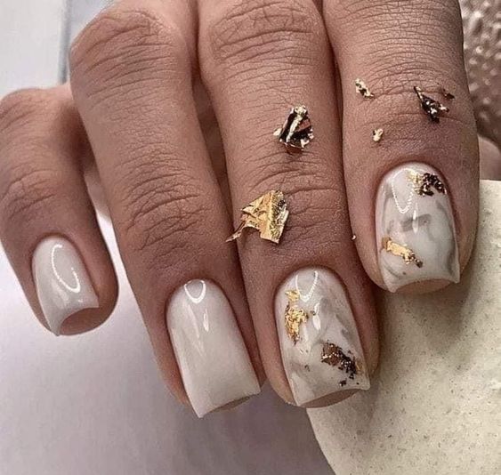 Модный маникюр с золотой фольгой – это роскошный и стильный выбор. Золотая фольга добавляет блеск, текстуру и роскошный акцент к вашему маникюру. Особенно интересно смотрится вариант с нанесением золотой фольги вдоль линии кутикулы, что создает эффектный контраст с основным цветом ногтей.