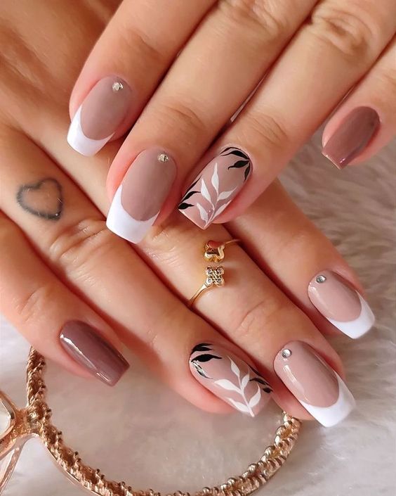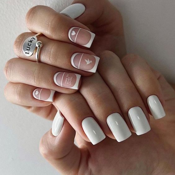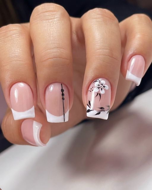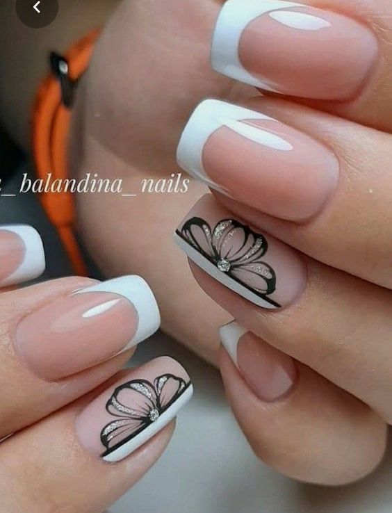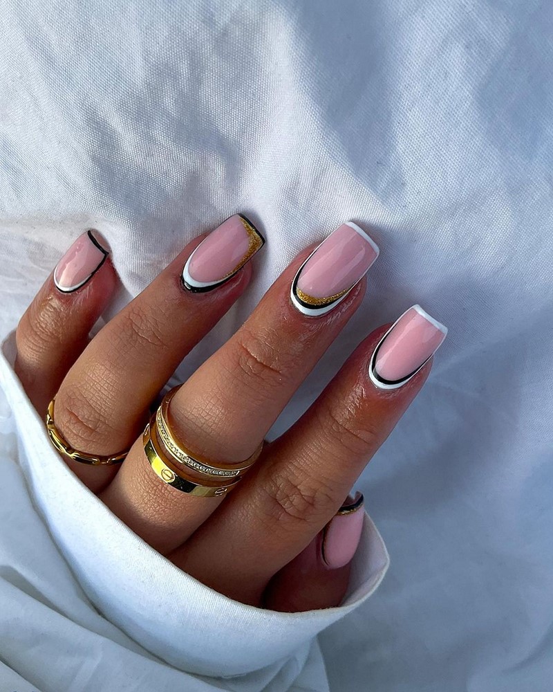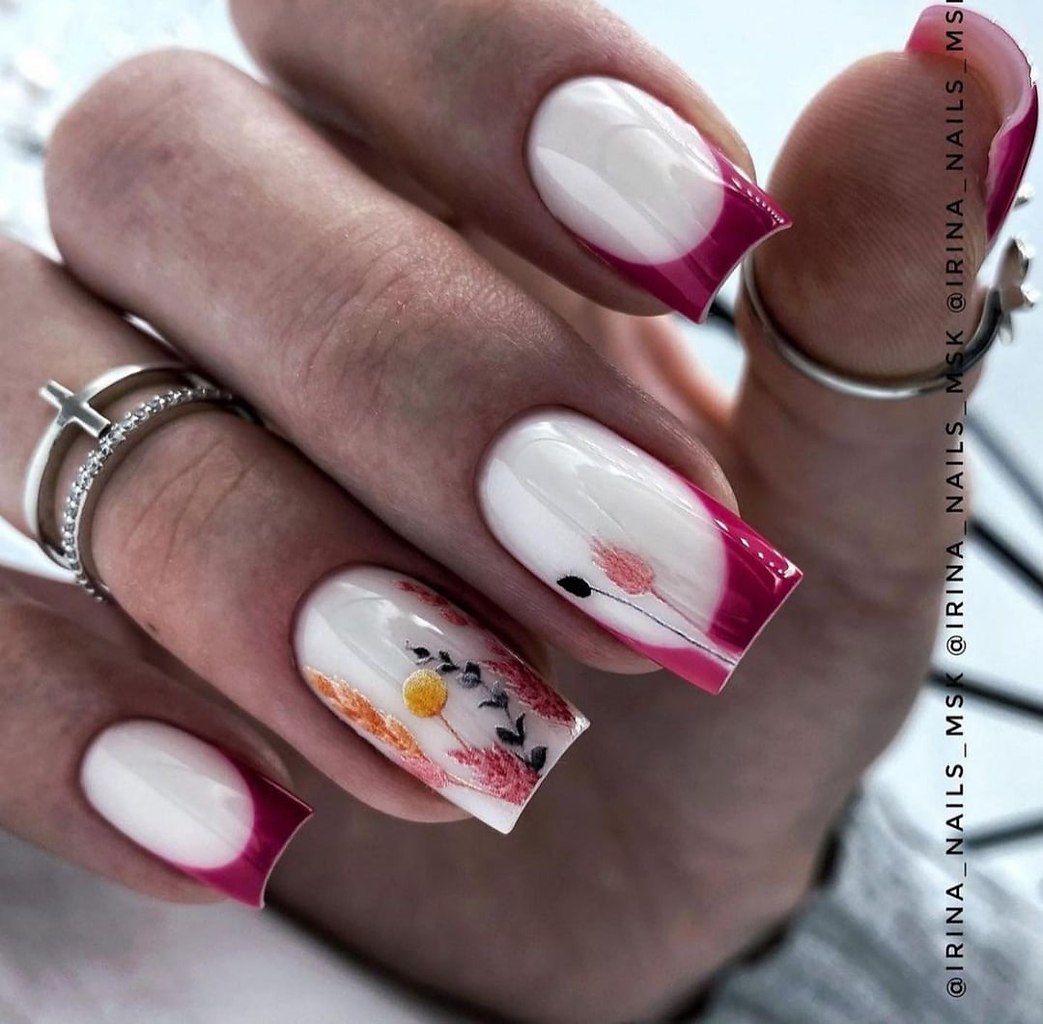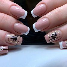 - смешение стилей: экспериментирование с разными стилями, такими как френч в комбинации с графичными элементами, винтажными узорами или арт-дизайном, придает маникюру уникальность.