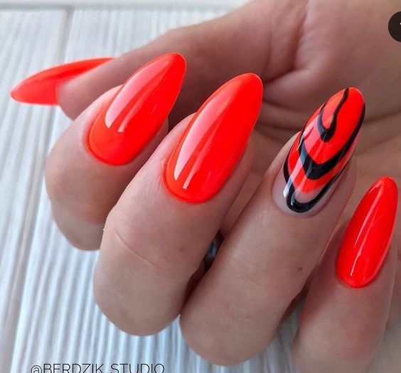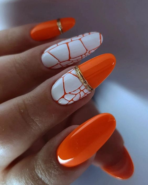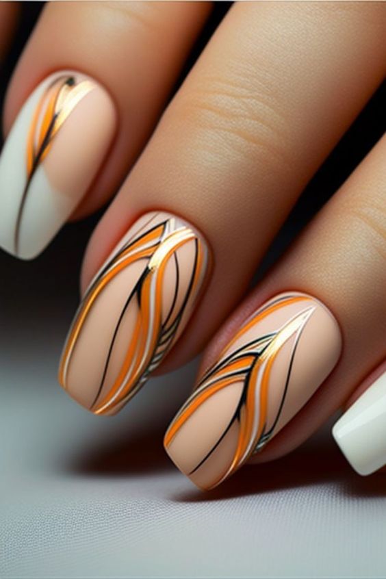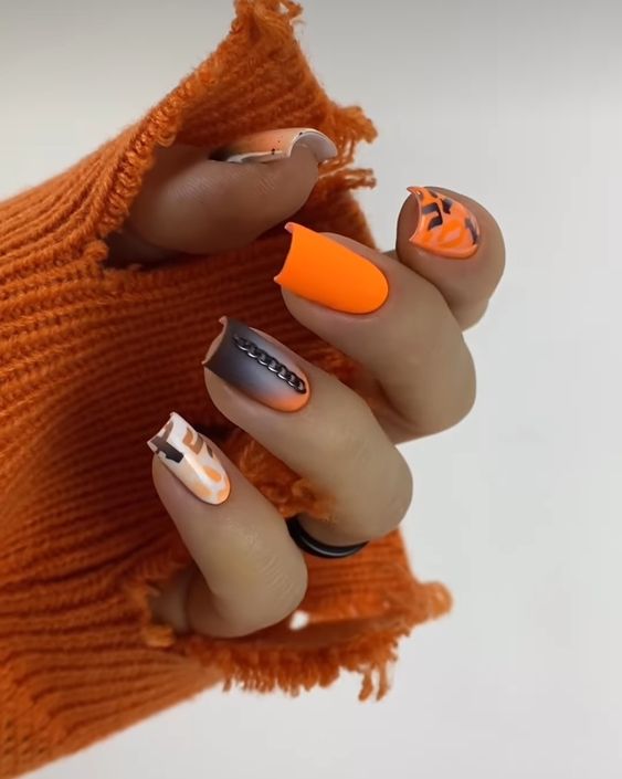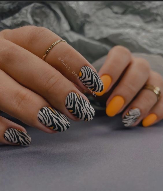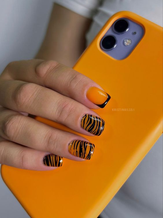 - тигровый орнамент: нанесите оранжевый базовый цвет и добавьте черные полосы в разных направлениях, чтобы создать орнамент, напоминающий тигровую шкуру;
