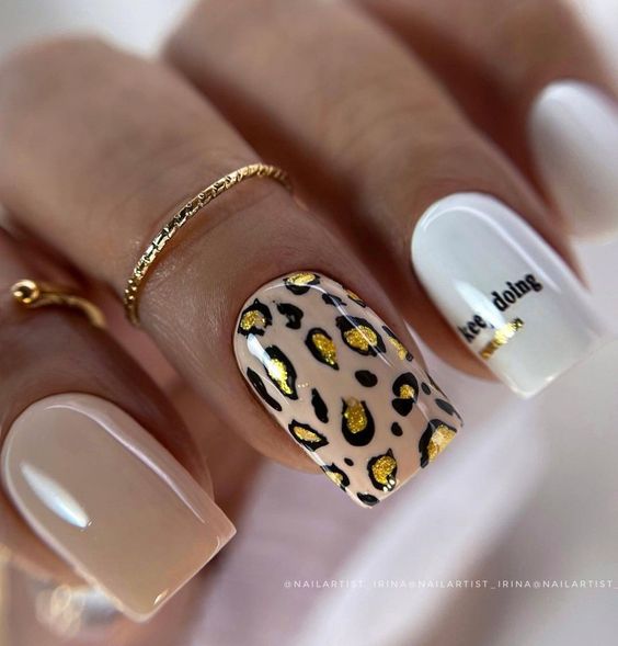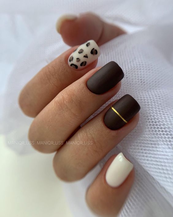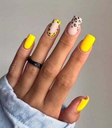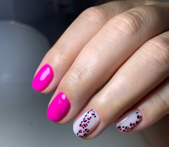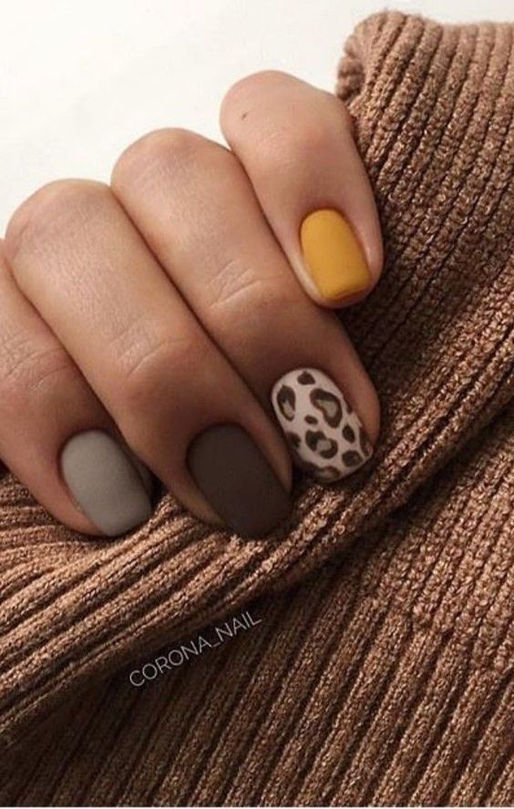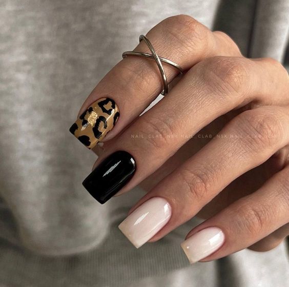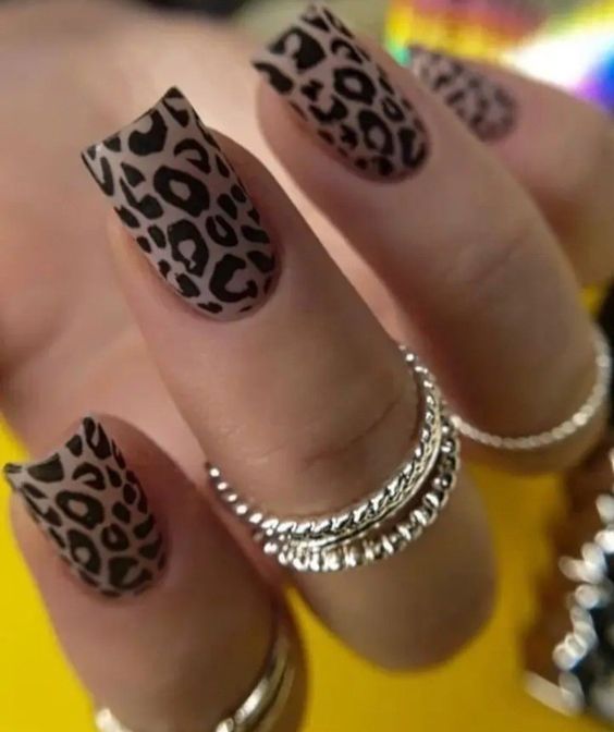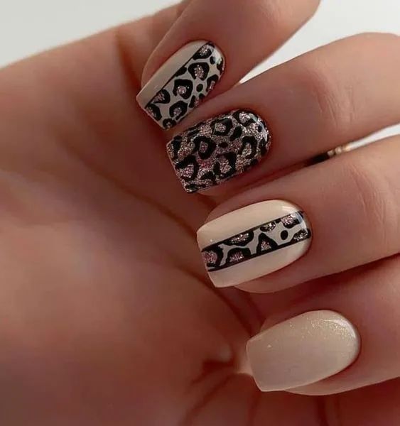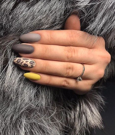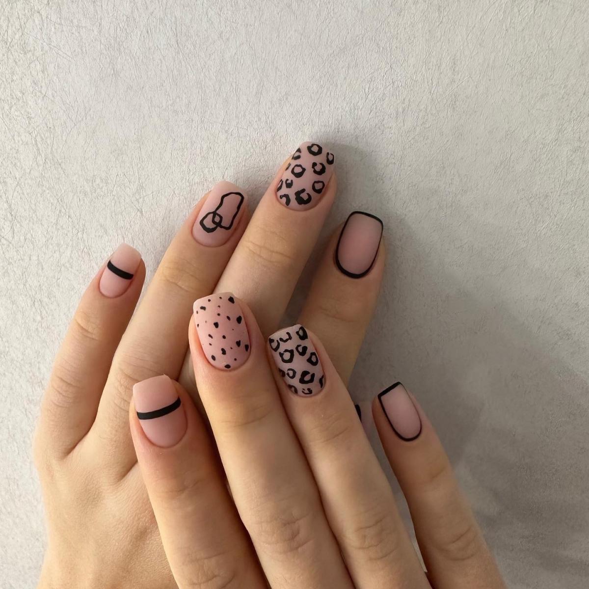 - леопардовый принт: создайте базовый цвет, например, бежевый или светло-желтый, и добавьте черные пятна в стиле леопарда. Этот дизайн отлично выглядит на акцент-ногтях;