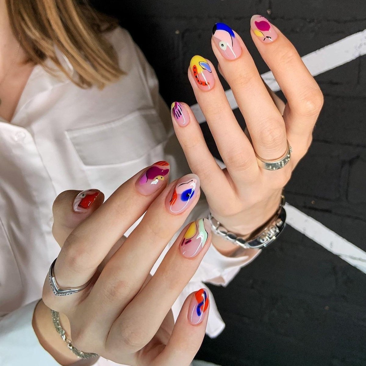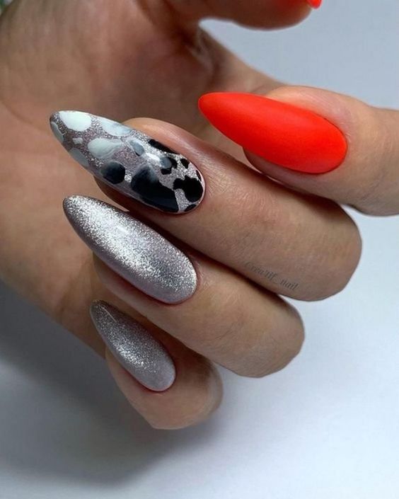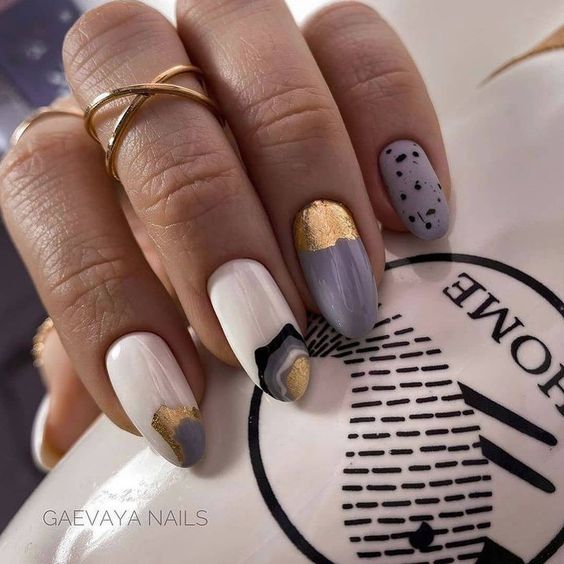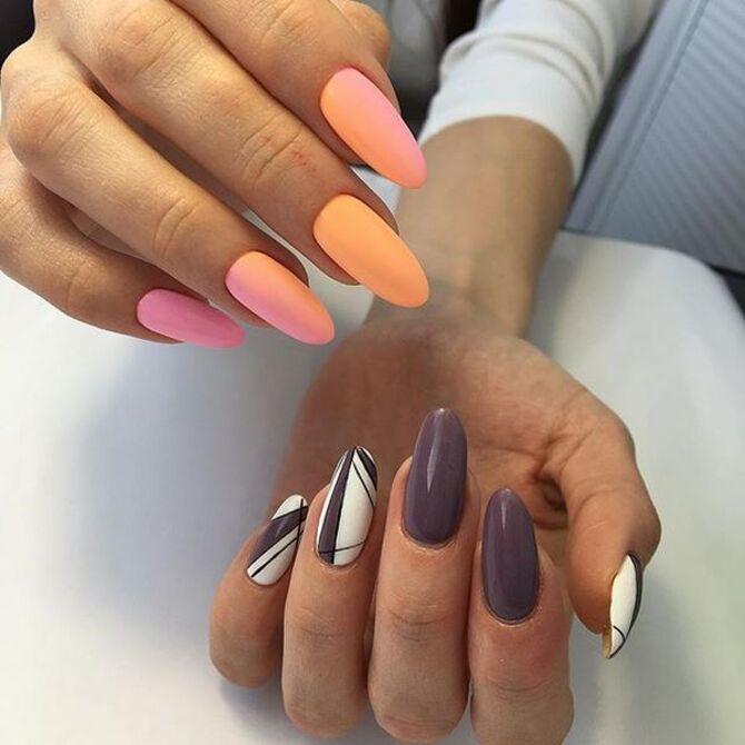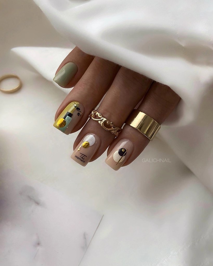 Этот маникюр отлично впишется в желание модниц экспериментировать с образом. Эта техника подразумевает создание уникальных дизайнов на каждом ногтевом покрытии. Вот несколько идей: