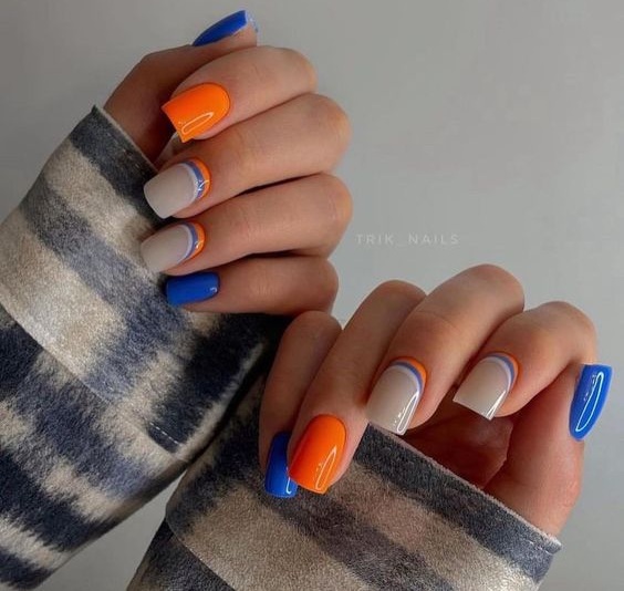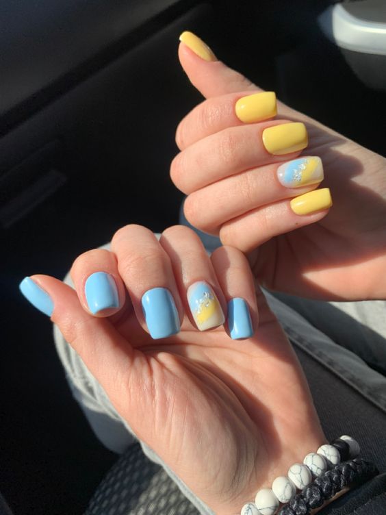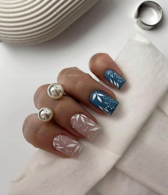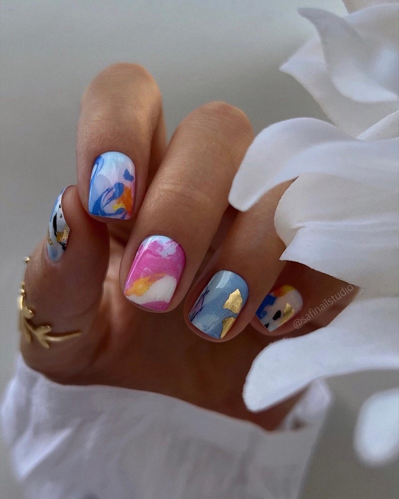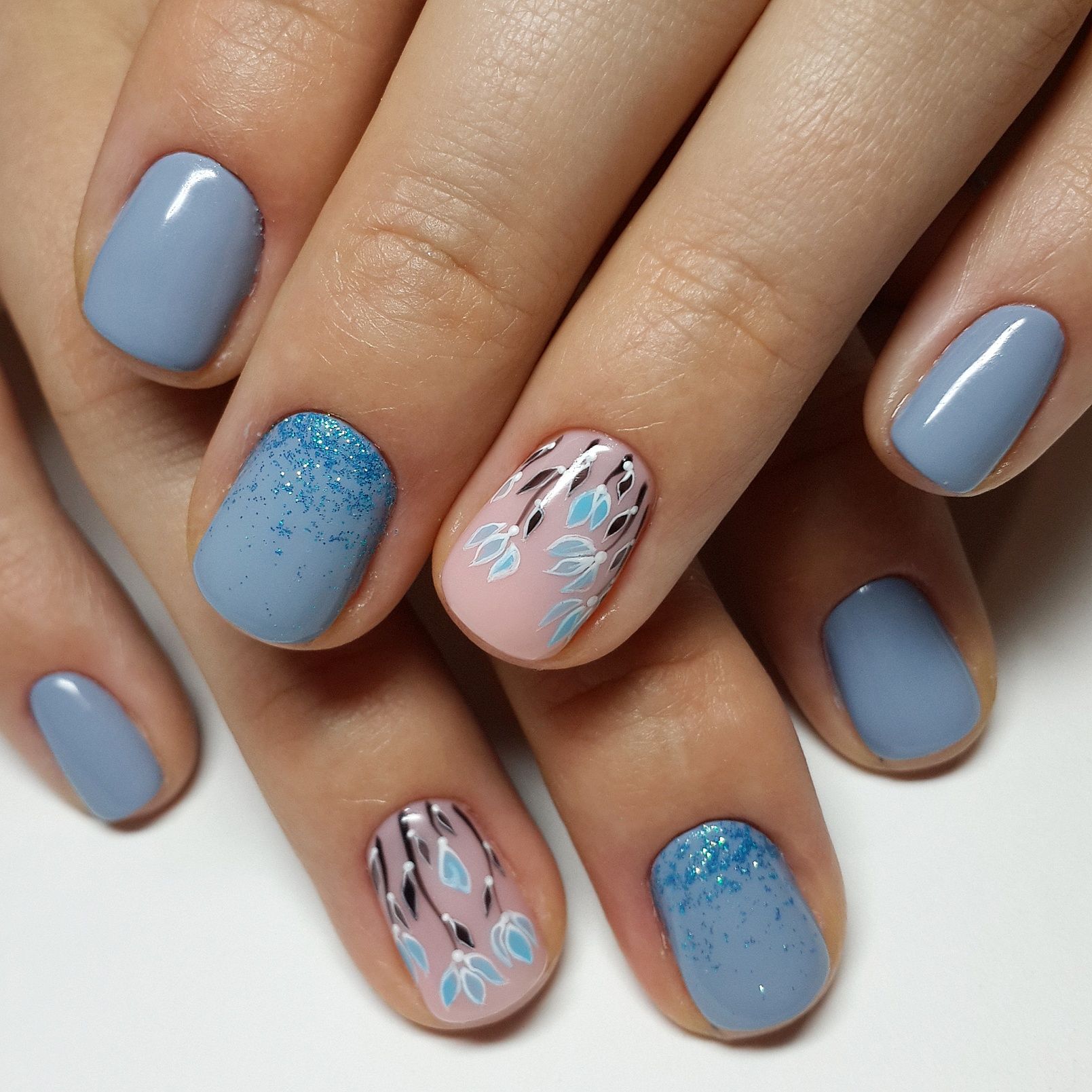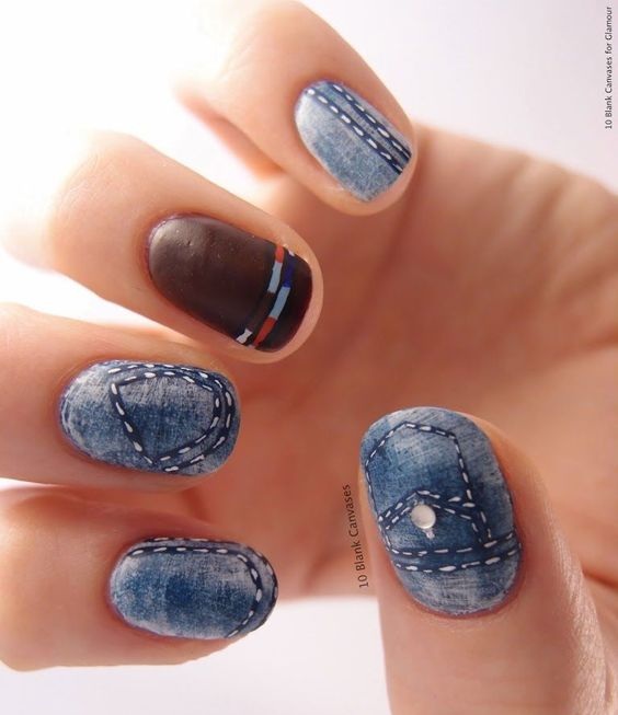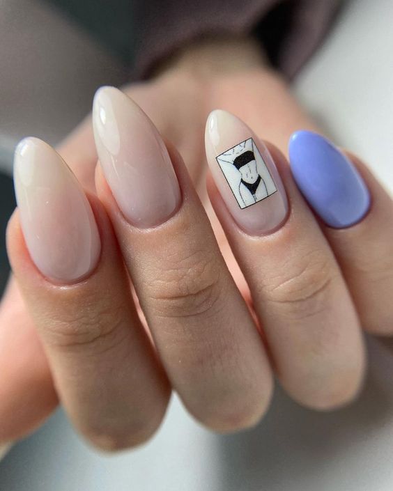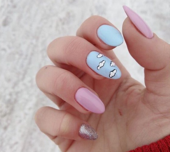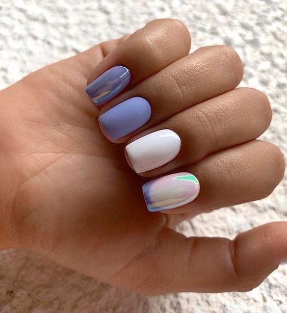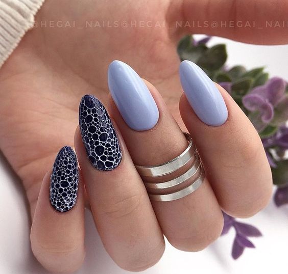 - цветовая гармония: используйте палитру из нескольких согласующихся цветов, но разные руки будут иметь немного разные оттенки. Например, на одной руке сделайте маникюр в голубых тонах, на другой – в синих;
