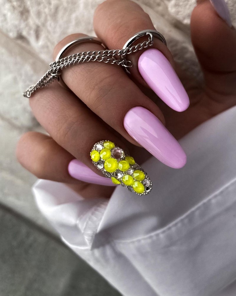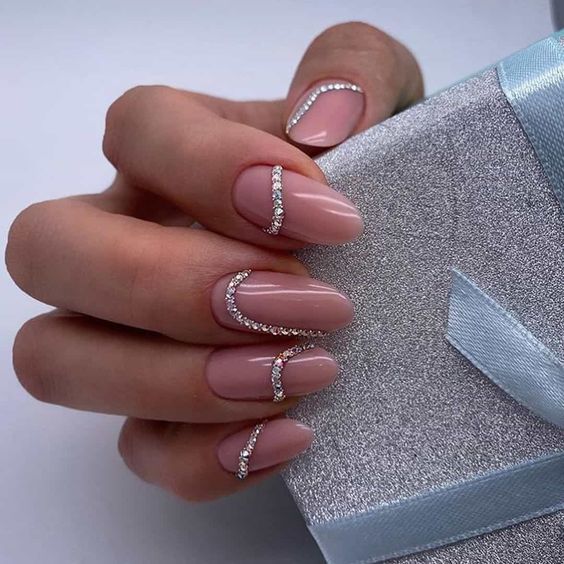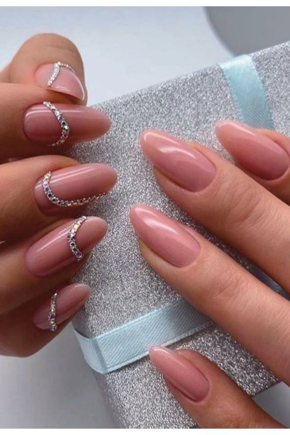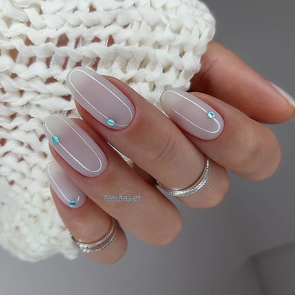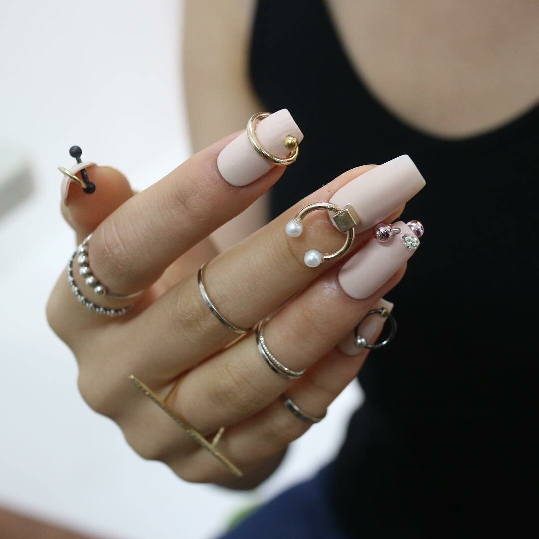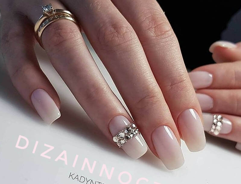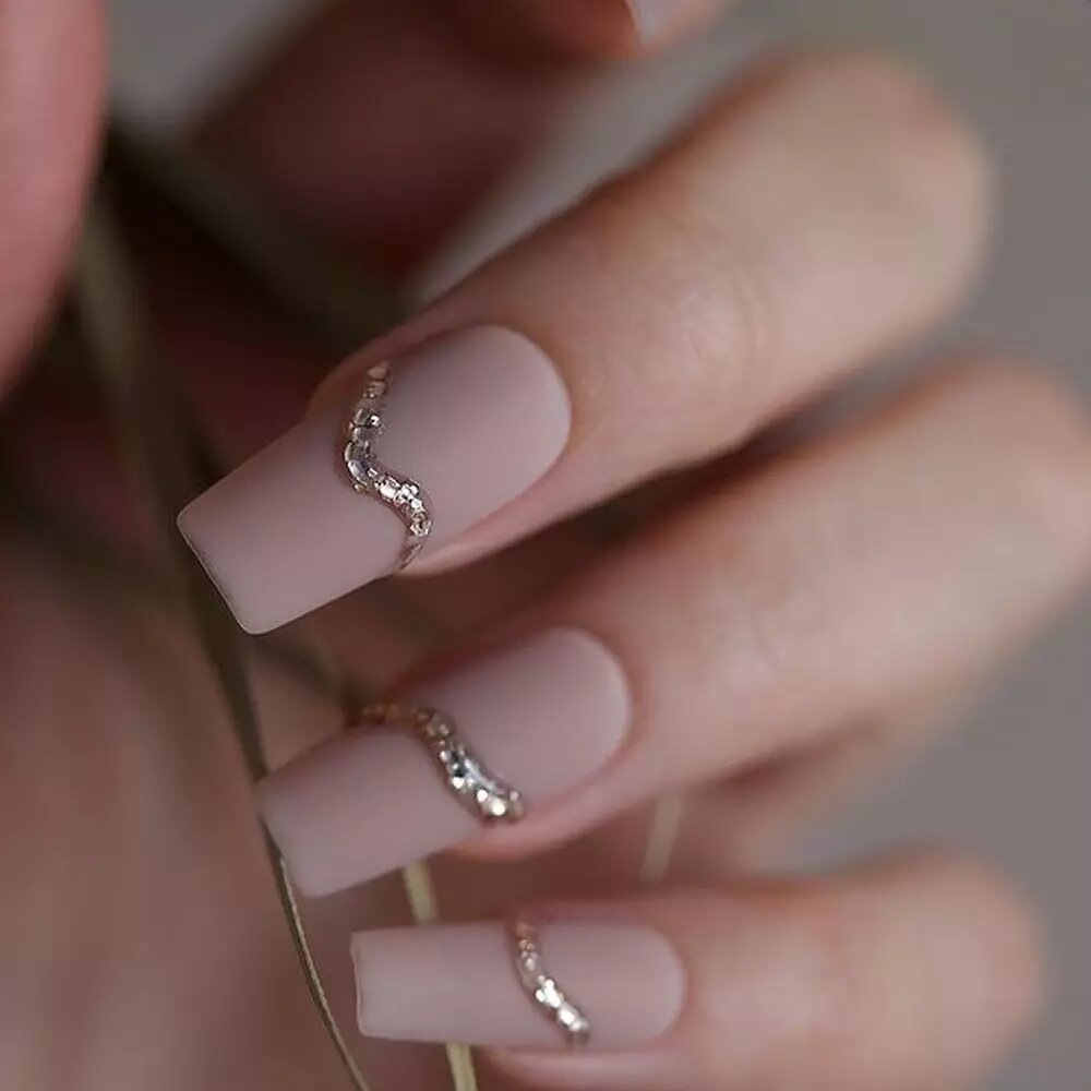 Стразы популярны по-прежнему. Но, обратите внимание, дизайнеры рекомендуют отказаться от слишком обильного дизайна. Отличный вариант — дизайн «кольцо». Этот метод представляет собой один из наиболее простых способов использования страз в маникюре. Стразы укладываются на ногте в виде полоски, иногда они могут быть дополнены вставками бусин, металлическими элементами или другими материалами, чтобы создать уникальные и оригинальные дизайны.