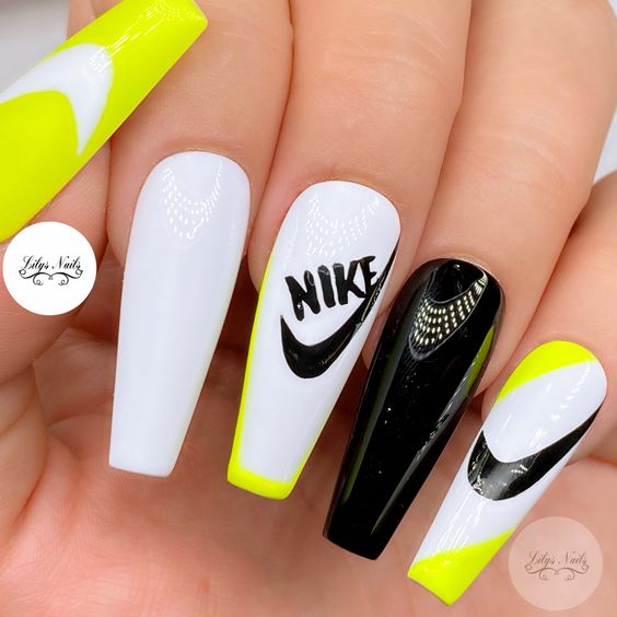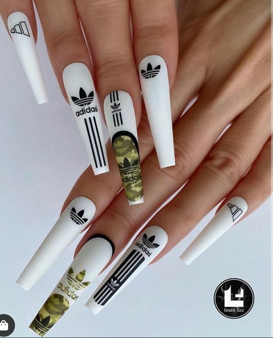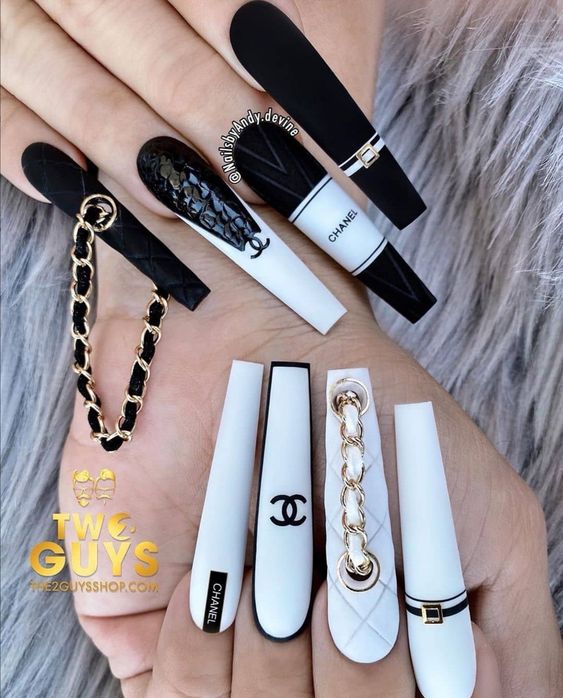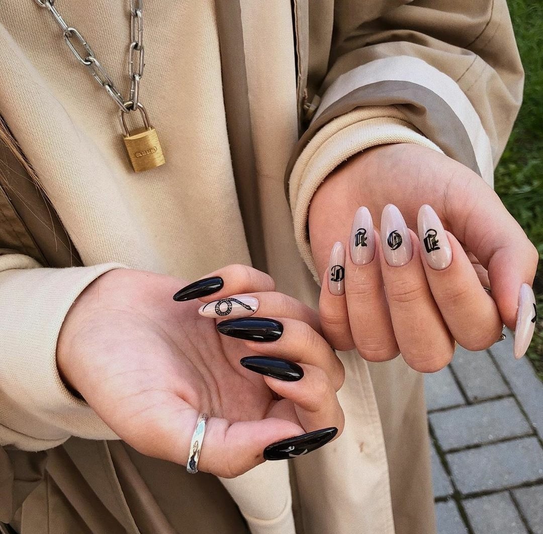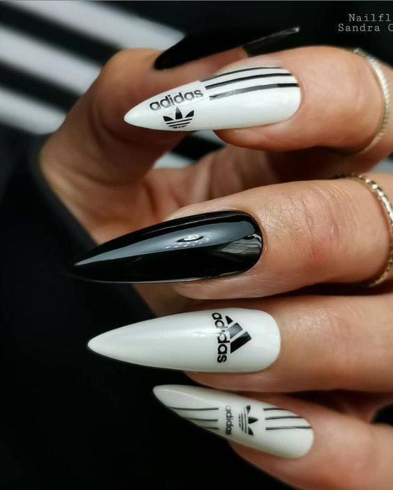- монохромная логотипика. Создайте черно-белый или монохромный маникюр с различными логотипами и символами брендов для минималистичного, но стильного вида;