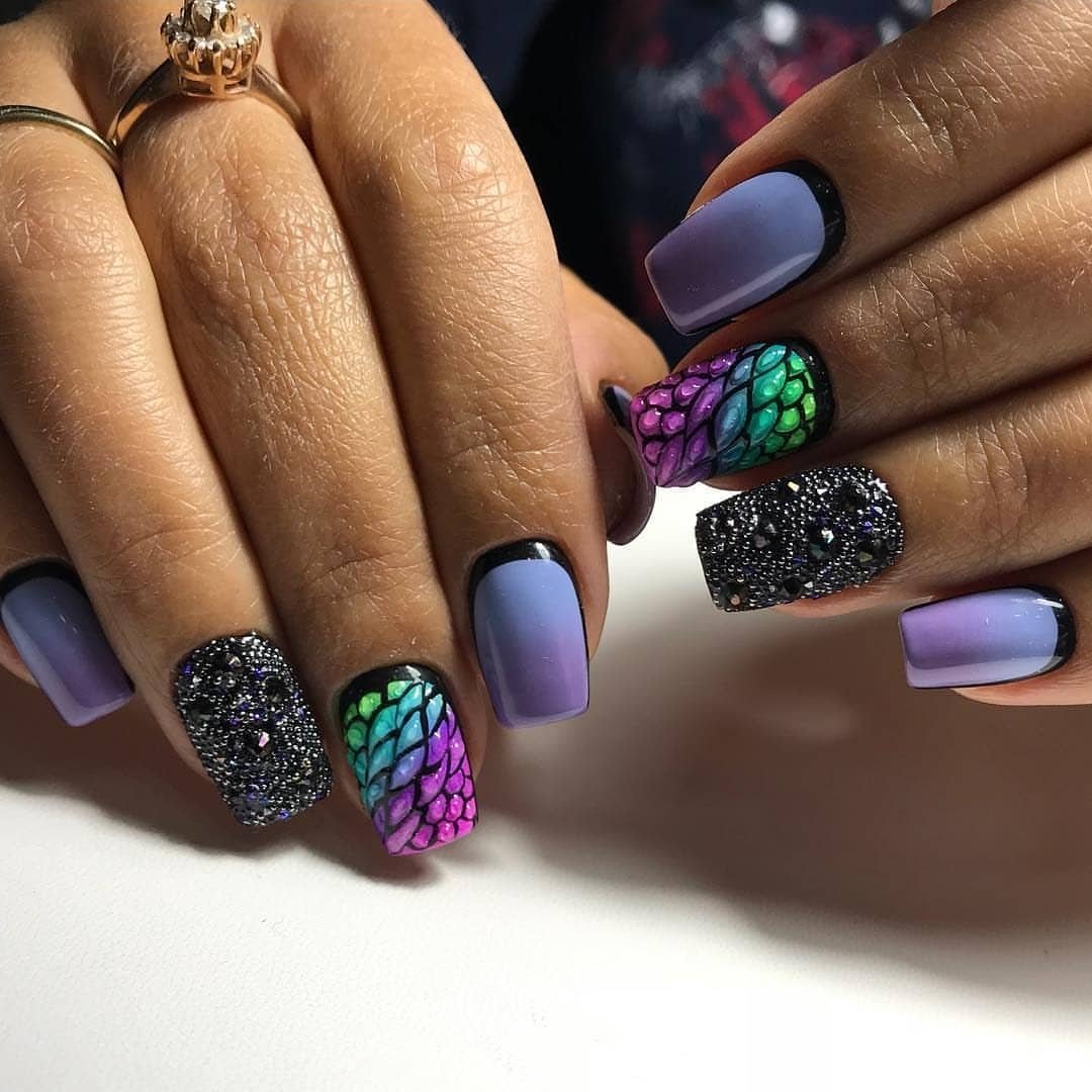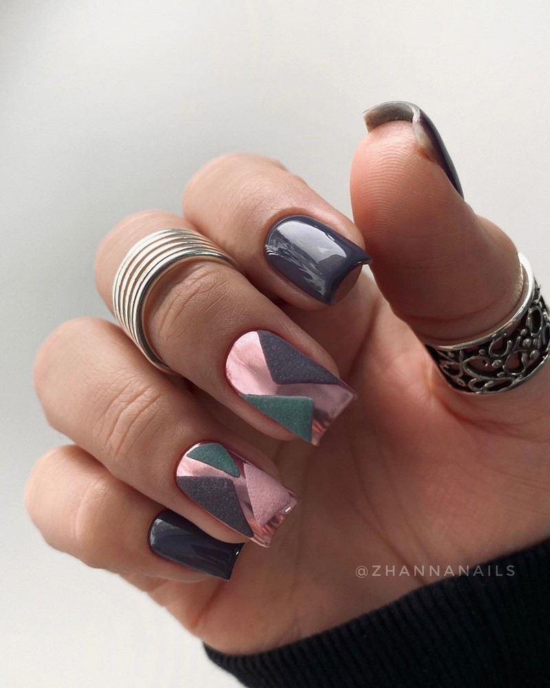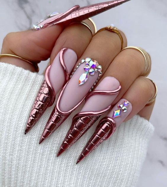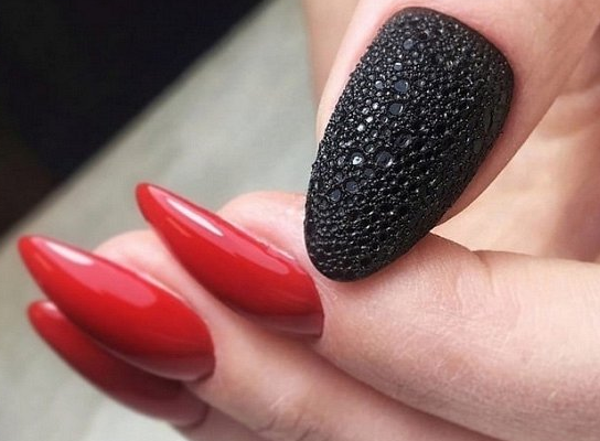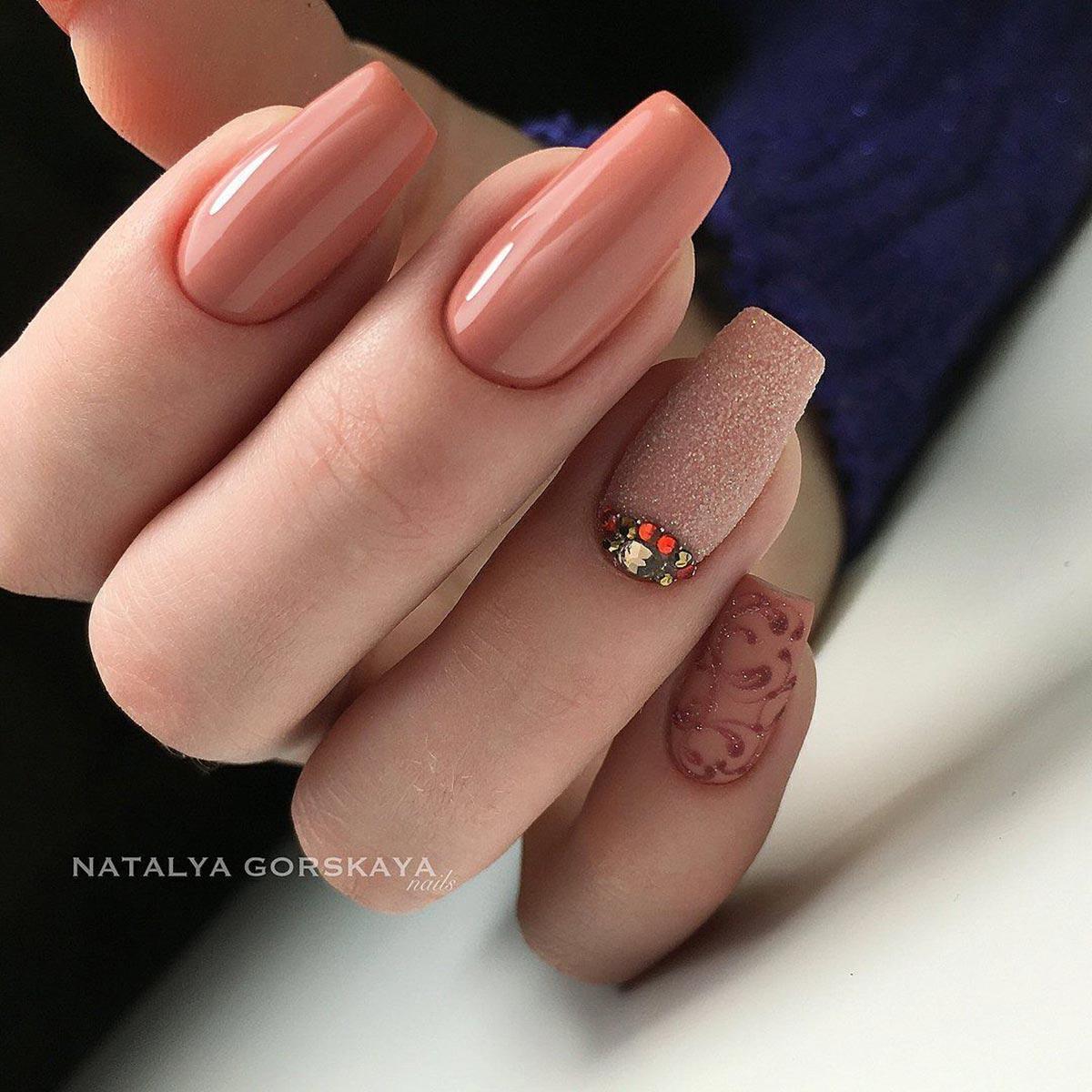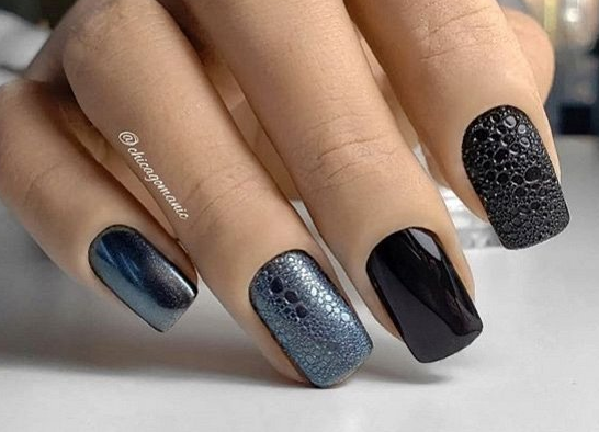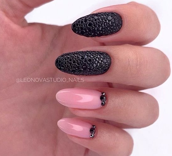 - игра со структурами: добавление объемных элементов, таких как стразы, камни, металлические детали или даже объемные рисунки, делает маникюр более текстурным и интересным;