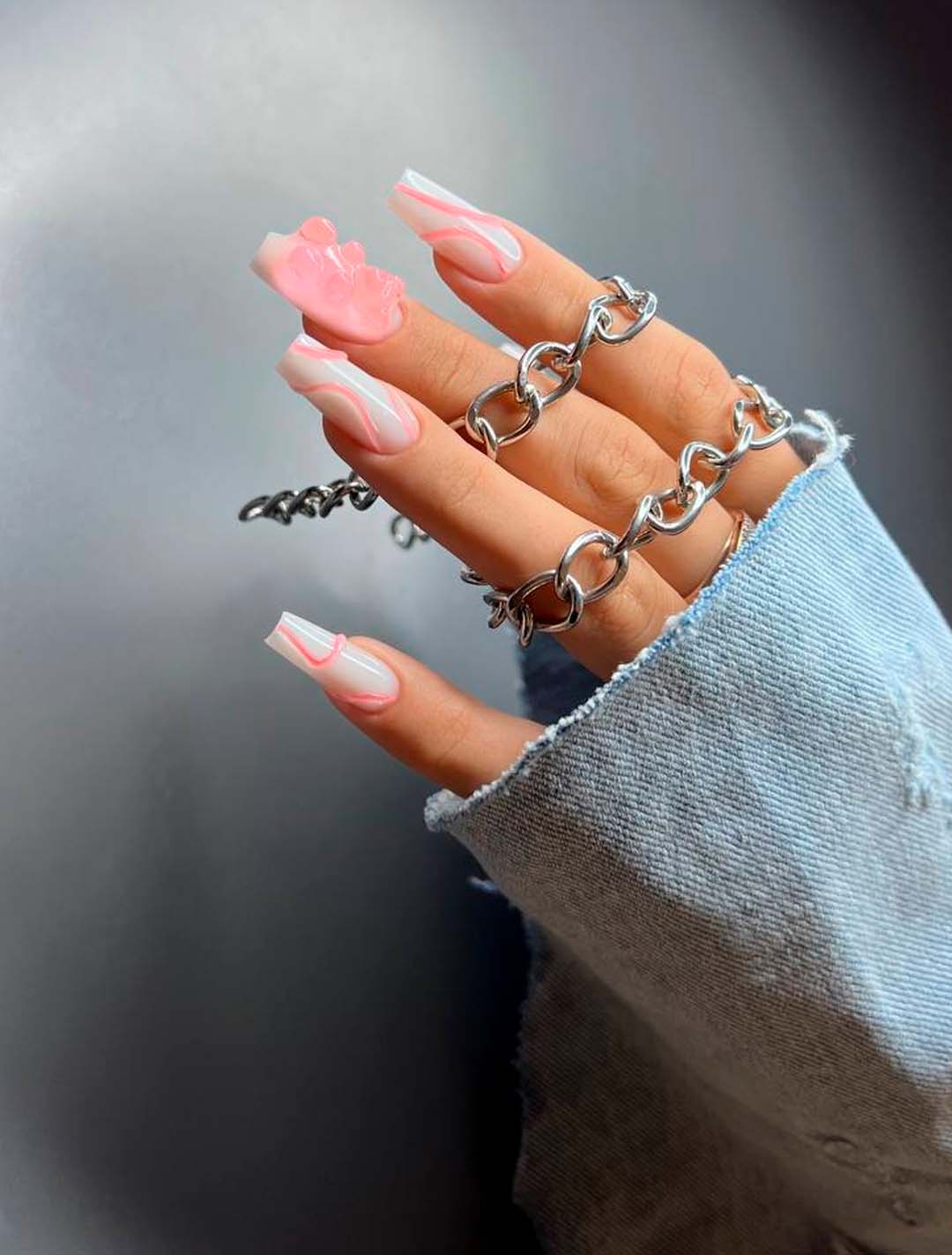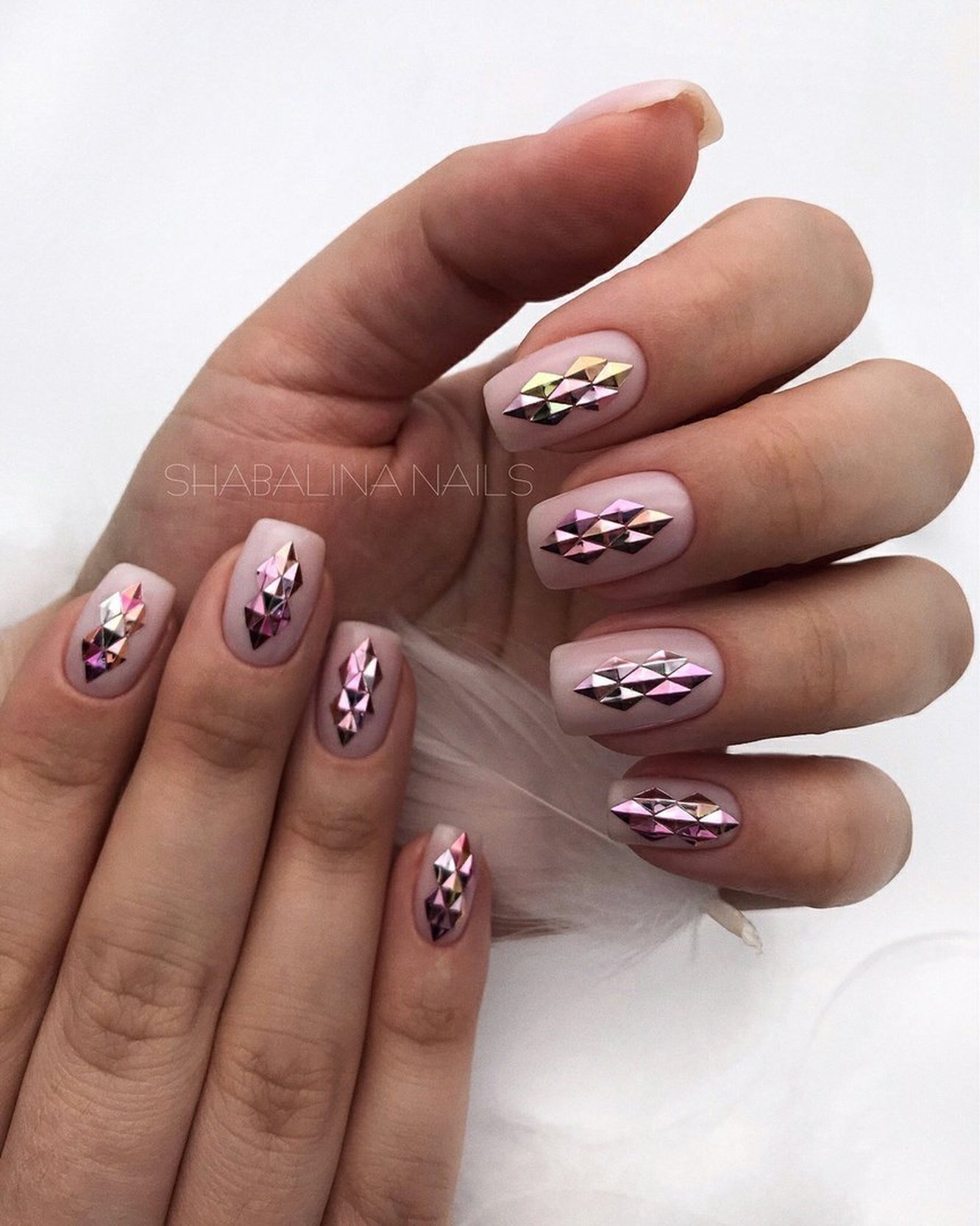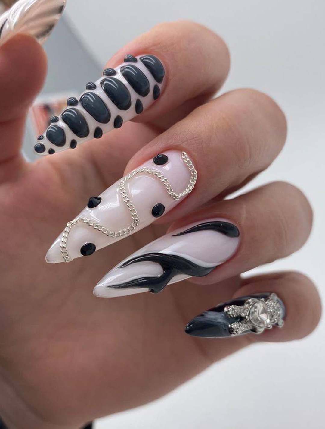 - игра со структурами: добавление объемных элементов, таких как стразы, камни, металлические детали или даже объемные рисунки, делает маникюр более текстурным и интересным;
