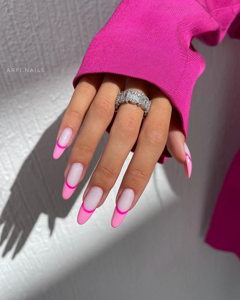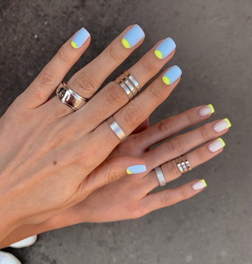 - необычные цвета: вместо традиционных белых и нюдовых оттенков можно использовать разнообразные цвета для кончиков ногтей и базовой части. Яркие, пастельные, металлические и даже неоновые цвета стали популярными выборами;