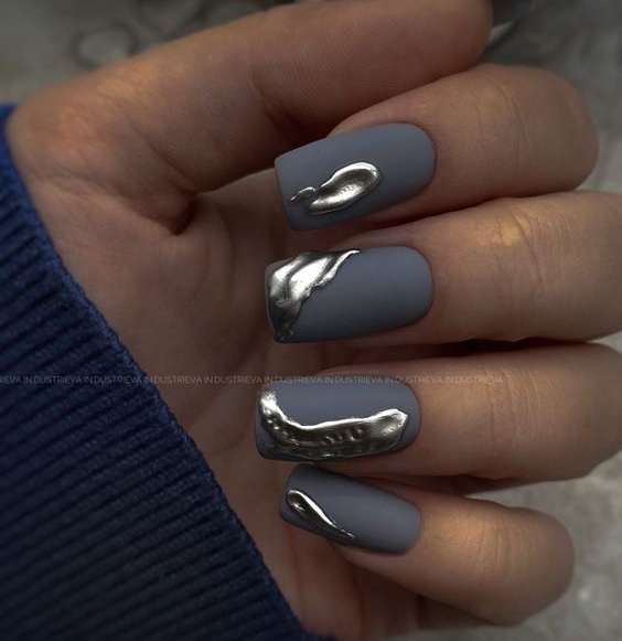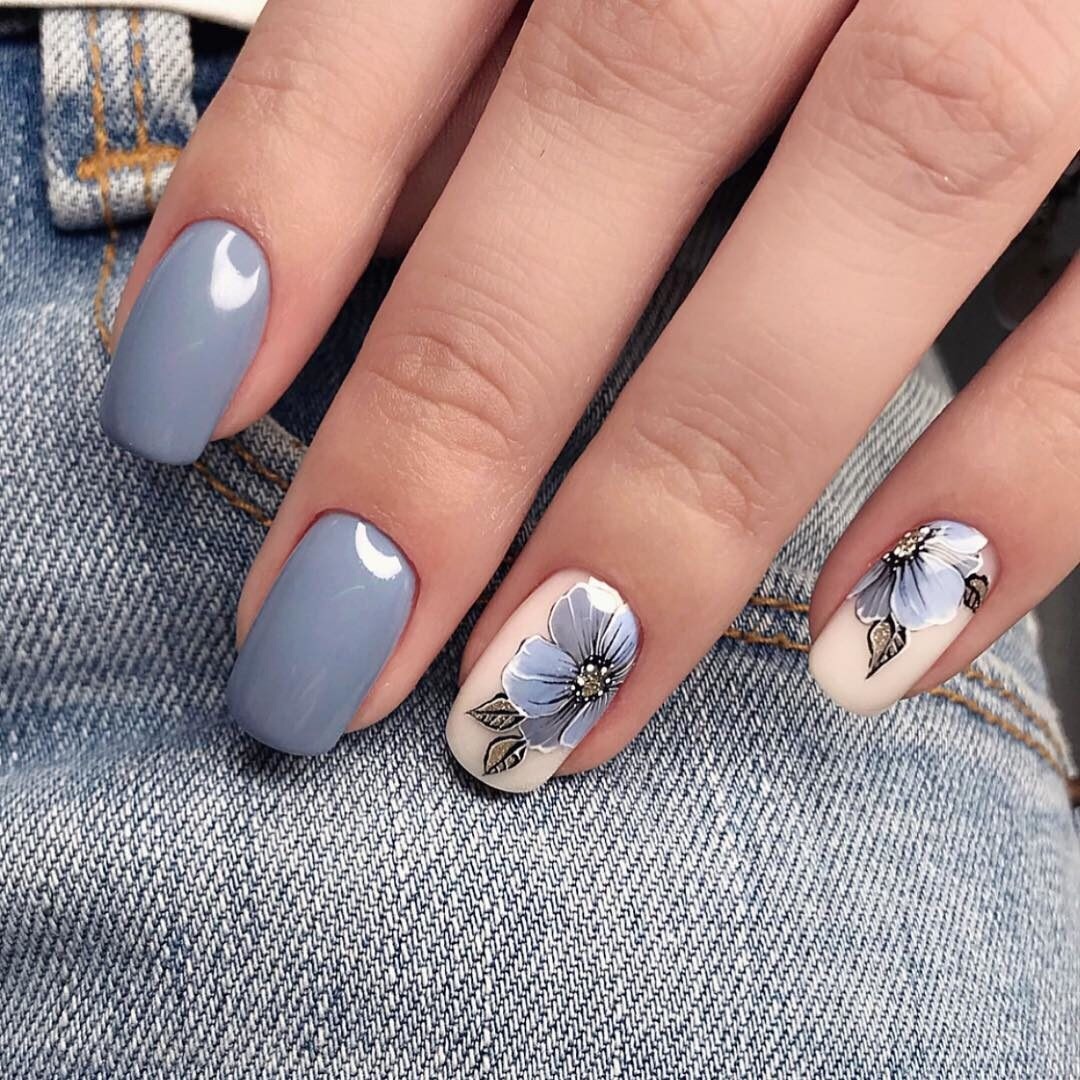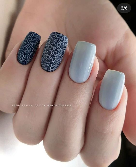 Синие и сероватые оттенки великолепно сочетаются между собой, что делает их универсальными и легко комбинируемыми. Этот гармоничный союз цветов позволяет создавать разнообразные и стильные образы как в одежде, так и в маникюре. Оттенки денима придают ногтям элегантность и модный акцент, подчеркивая современный стиль и вкус своей обладательницы.