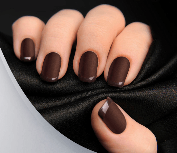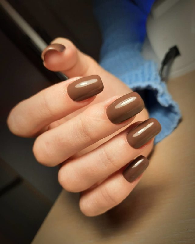 Красивый цвет, напоминающий чашку горячего шоколада. «Шоколадный однотонный маникюр» – вкусно звучит и чаще всего дополняет именно красивый осенний образ. Подходит для светлой кожи нейтральных тонов. Для длинных красивых ногтей специалисты рекомендуют подбирать оттенки потемнее, а для средних, а также коротких ногтей – более светлые вариации. Наиболее подходящий цвет для гардероба с шоколадными – бежевый.