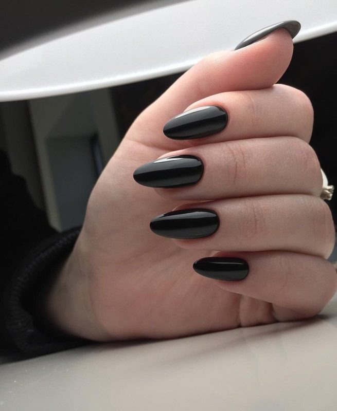 Присматриваясь к черному варианту очень важно учитывать форму и длину. Маникюр однотонный красивый черный может хорошо сочетаться со стразами, френчем и другими изысками в дизайне ногтей.