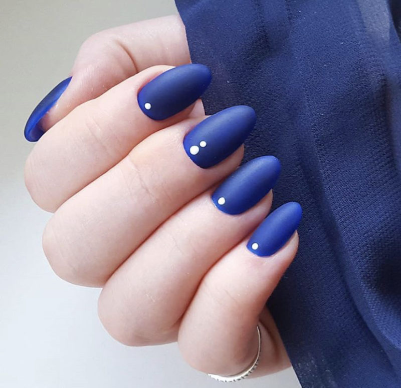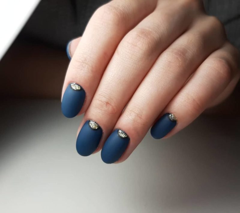 Синий дизайн можно охарактеризовать, как яркий, необычный и особенный. Ассоциируется с морской темой, зимней, космической и фэнтези. Отлично смотрится синий в матовом исполнении. По этим причинам наиболее подходящий сезон для синего маникюра – конечно, зима. Дизайн в синем цвете можно дополнить блестящим нейл-артом, с блестками, выбирать лаки в стиле металлик или глиттер.