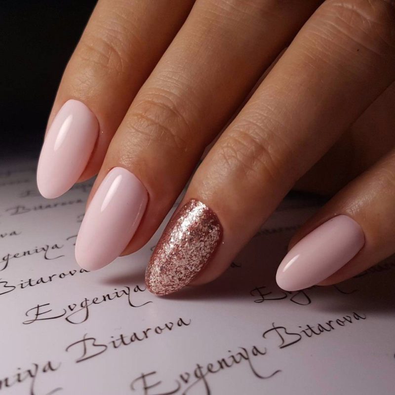 Поскольку овальная мягкая форма – выбор женственных особ, то и цвета такого маникюра популярны в основном женственные: бежевый, карамельный, нежно-розовый, нежно-голубой, персиковый, жемчужный (можно в сочетании с перламутром). Эти оттенки добавляют мягкости в образ.