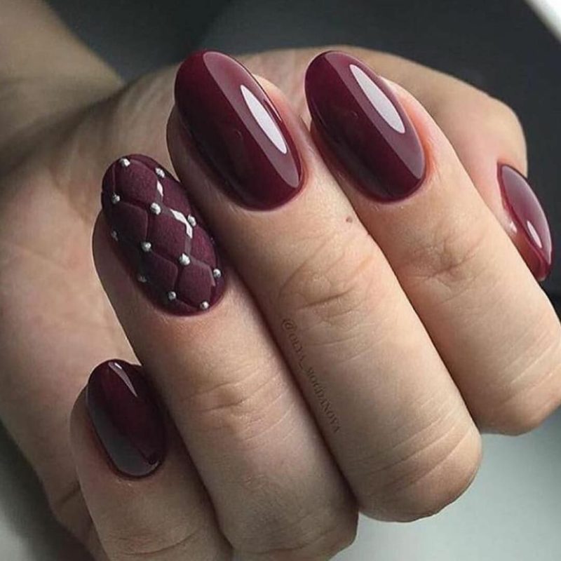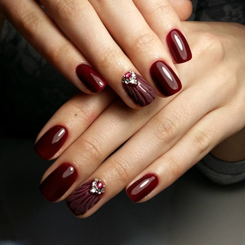 Такие красивые оттенки подойдут стильным зрелым леди. Ассоциируясь с цветом выдержанного терпкого вина в бокале, винный маникюр эффектно дополнит вечерний образ, а также будет уместен и для деловой встречи. Данный красивый цвет – своеобразная классика, универсален и подойдет для любой длинны.