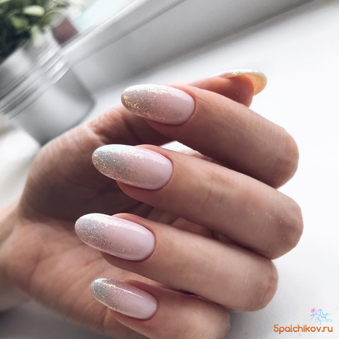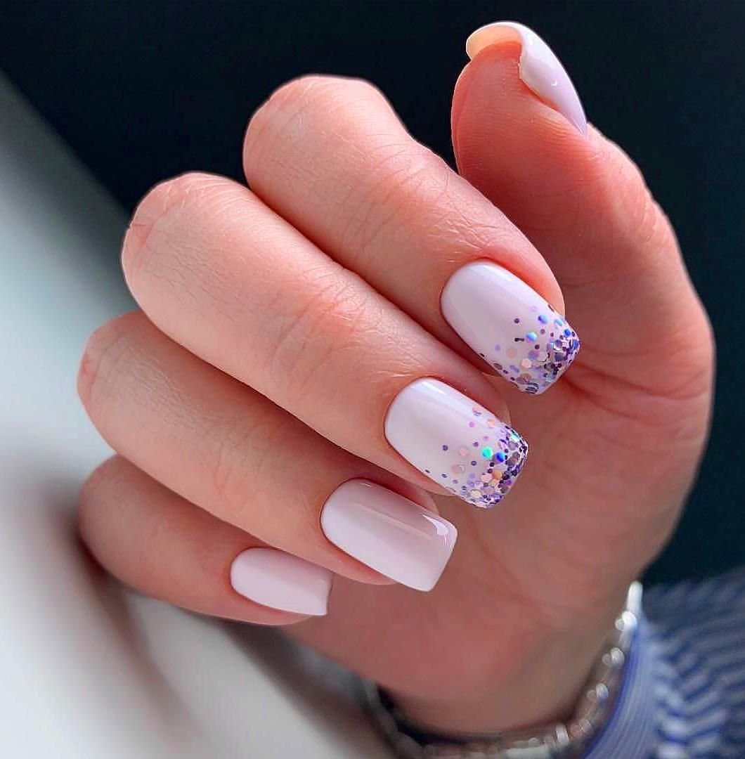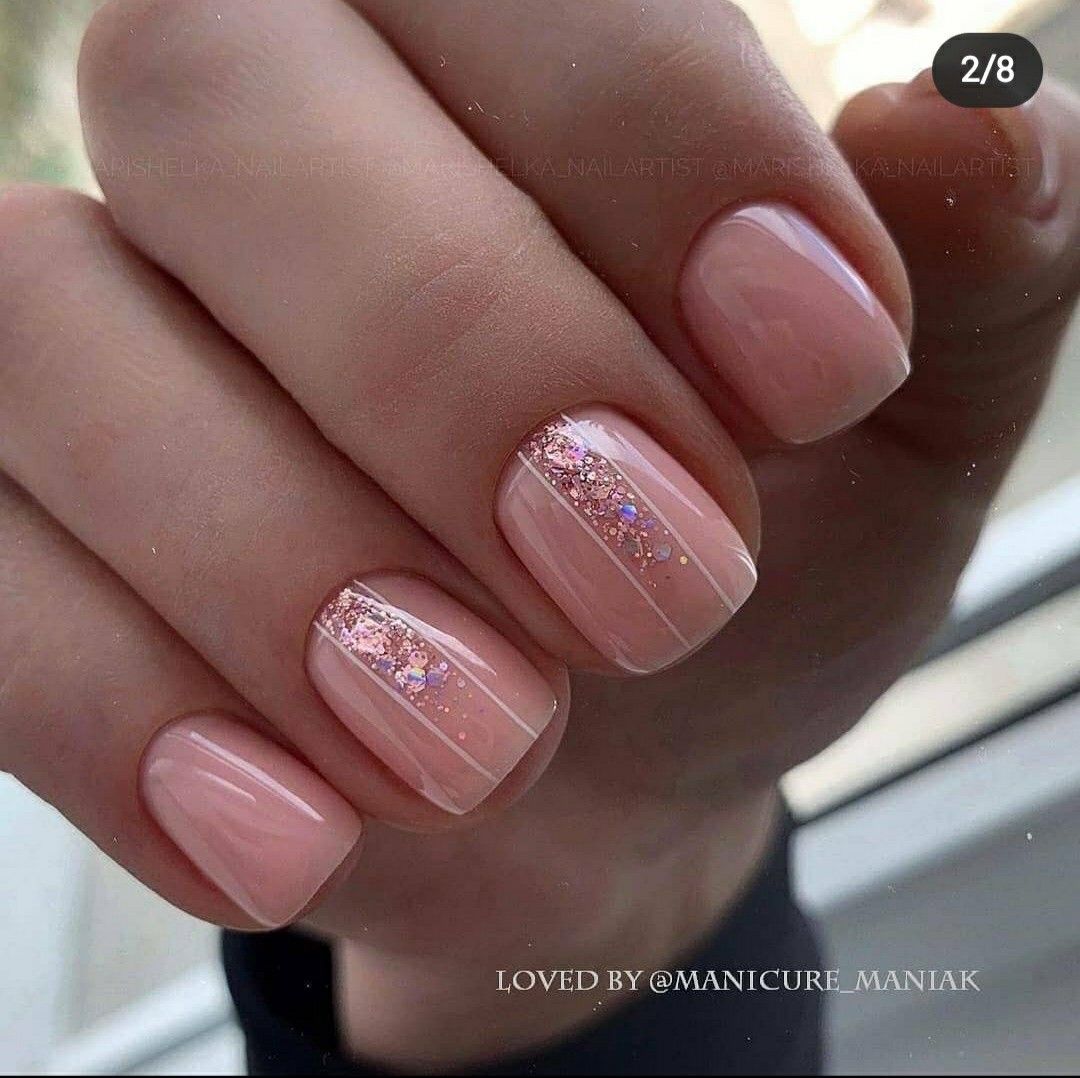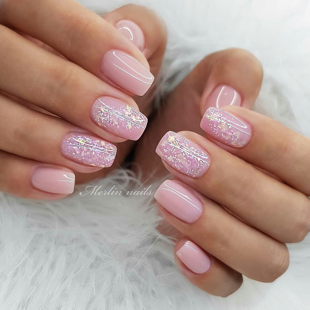Современный нейл-арт располагает огромным арсеналом самых разнообразных блесток — они отличаются по размерам, толщине и форме, консистенции (сухие и влажные). Для создания нежного маникюра рекомендуем рассмотреть дизайн с растяжкой. Сделать его довольно просто. Понадобится кисточка, лак нежного оттенка, блестки и топ. Растягивать блестящую полосу вы можете как от края пластины, так и от лунки.