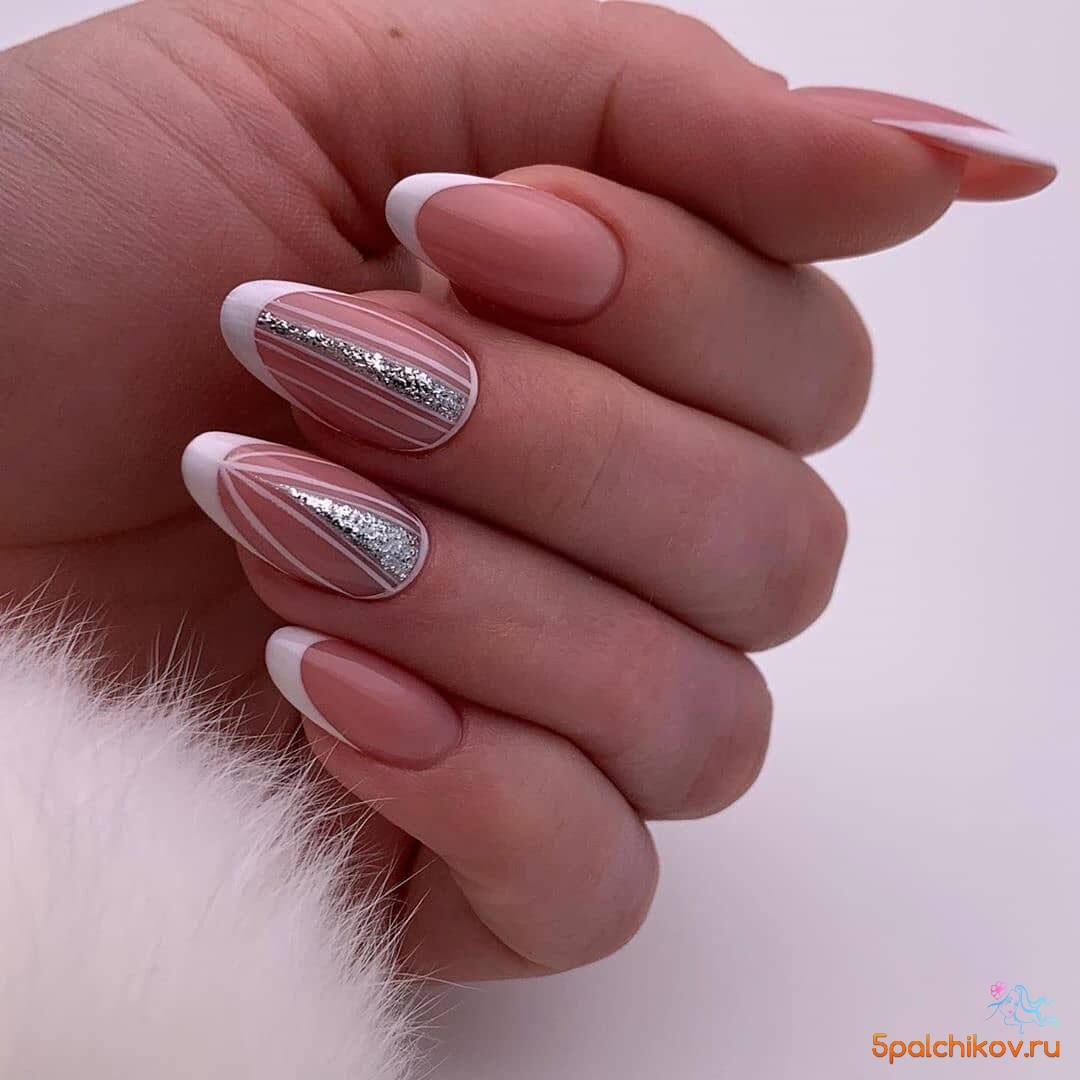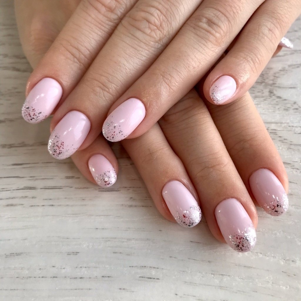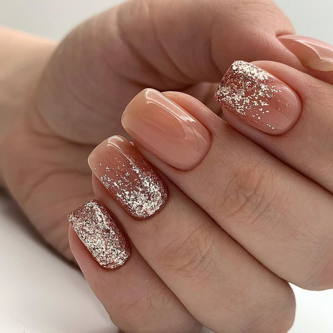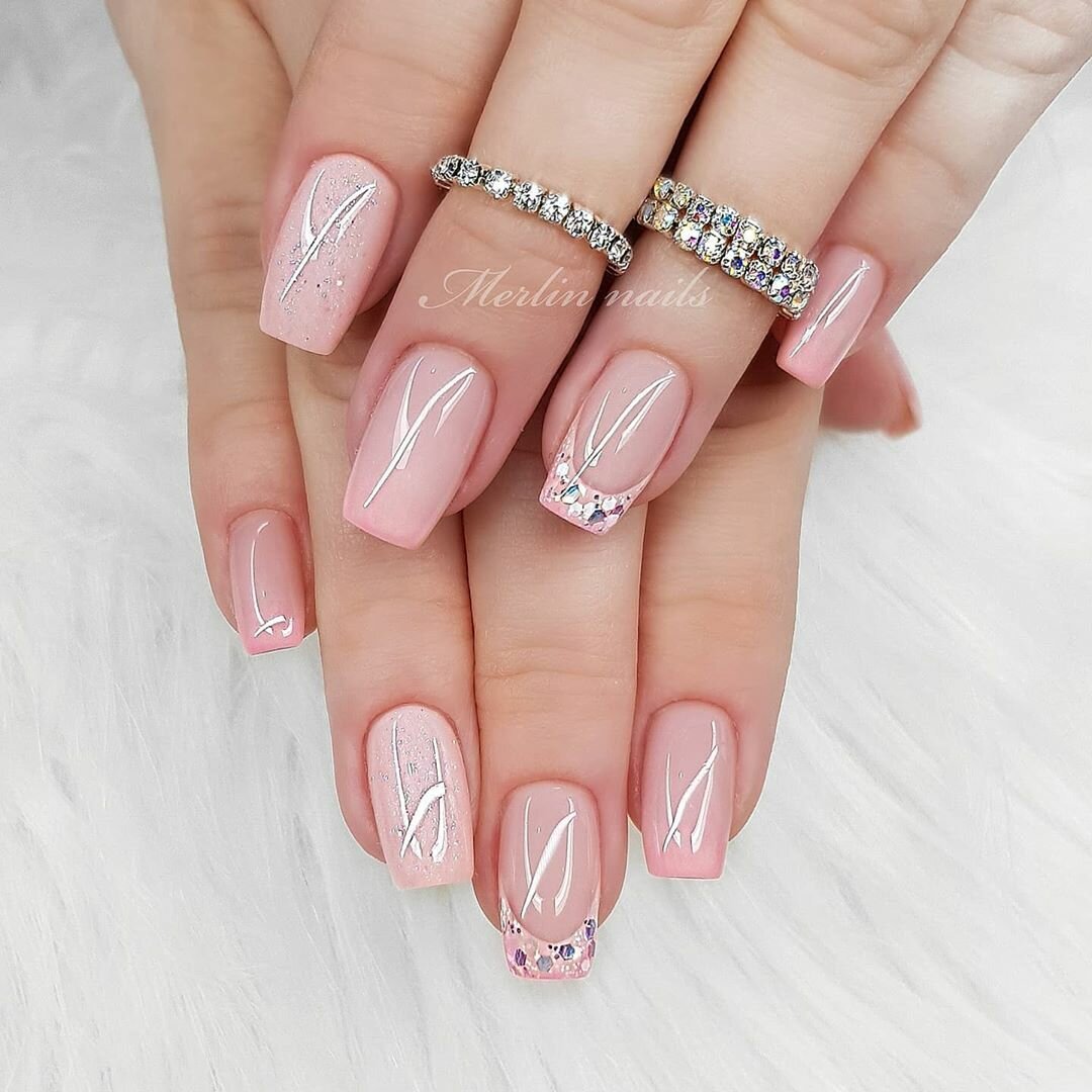 Современный нейл-арт располагает огромным арсеналом самых разнообразных блесток — они отличаются по размерам, толщине и форме, консистенции (сухие и влажные). Для создания нежного маникюра рекомендуем рассмотреть дизайн с растяжкой. Сделать его довольно просто. Понадобится кисточка, лак нежного оттенка, блестки и топ. Растягивать блестящую полосу вы можете как от края пластины, так и от лунки.