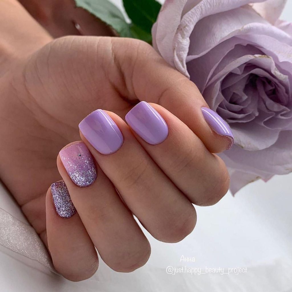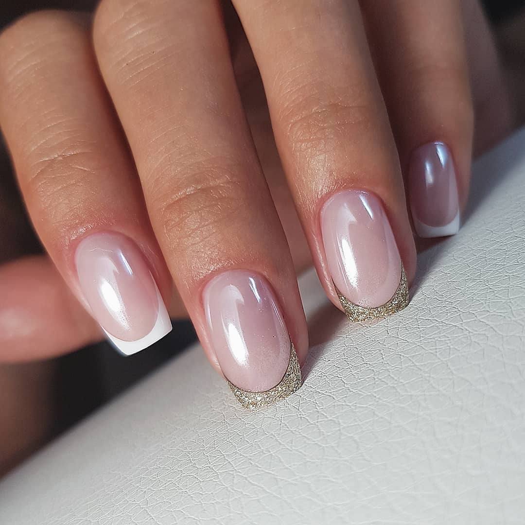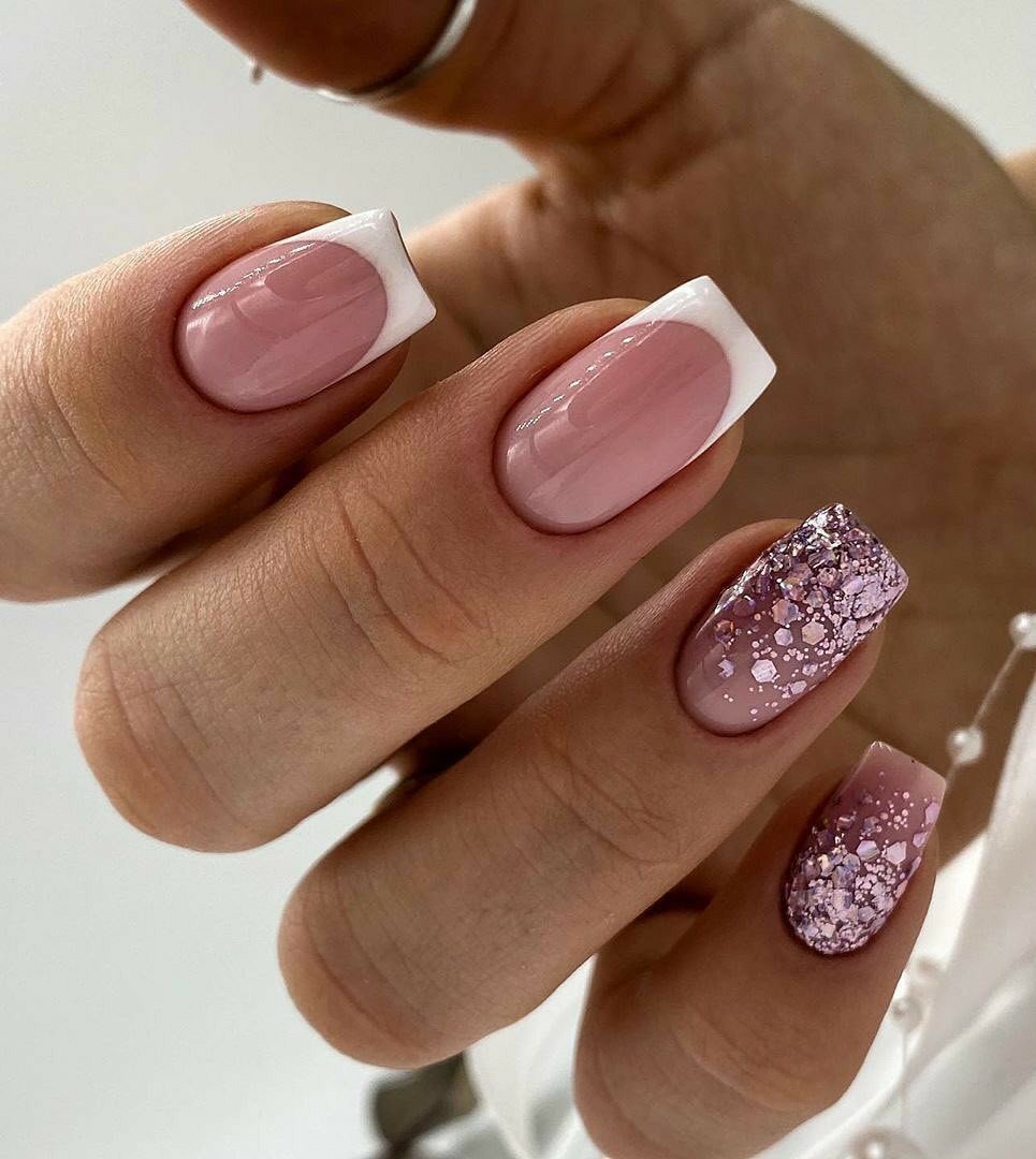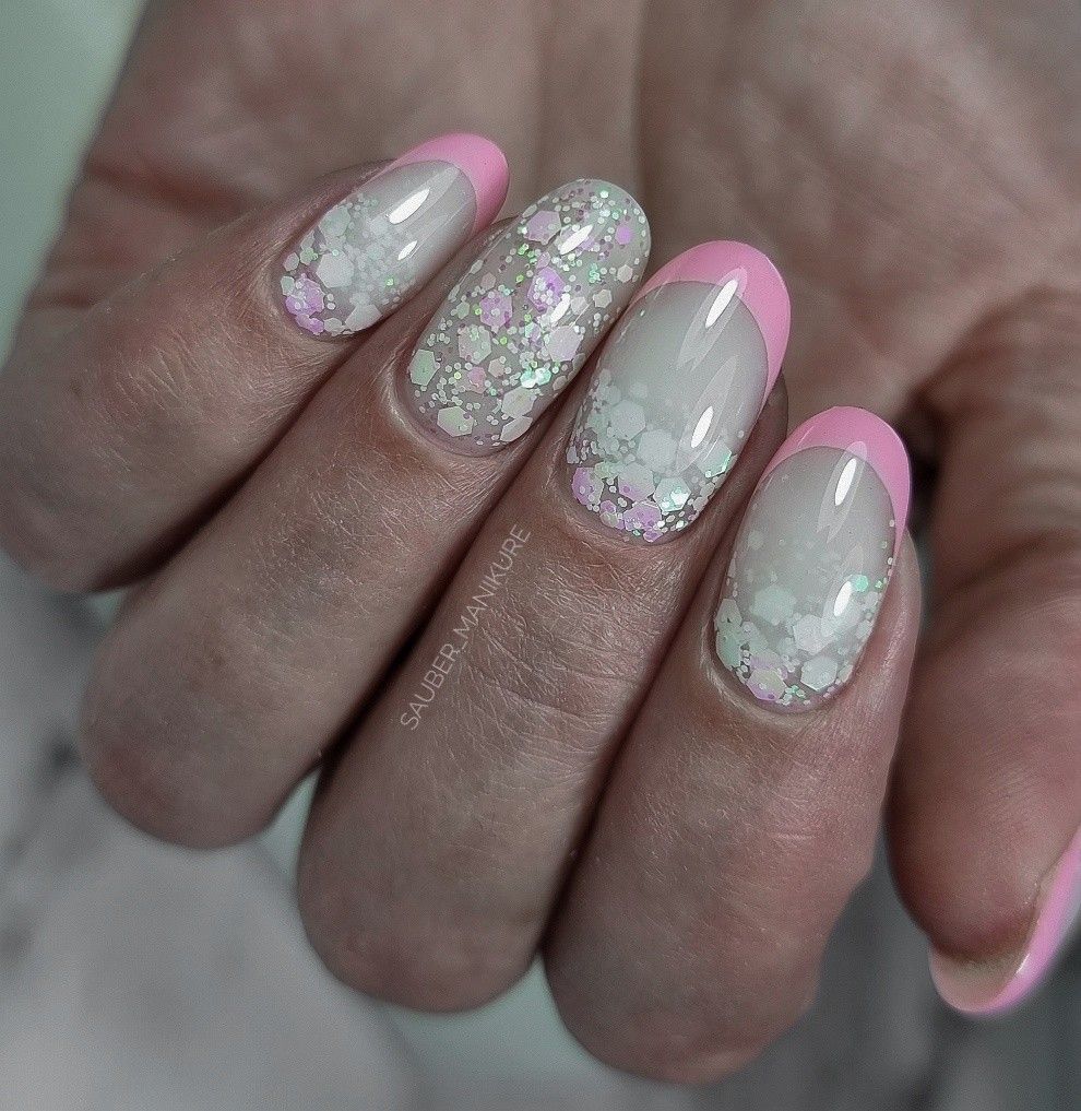 Современный нейл-арт располагает огромным арсеналом самых разнообразных блесток — они отличаются по размерам, толщине и форме, консистенции (сухие и влажные). Для создания нежного маникюра рекомендуем рассмотреть дизайн с растяжкой. Сделать его довольно просто. Понадобится кисточка, лак нежного оттенка, блестки и топ. Растягивать блестящую полосу вы можете как от края пластины, так и от лунки.