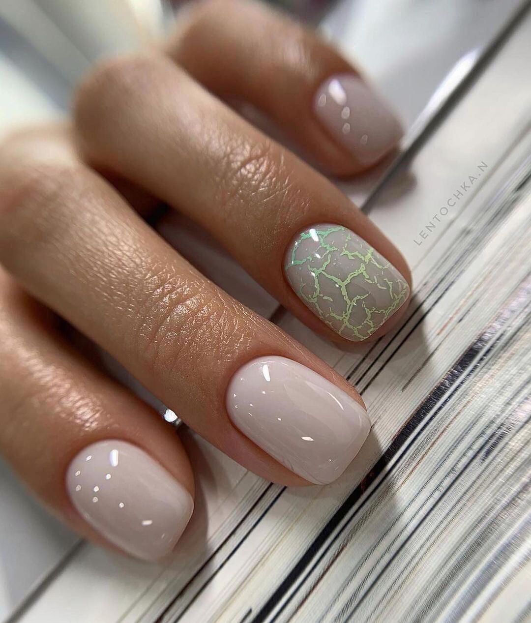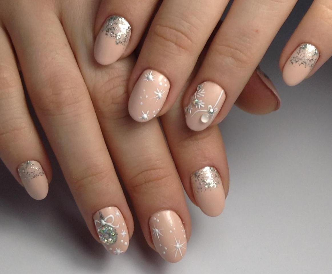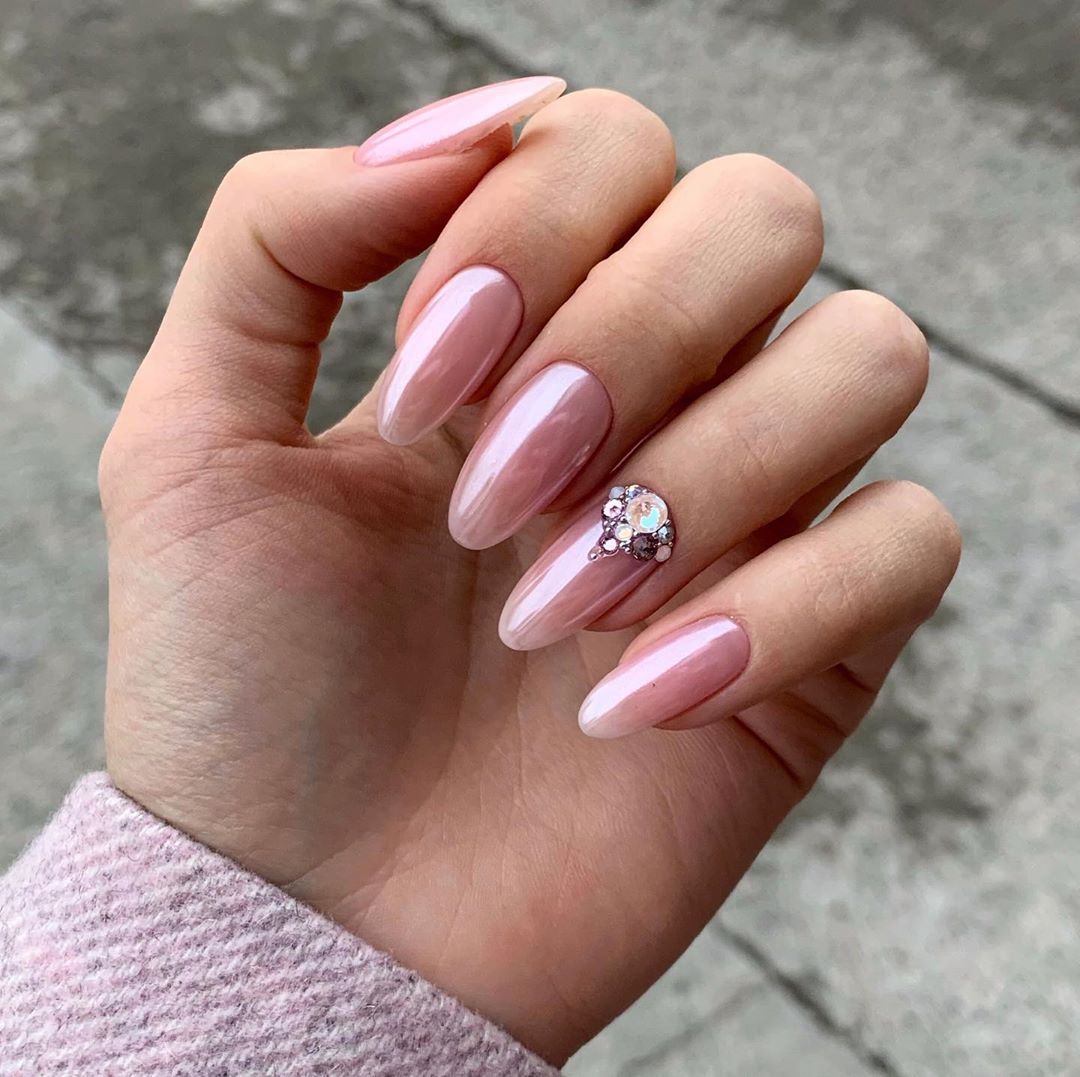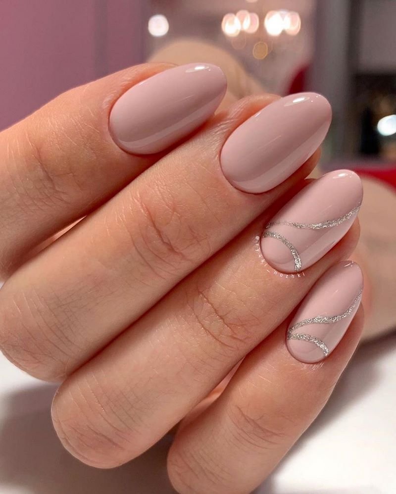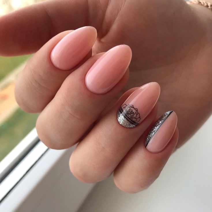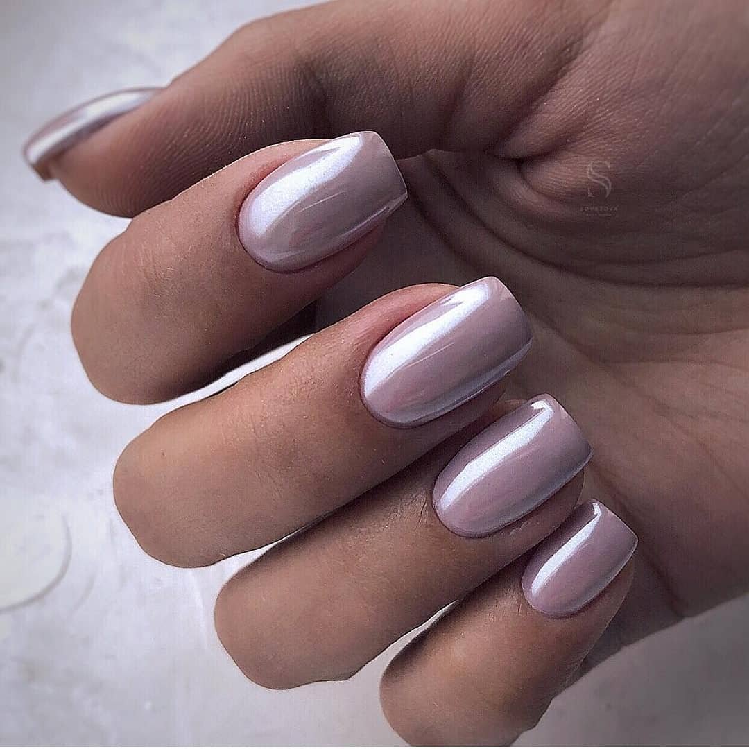Обратите внимание как нежно и женственно смотрится втирка на нюдовой или пастельной базе. Таким образом можно оформить все ногти на руке или выбрать пару акцентных.