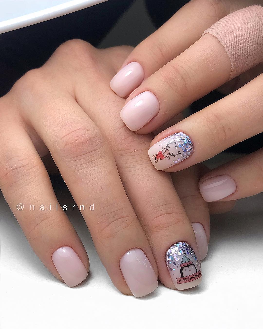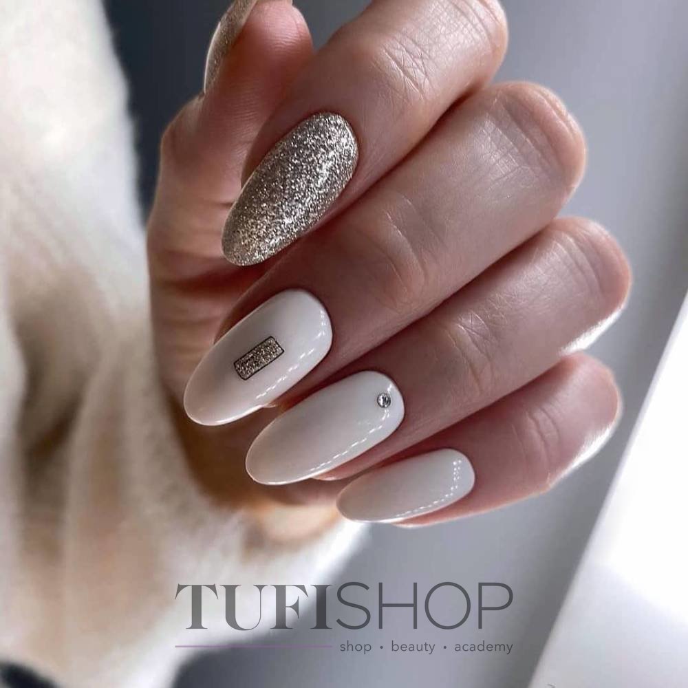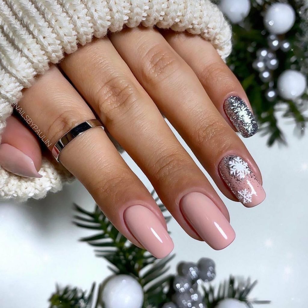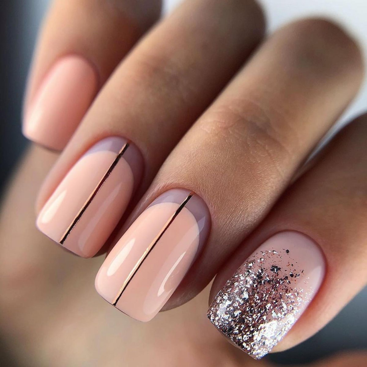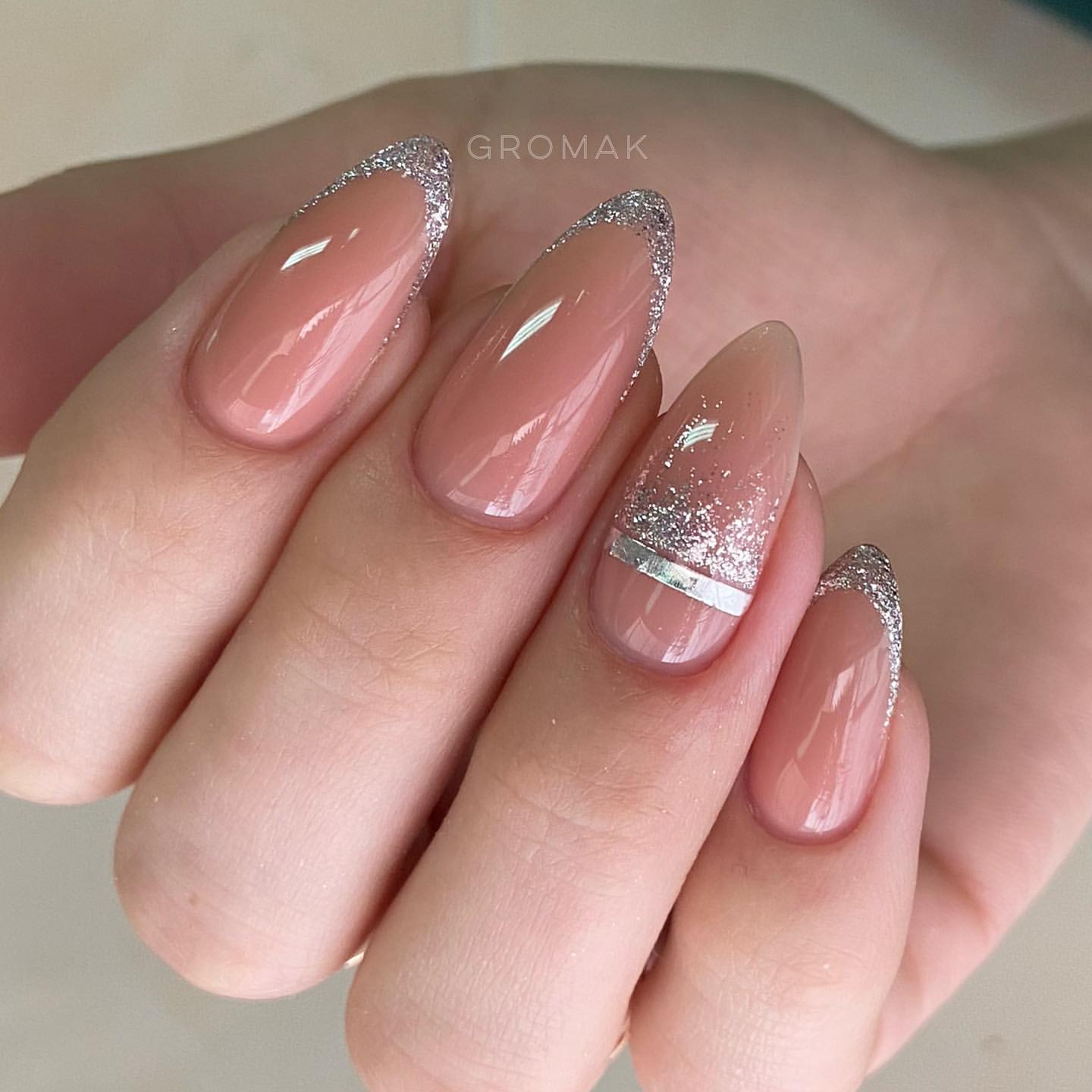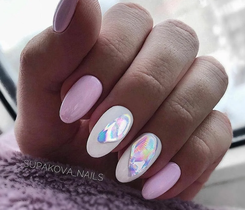 Обратите внимание как нежно и женственно смотрится втирка на нюдовой или пастельной базе. Таким образом можно оформить все ногти на руке или выбрать пару акцентных.