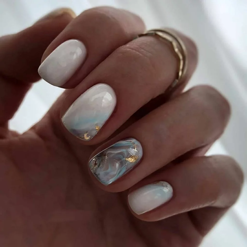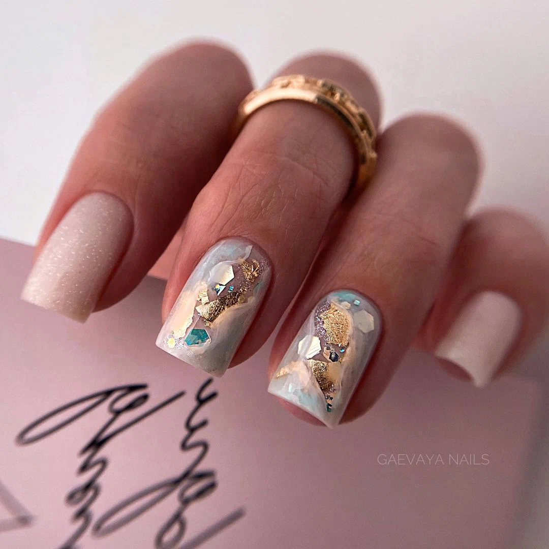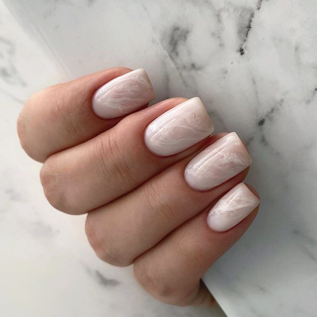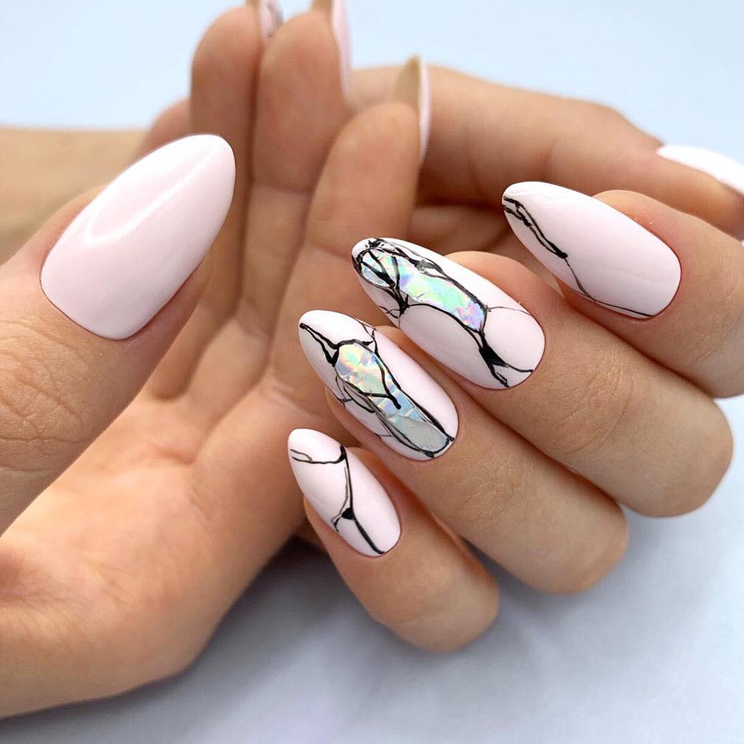 Это один из самых эффектных и стильных вариантов маникюра. Но в данном случае мы рекомендуем выбирать максимально нейтральные оттенки лаков. Важно добиться такого эффекта, чтобы ногти были похожи на кусочки стекла или льда. Для основы отлично подойдет молочный оттенок, а текстуру камня можно создать с помощью нежно-серого, белого, мятного, золотого или серебряного.