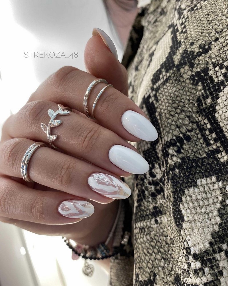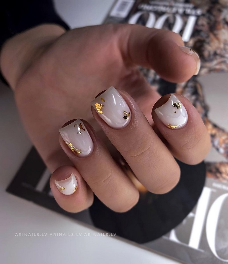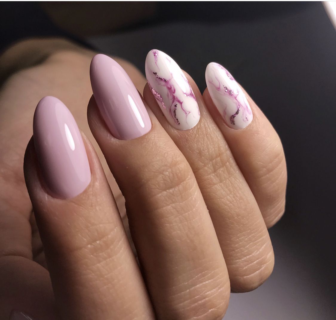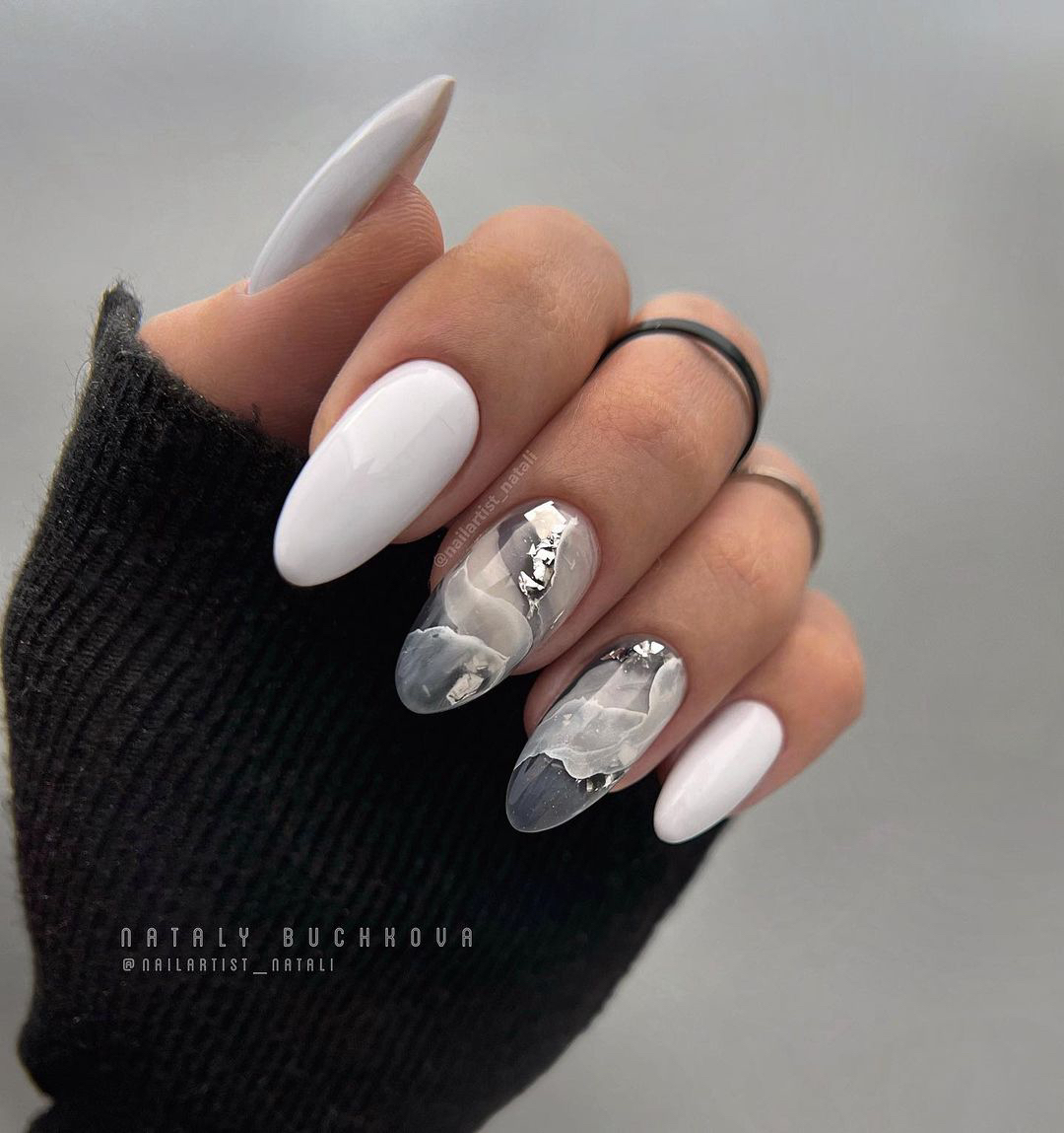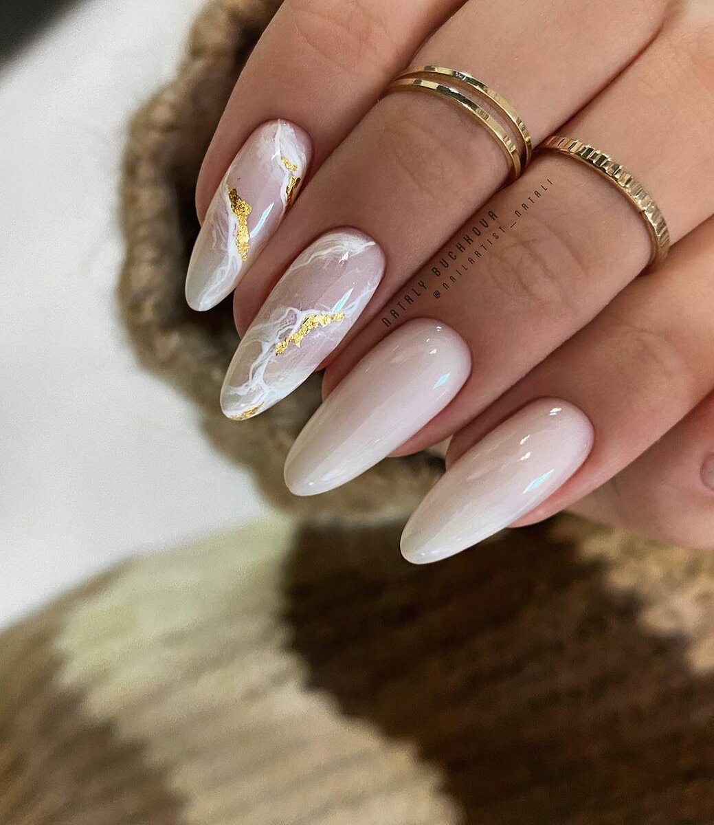 Это один из самых эффектных и стильных вариантов маникюра. Но в данном случае мы рекомендуем выбирать максимально нейтральные оттенки лаков. Важно добиться такого эффекта, чтобы ногти были похожи на кусочки стекла или льда. Для основы отлично подойдет молочный оттенок, а текстуру камня можно создать с помощью нежно-серого, белого, мятного, золотого или серебряного.