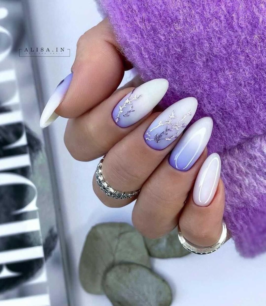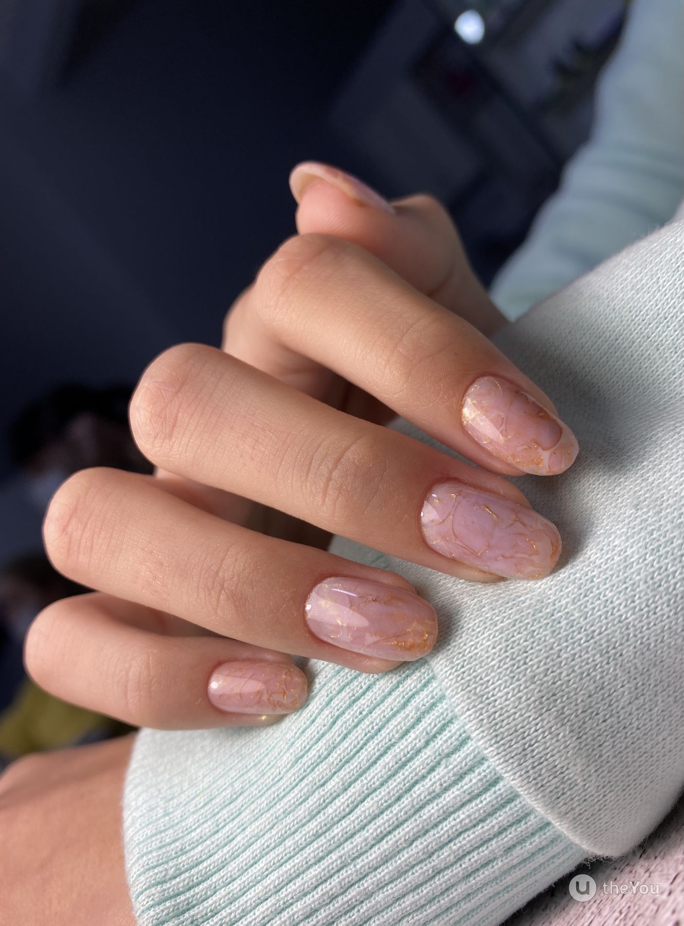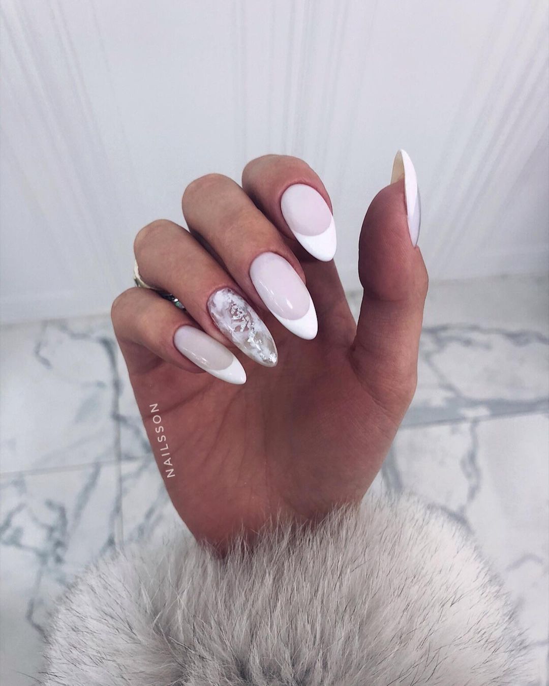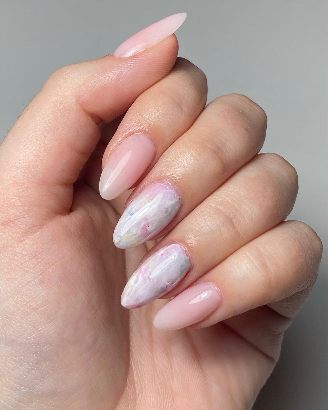 Это один из самых эффектных и стильных вариантов маникюра. Но в данном случае мы рекомендуем выбирать максимально нейтральные оттенки лаков. Важно добиться такого эффекта, чтобы ногти были похожи на кусочки стекла или льда. Для основы отлично подойдет молочный оттенок, а текстуру камня можно создать с помощью нежно-серого, белого, мятного, золотого или серебряного.