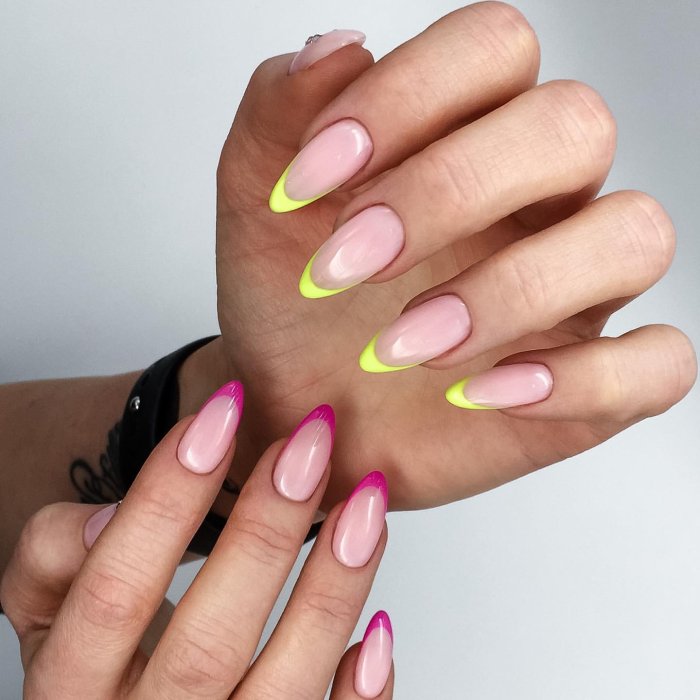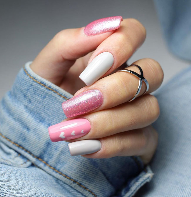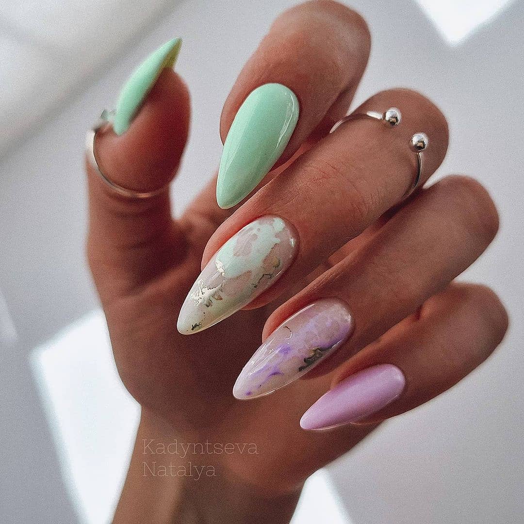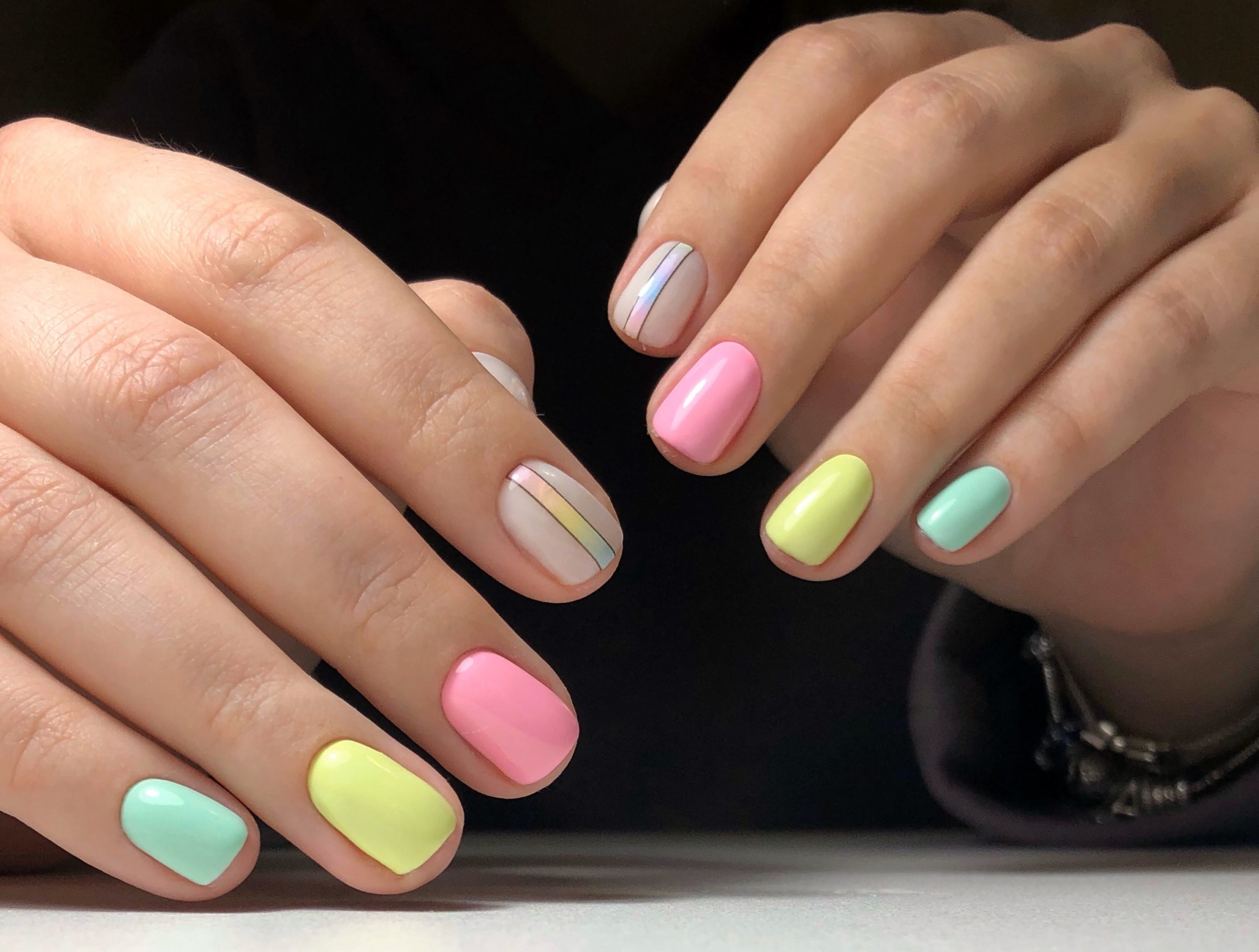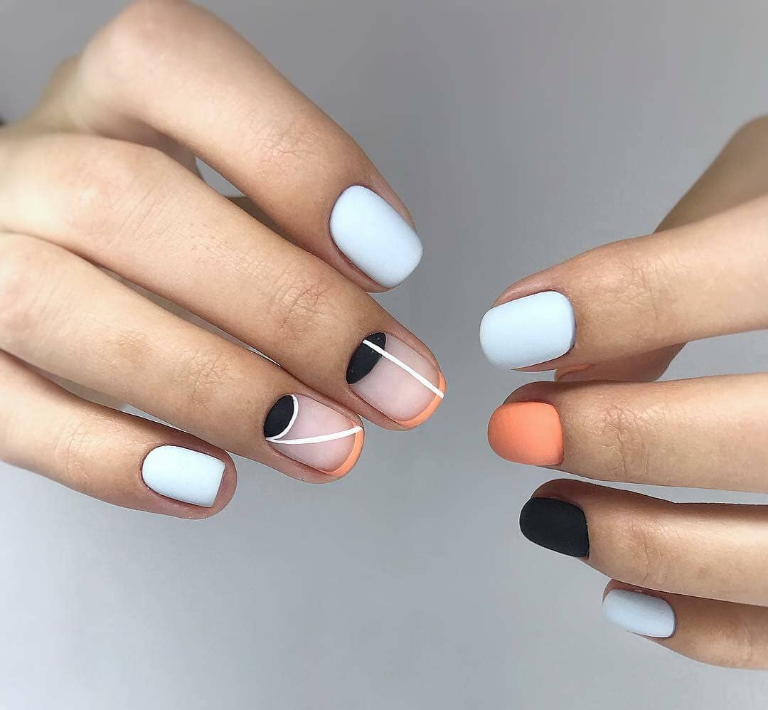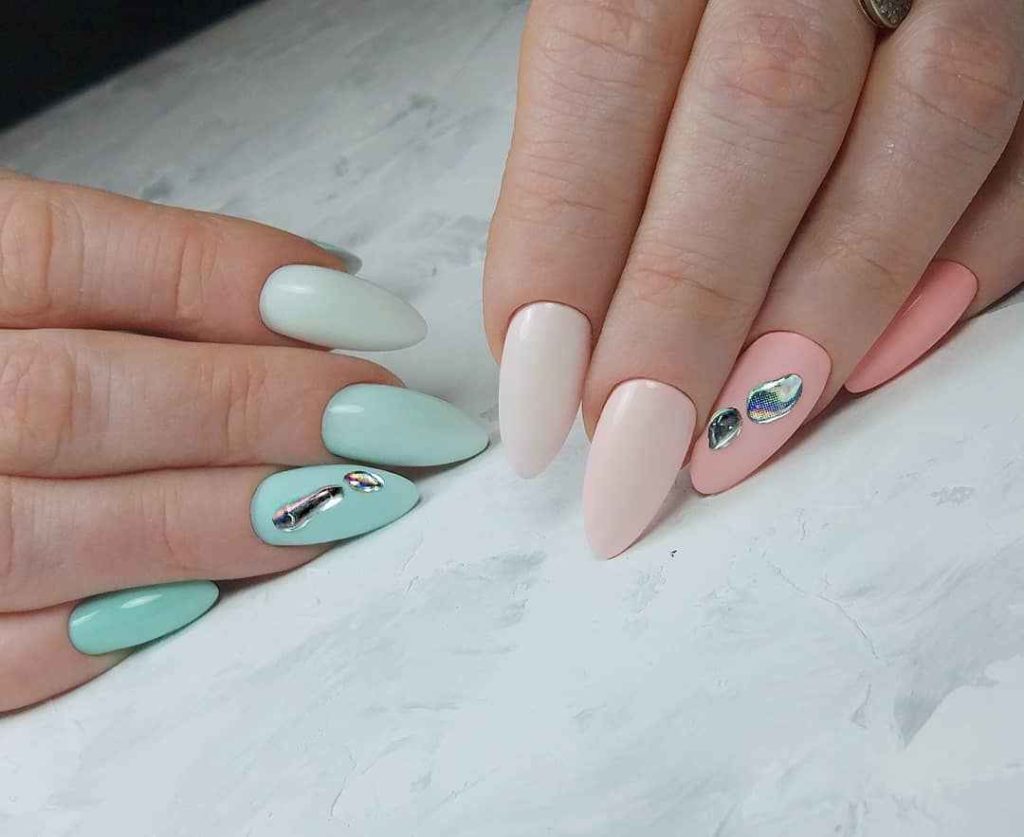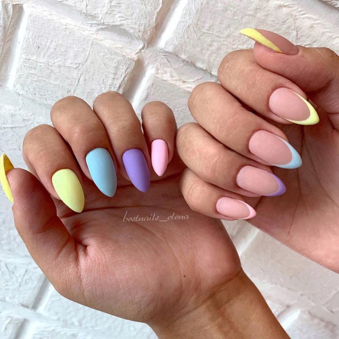Этот вид дизайна снова на пике. Модницам хочется не только женственности, но и протеста. Уместить два в одном поможет маникюр в стиле разные руки. Кстати, вы можете оформить одну руку в пастельном цвете, а другую в ярком. Вариантов масса, просто проявите фантазию.