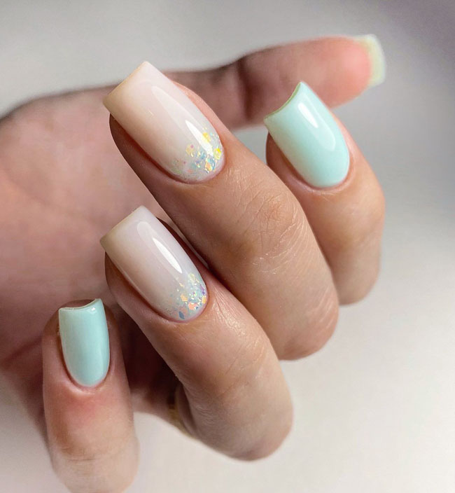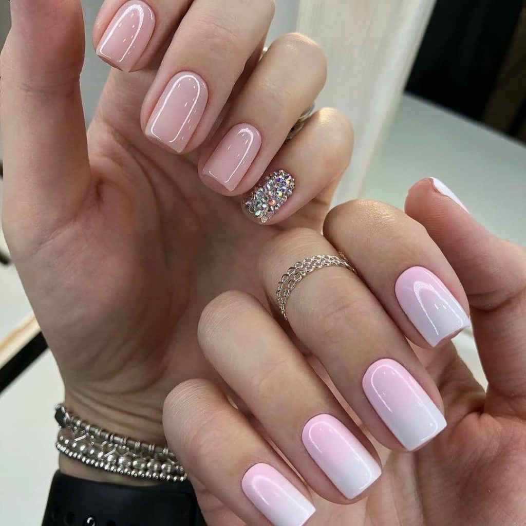 Для создания нежного омбре выбирайте нюдовые и пастельные оттенки. Если не знаете каким цветам отдать предпочтение, используйте молочный и любой другой. Главное, чтобы второй оттенок удачно вписывался в ваш повседневный или праздничный образ.