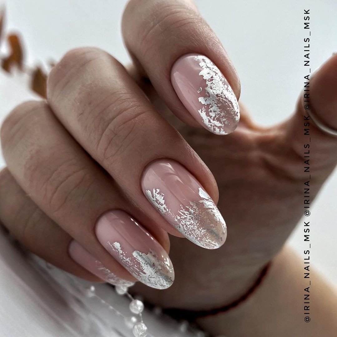 Дизайн со столь необычным названием отлично смотрится на нюдовой или пастельной базе. В чем его особенность? Для начала мастер располагает на пластине фольгированный рисунок. Как правило это бесформенная капелька. А затем покрывает его глянцевым топом. Вместе эти два материала создают эффект расплавленного металла.