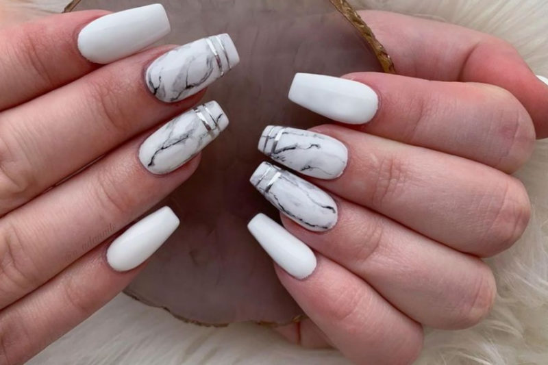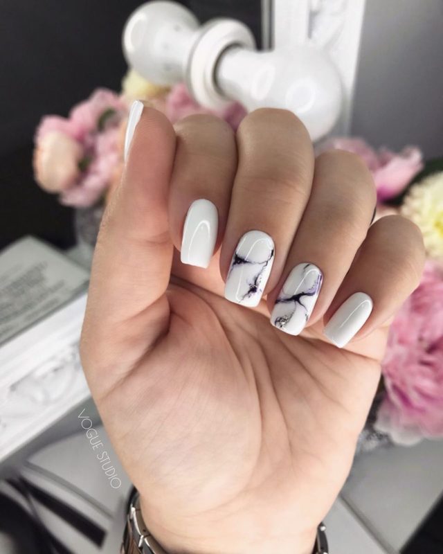 Особое внимание рекомендуется уделить мраморному декору ногтей. Это вариант, который выглядит максимально естественно, ведь он повторяет природную текстуру камня. Для офиса выбирают приглушенные оттенки — серый, черный, шоколад. Для выделения каменных прожилок можно использовать глиттер или блестки. Но не увлекайтесь. Мрамор для офиса может быть на всех ноготках или только одном-двух.