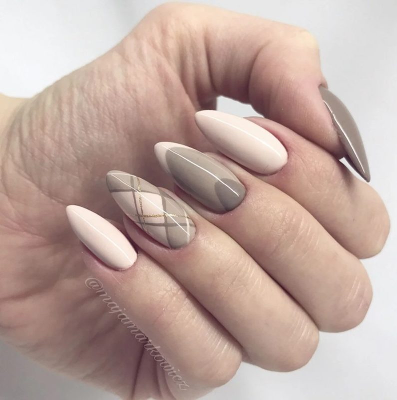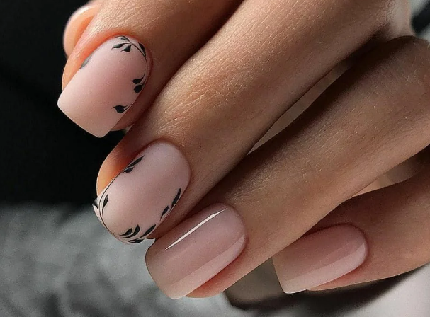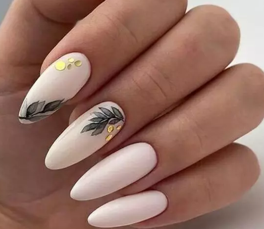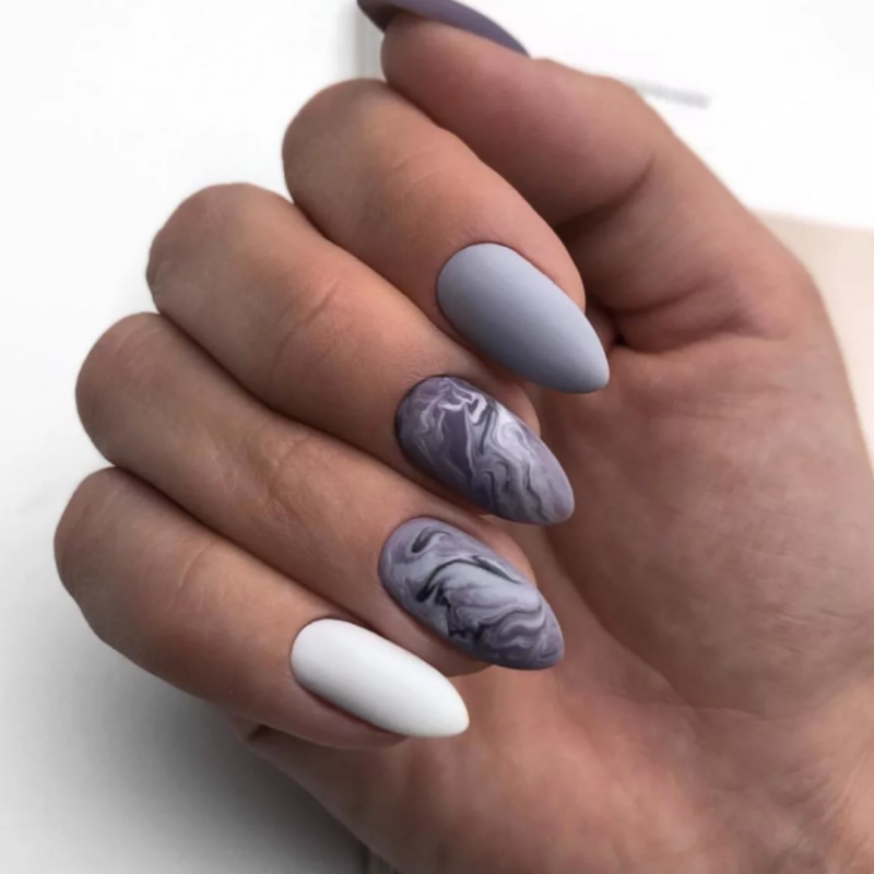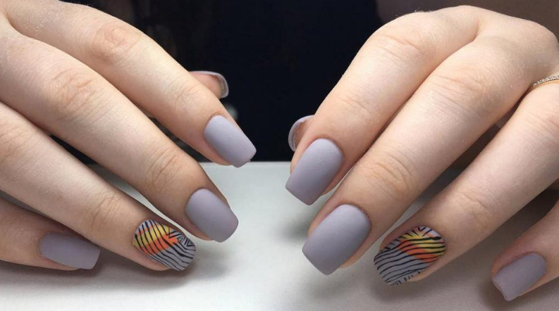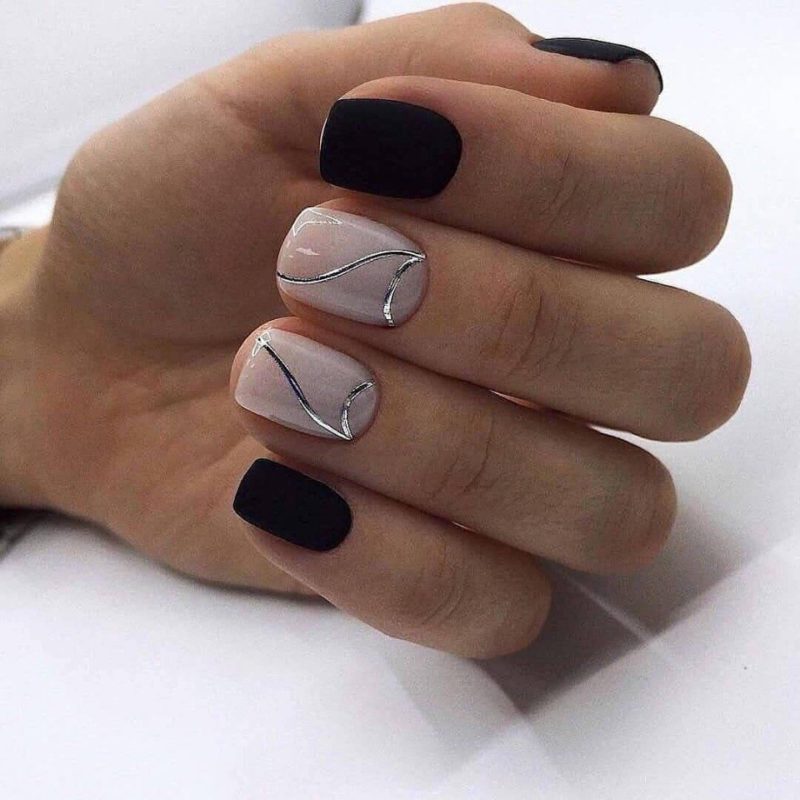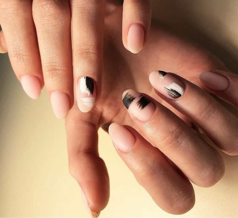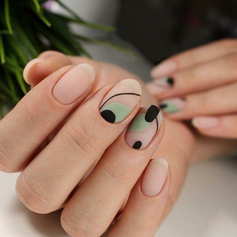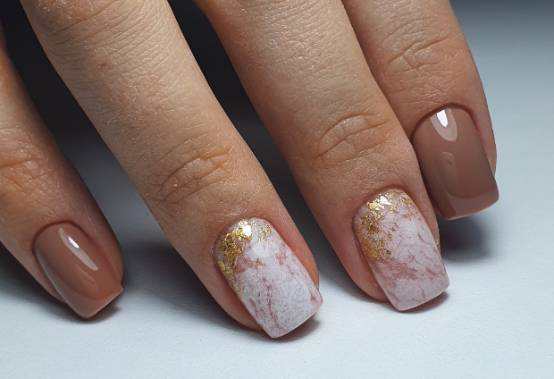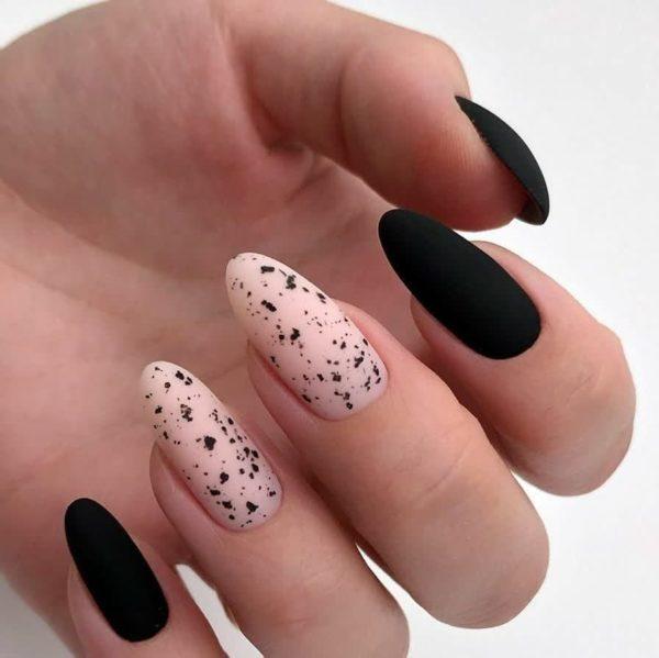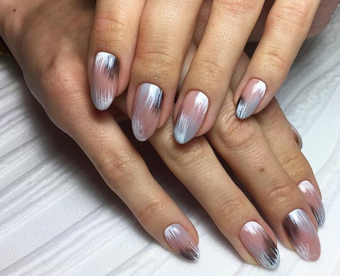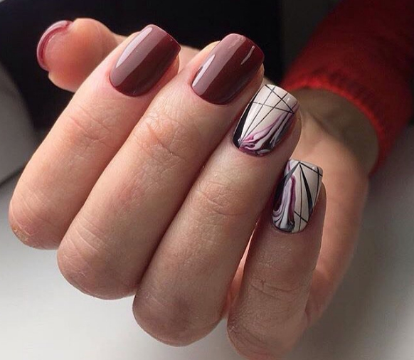 Интересный вариант дизайна, который отлично подходит для офиса. Как правило, основой выступает оттенок лака, который очень вписывается в деловой стиль — серый. Бежевый, коричневый, приглушенный мятный или розовый. На основе располагаются черные или коричневые пятна разной формы неправильного размера.