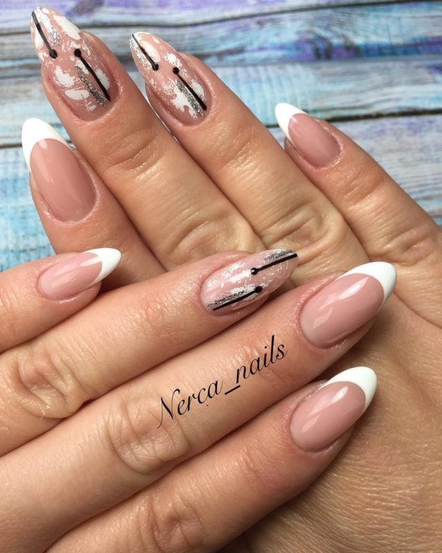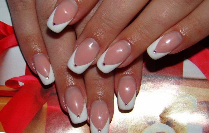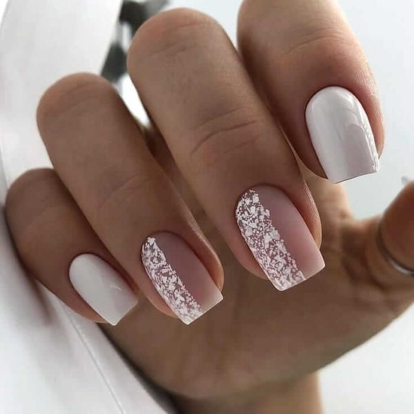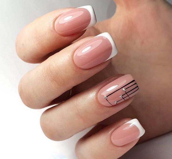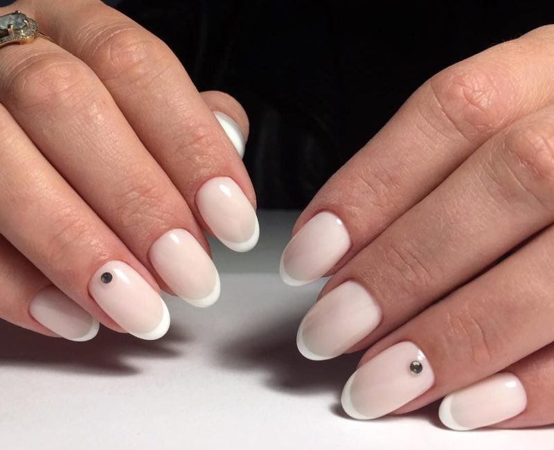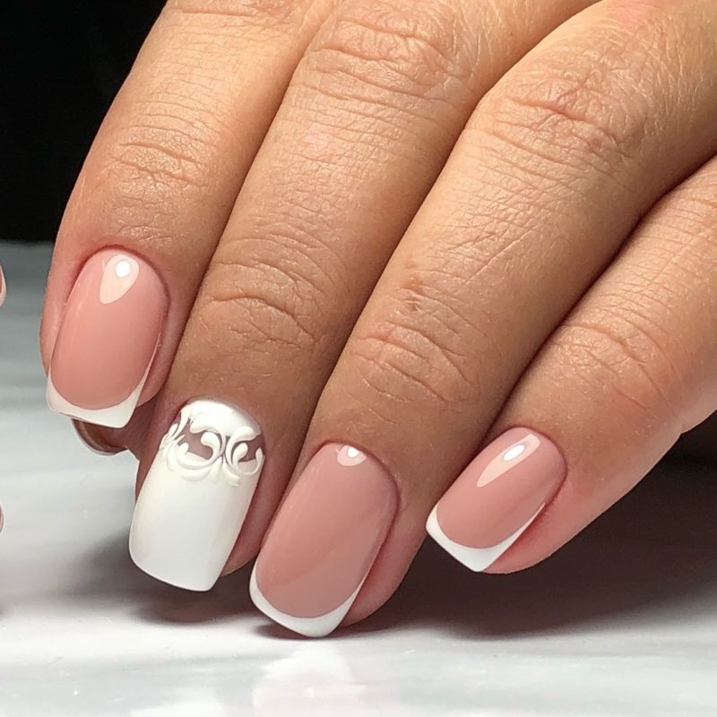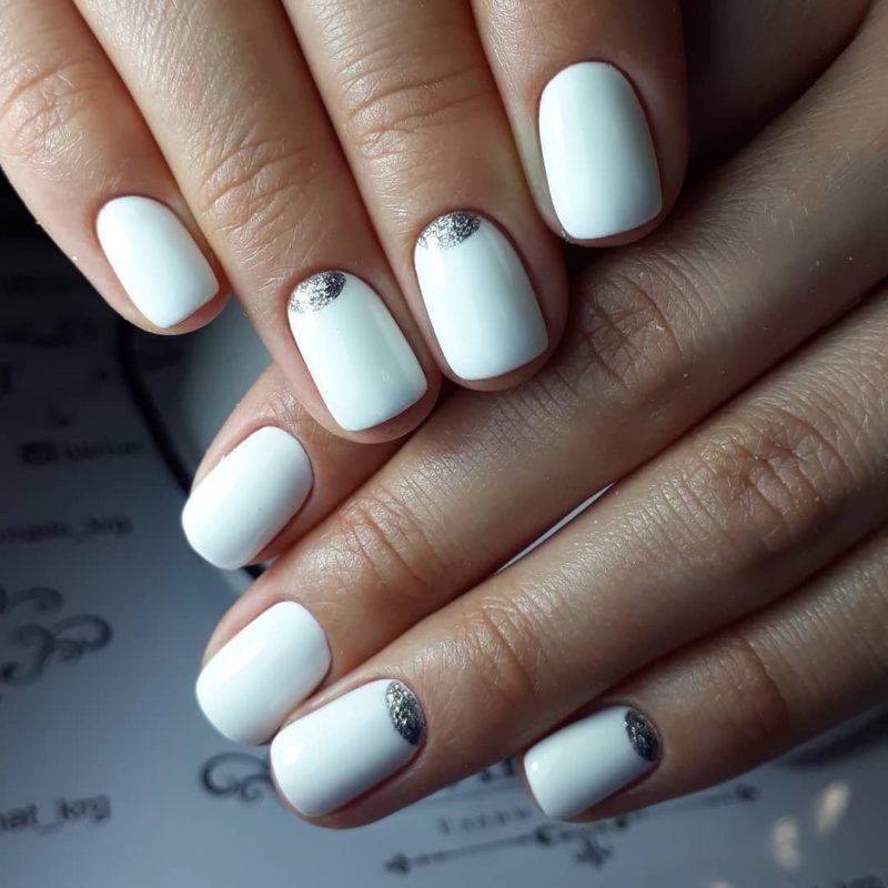 Неизменная пара к черному. Если оформить ноготки только белым лаком, выбирайте глянцевую текстуру. Один ноготь можно покрыть жемчужной втиркой. Классический френч с белой улыбкой — просто must have для офиса. Любая бизнес леди будет чувствовать себя уверенно с французским дизайном, который ближе к празднику можно дополнительно украсить и видоизменить.