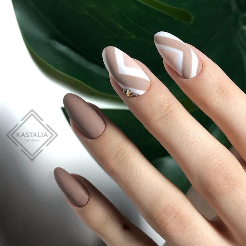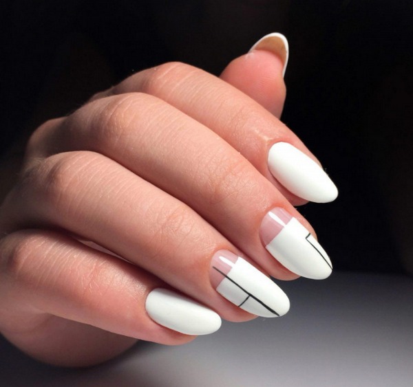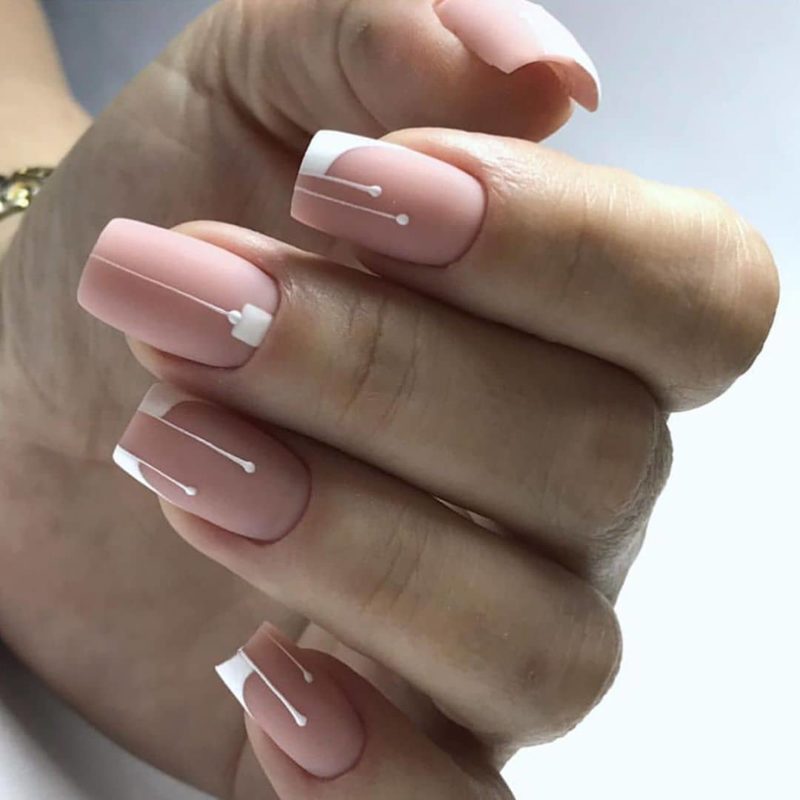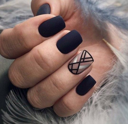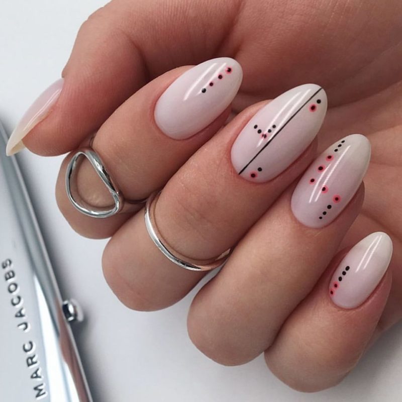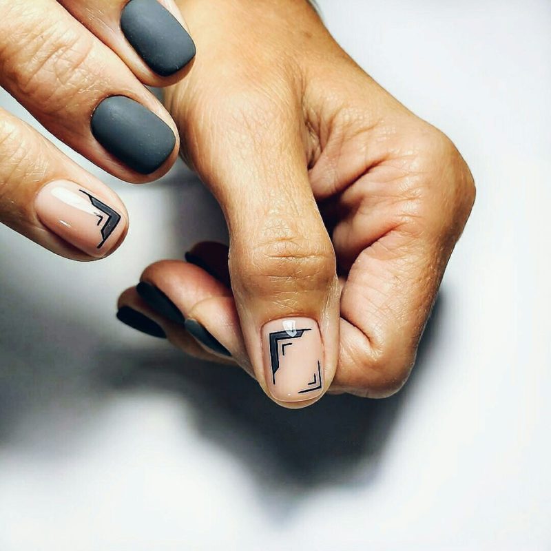 Если решаете нанести рисунок на все ноготки или украсить их стразами — это должны быть штрихи, которые больше напоминают намеки на узор. Отлично в офисе смотрится геометрический дизайн.