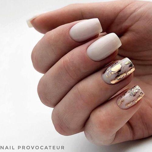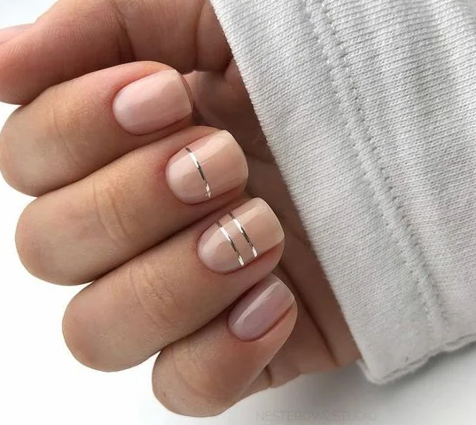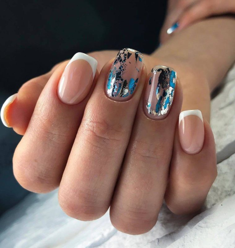 Современный маникюр просто немыслим без дополнительного декора. Эта тенденция в полной мере проявилась и в деловом стиле. И если блестки и стразы не всегда уместны в офисе, добавить яркий акцент может фольга. Это удобный материал, который можно наносить штрихами или мазками. Выглядит сдержанно, стильно и элегантно.
