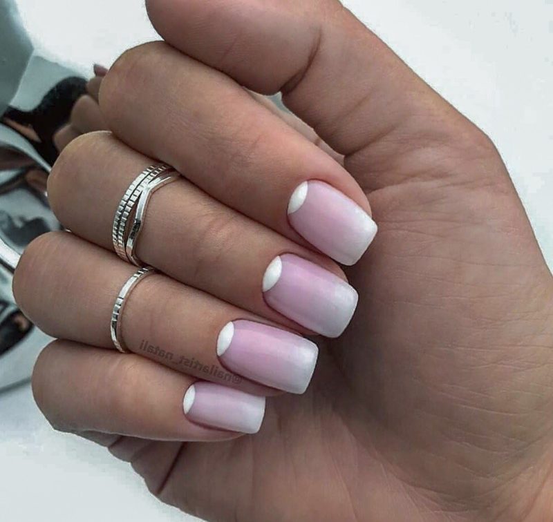 Омбре давно и прочно занимает лидирующие позиции в дизайне ногтей. Для офиса стоит выбирать плавную растяжку, а цвета должны быть из нежной палитры. Таким образом можно оформить френч. Если хочется, омбре можно дополнить декором, но он должен быть ненавязчивым и спокойным.