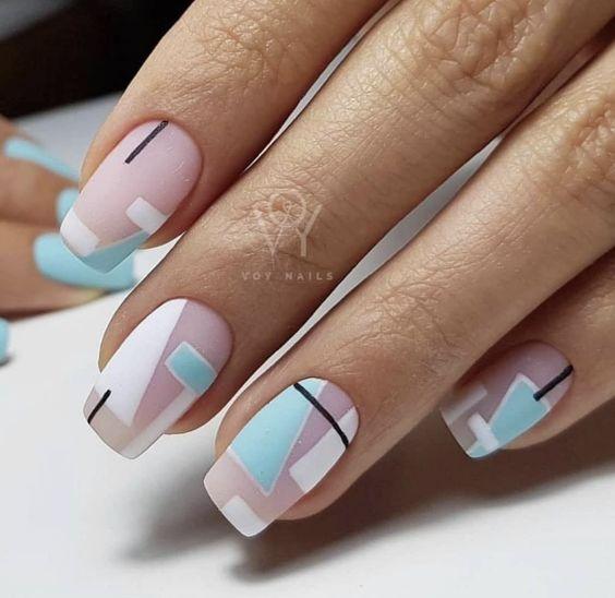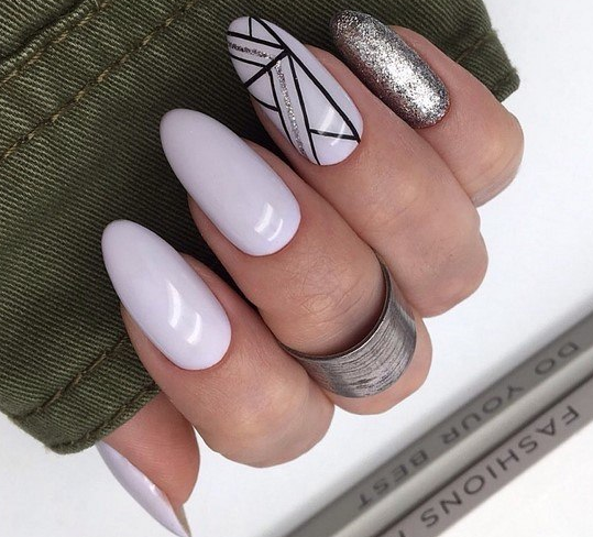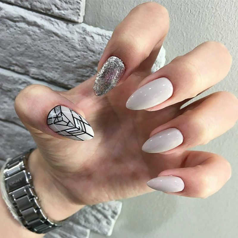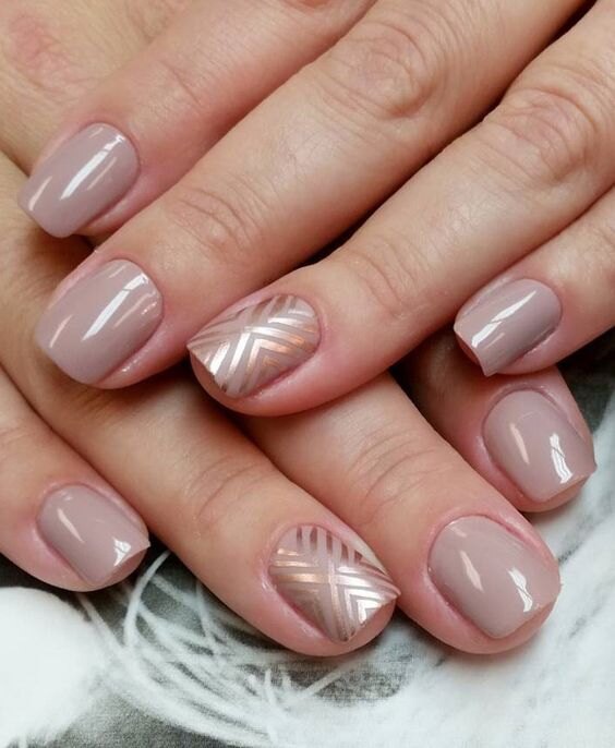 Геометрический узоры на платине, окрашенной в спокойные тона — отличное решение для офиса. Для выделения зон можно использовать фольгированные полоски на клеевой основе. Для закрашивания треугольников, квадратиков и кружочков лучше выбирать лаки, близкие с базовым.